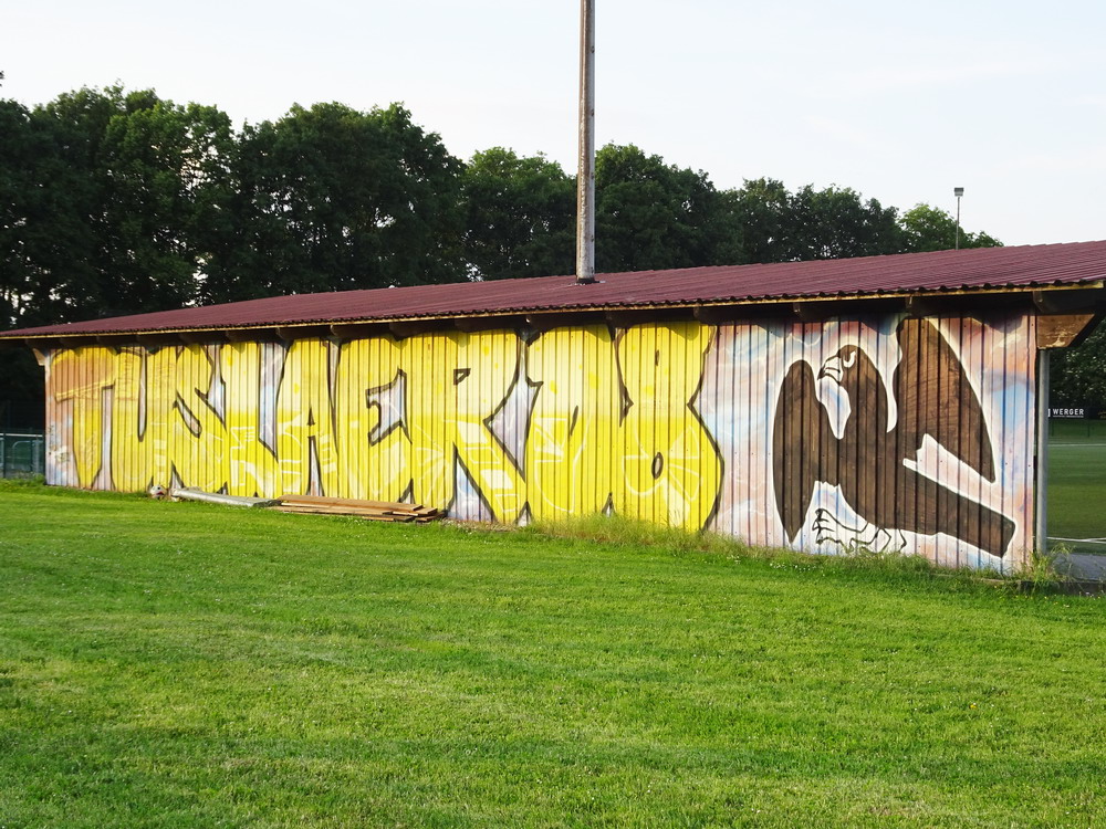 Tage mit durchgängig schönem Wetter sind derzeit rar gesät, daher wurde die Chance ergriffen und vom Arbeitsplatz im Westmünsterland nach Feierabend nicht der Weg nach Hause, sondern ins nicht allzu weit entfernte Örtchen Laer zum Steinfurter Kreispokal-Finale eingeschlagen. Auf der beschaulichen Sportanlage mit einer mehrstufigen, begrünten Geraden bat der örtliche A-Ligist den Oberligisten aus Rheine zum Tanz. Die Reserve der Gastgeber hatte eine Miniatur-Choreografie vorbereitet und unterstützte die ‚Erste‘ sporadisch auch akustisch. Normalerweise war eine klare Sache zu erwarten und die Gäste wurden der Favoritenrolle in Sachen Spielanteilen und Überlegenheit auch gerecht. Während Angriff auf Angriff in Richtung des Laerer Tores rollte, warfen sich die Gastgeber kampfeslustig in die Abwehrschlacht und verteidigten mit allen Körperteilen als gäbe es keinen Morgen mehr. Gerade einmal zwei zu Ende gespielte Angriffe brachte der TuS selbst auf die Beine, ansonsten fand das Geschehen beinahe ausschließlich in der eigenen Platzhälfte statt. Erst in der Schlussviertelstunde knackte der vier Ebenen höher spielende und damit haushohe Favorit den Abwehrriegel. In der Schlussphase schraubte die Eintracht das Ergebnis dann noch in sichere Höhe.