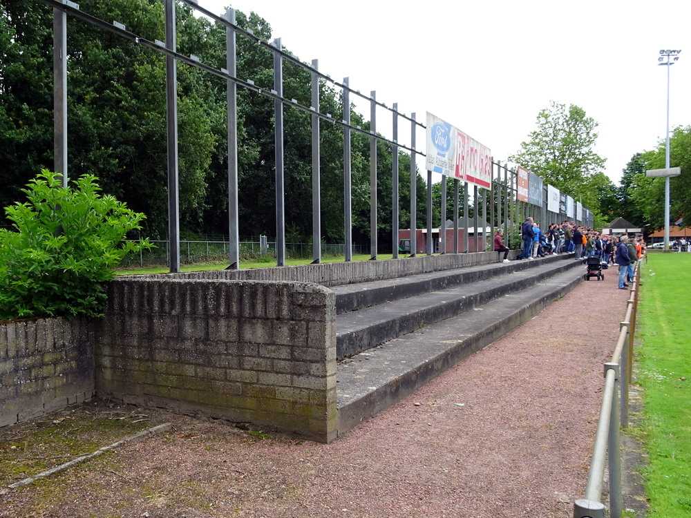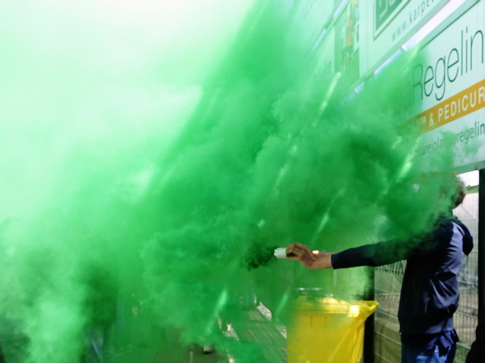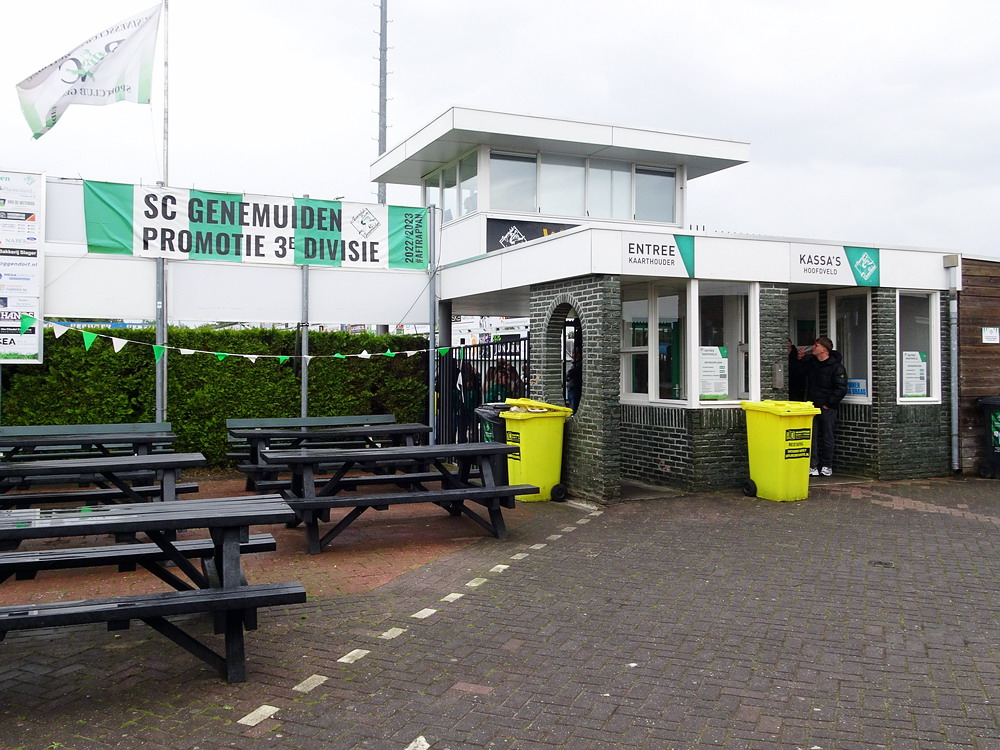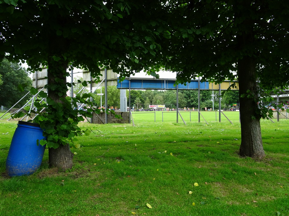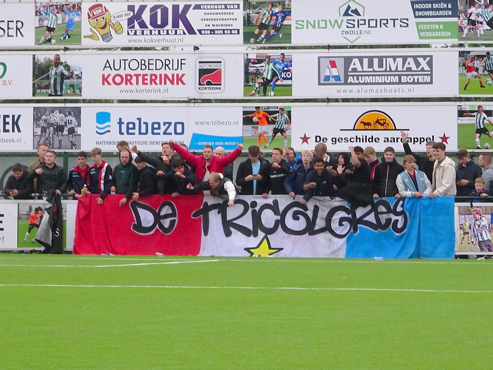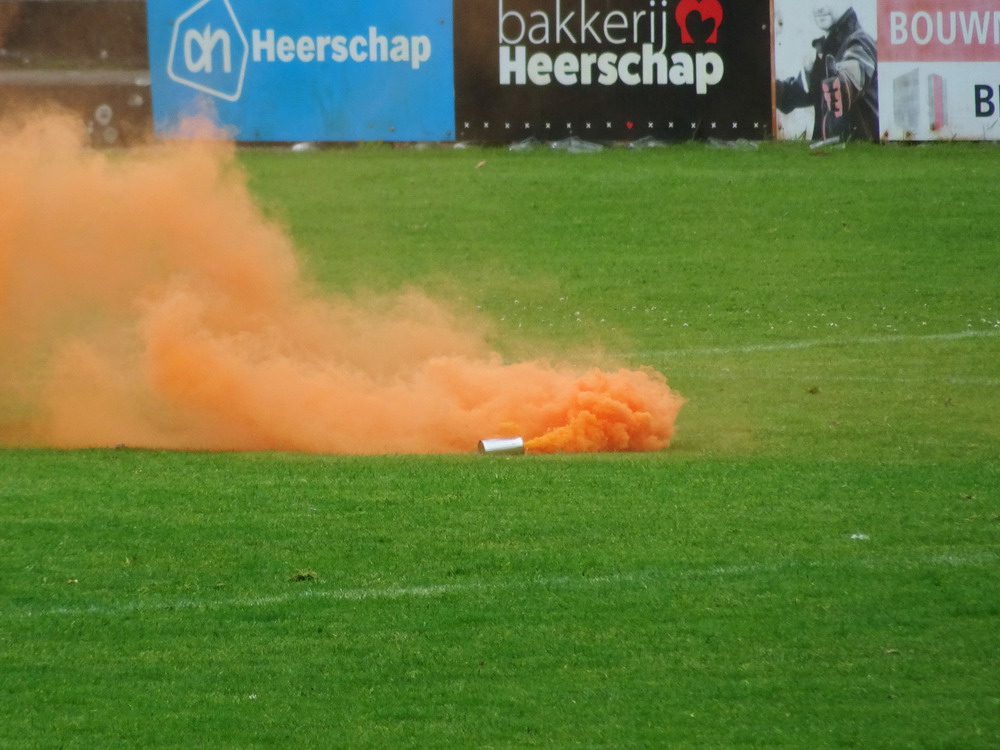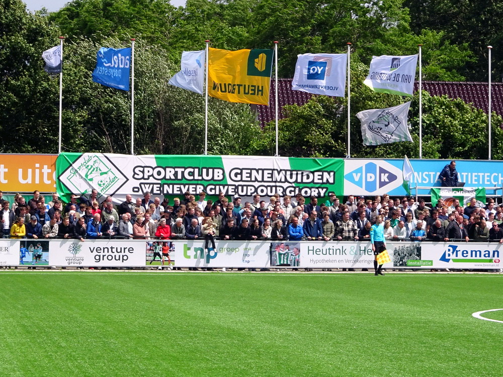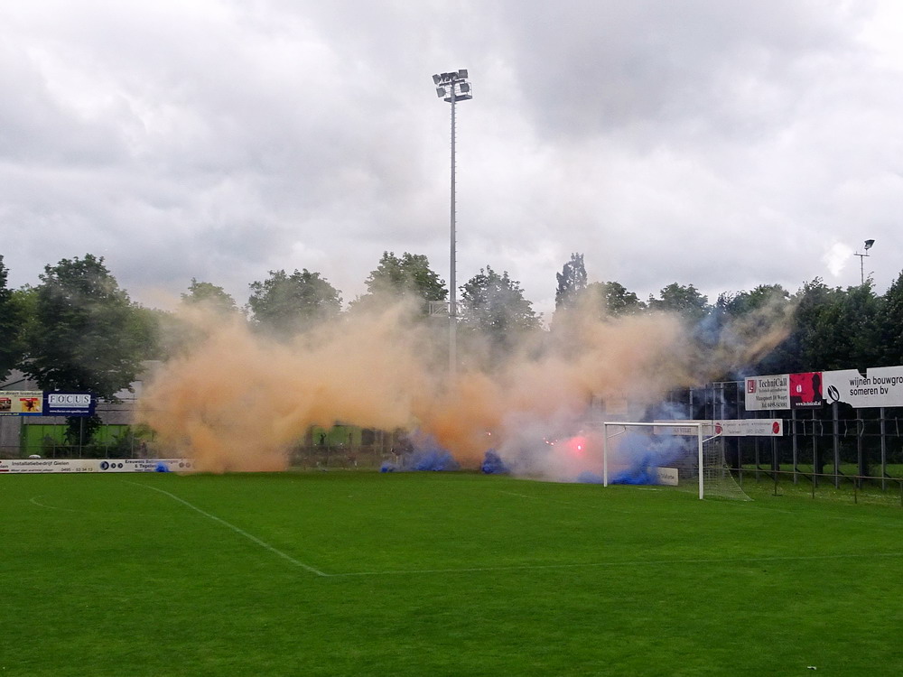 Um einen freien Startplatz in der dritthöchsten Spielklasse des Landes wurde in Genemuiden gestritten. Die Gäste hatten für dieses Spiel die ungleich bessere Ausgangslage, denn es war bereits der Rückkampf der Finalserie und das Hinspiel ging mit 3:1 an Excelsior. Bei Derbys und Spielen mit entscheidendem Charakter wird in den Niederlanden mit an Sicherheit grenzender Wahrscheinlichkeit mit pyrotechnischen Erzeugnissen nicht gegeizt. Manches Mal ist es aber nicht ganz einfach auszuloten, an welcher Stelle oder auch mehreren Stellen der Krempel in die Luft geblasen wird, da man oft keinen wirklichen Fanblock ausmachen kann. Ich war mich sicher, bei diesem Spiel würde es auf der Gegenseite der Fall sein und platzierte mich neben der Sitztribüne der etwas schmucklosen, mit Werbetafeln zugepflasterten Anlage, nur um mich wenig später in einer grünen Rauchwolke wiederzufinden, in der man buchstäblich die Hand vor Augen nicht mehr sah. Die Gäste hatten zwar kein Pyro-Zeugs dabei, dafür aber einen aktiven zwei Dutzend Mann starken Pöbel, von denen einige Personen den Eindruck machten, bei entsprechend ungünstigem Ausgang für die eigene Mannschaft auch gerne noch eine handfeste Nachbesprechung mit den Gastgebern anzuleiern. Dieses erwies sich jedoch als unnötig. Bis in die Schlussviertelstunde war die Partie völlig ausgeglichen, wobei die Gäste allerdings auch nie den Eindruck erweckten, noch ernsthaft in Bedrängnis geraten zu können, zumal Torraumszenen absolute Seltenheit genossen. Mit dem ersten Treffer für die Jungs aus dem Rotterdamer Umland gingen die Köpfe der Gastgeber dann runter, die Körpersprache war eindeutig, was Excelsior zu zwei weiteren Toren nutzte, damit viel zu deutlich gewann, aber insgesamt wohl verdient den Aufstieg feierte.