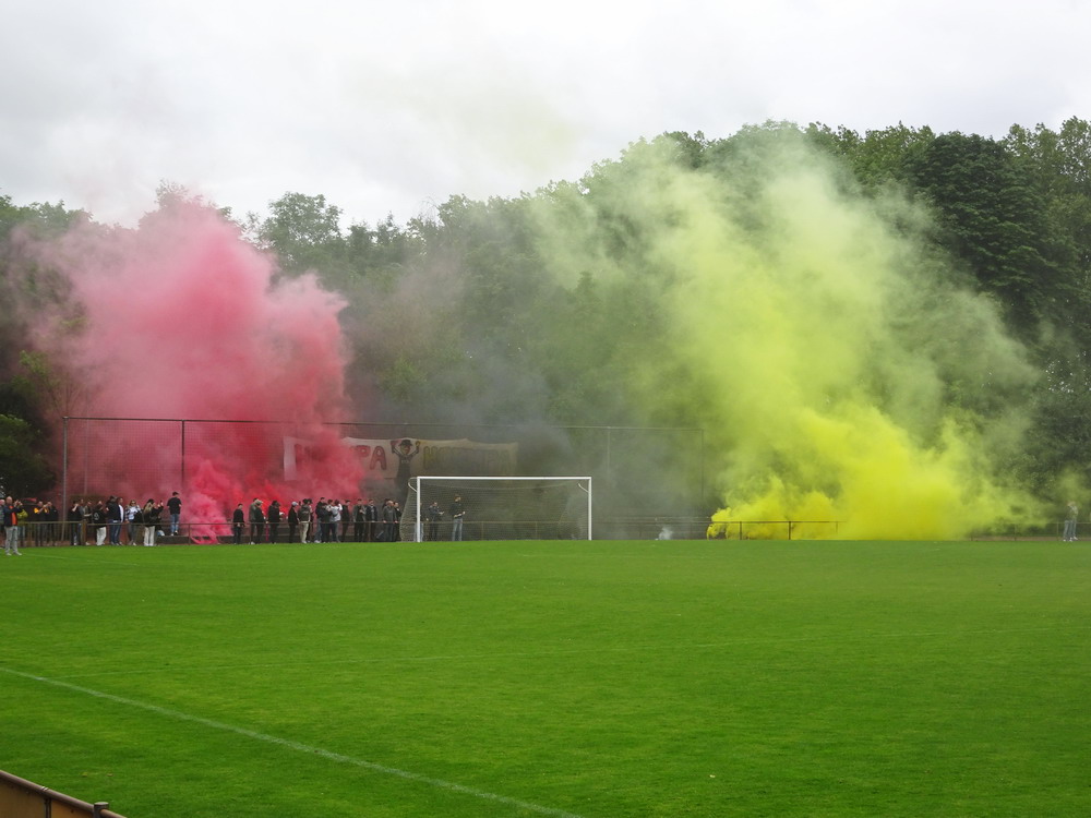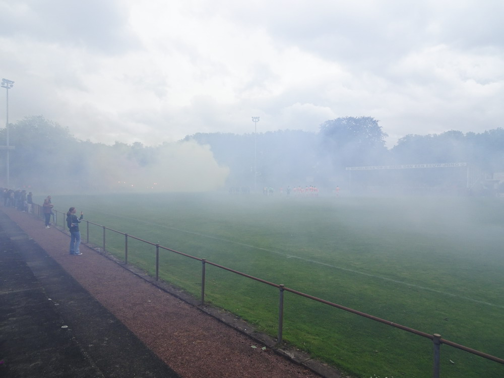 Um einen Startplatz in der Bezirksliga kämpften die beiden Kontrahenten aus Hagen und dem Bottroper Stadtteil Kirchhellen. Für beide war es schon die zweite Patrone, denn beide Teams verloren ihre Kreis-internen Entscheidungsspiele um den Aufstieg, so dass der letzte verbleibende Bezirksliga-Startplatz nun in Hin- und Rückspiel vergeben wurde. Im Hinspiel waren die Fichten schon drauf und dran, sich eine hervorragende Ausgangsposition zu erarbeiten, vollbrachten jedoch das Kunststück eine Führung von 3:1 und 4:3 noch in eine 4:6-Niederlage zu verwandeln. Aus Kirchhellen waren an die 300 Anhänger mit Bussen und Autos angereist. Der VfB-Anhang hat durchaus ein Pyromanen-Image, dem er auch heute wieder gerecht wurde und den Platz zum Intro ordentlich einnebelte. Ihr Team war auf der gut besuchten dann die klar bessere Mannschaft und dämmte etwaige Ambitionen der Zwieback-Städter direkt ein. Die frühe Gäste-Führung konnten die Nadelhölzer zwar mit dem Pausenpfiff durch einen zweifelhaften Strafstoß glücklich ausgleichen, aber im zweiten Durchgang kannte das Spiel nur eine Richtung. Die VfB-Akteure zeigten sich als ausgesprochene Forst-Experten und erkannten, wie die spröden Gastgeber zu packen waren. Spätestens mit dem dritten VfB-Treffer nach einer Stunde Spielzeit war der Baum gefällt und in der Schlussviertelstunde geriet die Veranstaltung noch zum Debakel für den TSV. Der VfB war letztlich ein hochverdienter Sieger, was die zweite Pyro-Einlage des Tages zur Folge hatte.