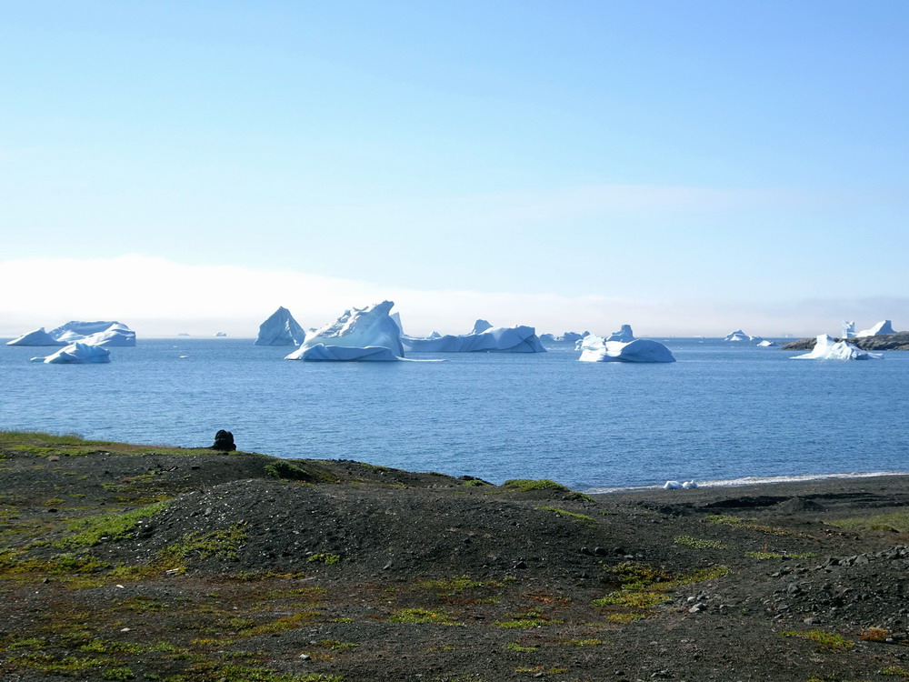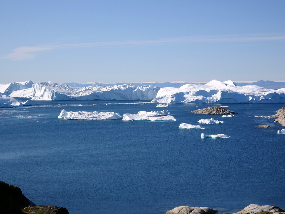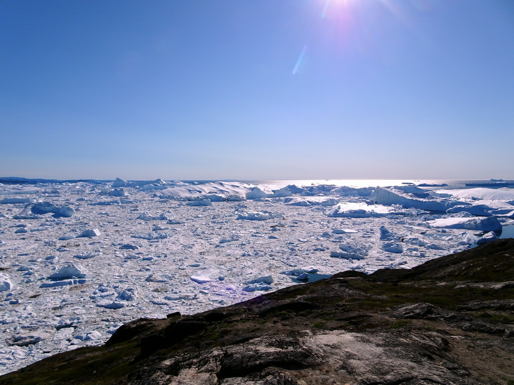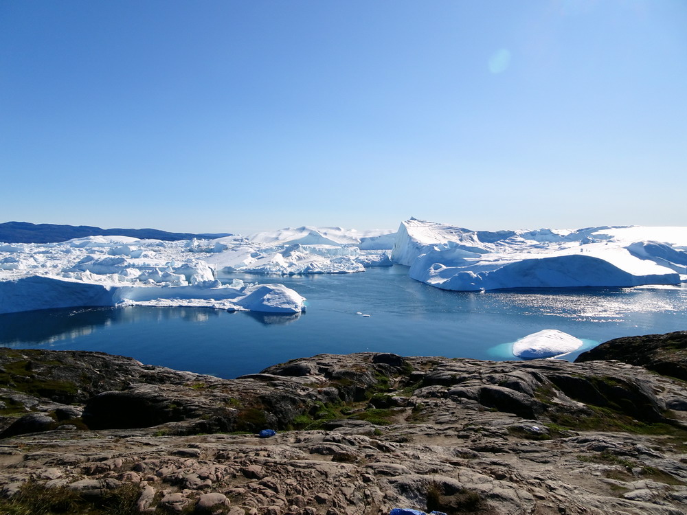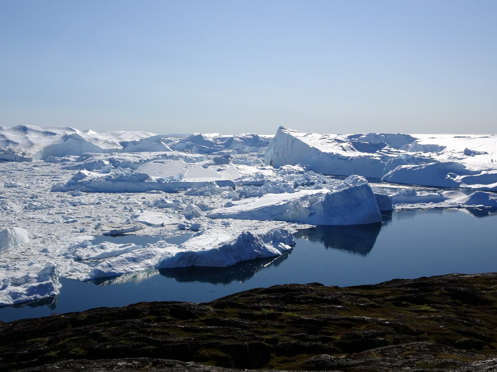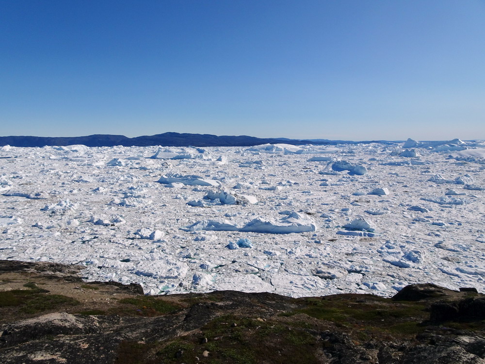 Den kommenden Tag verbrachten wir noch in Qeqertarsuaq, machten eine kurze Wanderung in Richtung eines Wasserfalls und eine etwas längere über Stock und Stein – mehr Stein – zu einer kleinen Bucht, in die sich strömungsbedingt immer ein paar Eisberge verirren. Offenbar war aber Ferienzeit im Eisbergkalender, denn der erhoffte Anblick war eher dürftig. Am folgenden Morgen brachte uns die 9:00 Uhr-Fähre zurück nach Ilulissat. Auf das teuerste Fish ’n‘ Chips meines Lebens folgte das teuerste Bier meines Lebens. Umgerechnet 14 Euro für den gezapften halben Liter verliehen diesem einfachen Rezept aus Hopfen, Malz und Wasser eine würdevolle Exklusivität. Davon beflügelt machten wir uns auf zum ‚Isfjord‘, einem UNESCO-Welterbe, was eine Wanderung von etwa einer Stunde bedeutete. Der ‚Isfjord‘ ist die Mündung des äußerst produktiven Gletschers ‚Sermeq Kujalleq‘. Etwa 10% des jährlich in Grönland kalbenden Festlandeises werden durch diesen Gletscher in den Atlantik abgeleitet. Der Fjord ist ca 50 Kilometer lang und an der Mündung vier Kilometer breit, was ein beeindruckendes Bild bietet. An der Gletscherkante ist die Eisdecke noch 700 Meter dick – im Inland ist der Eisschild bis zu drei Kilometer stark – und nur etwa 100 Meter liegen oberhalb des Meeresspiegels. Mit einer Fließgeschwindigkeit von 19 Meter am Tag ist der Gletscher einer der aktivsten der Erde.