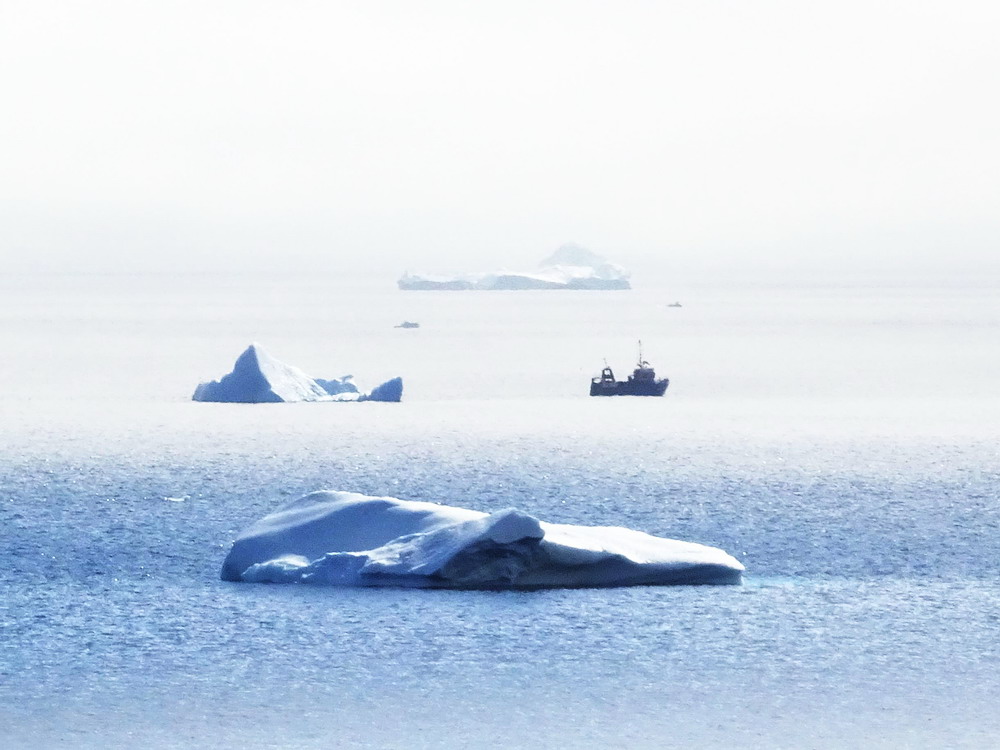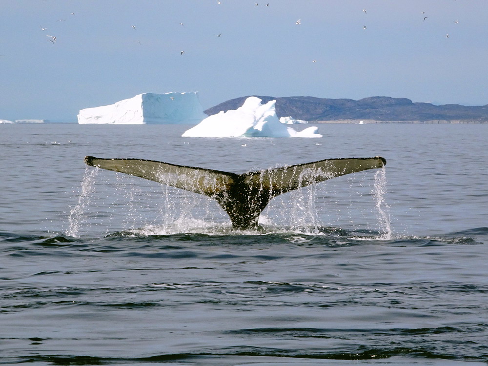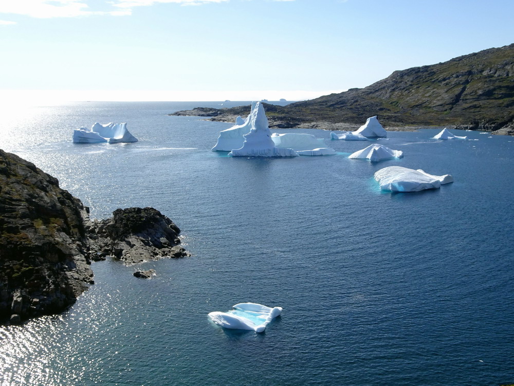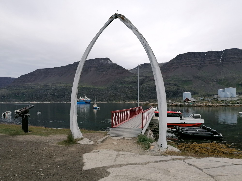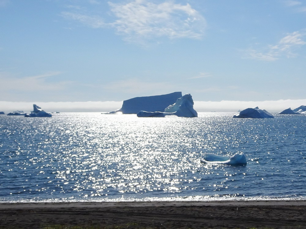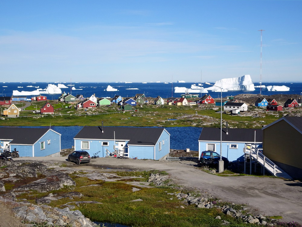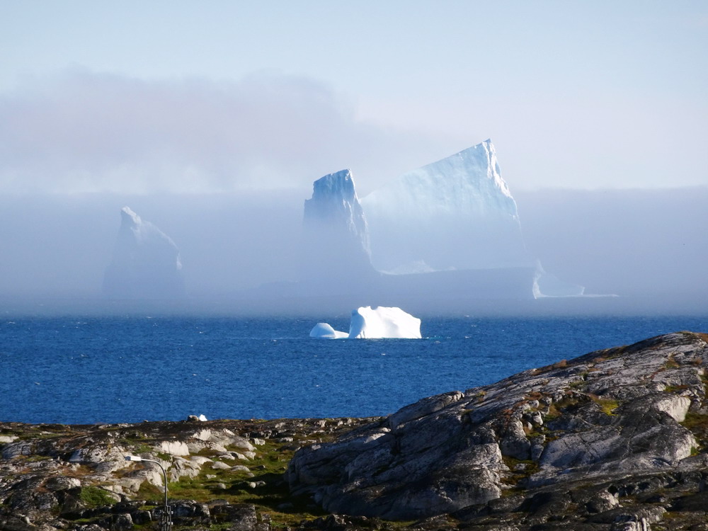Den kommenden Tag verbrachten wir noch in Qeqertarsuaq, machten eine kurze Wanderung in Richtung eines Wasserfalls und eine etwas längere über Stock und Stein – mehr Stein – zu einer kleinen Bucht, in die sich strömungsbedingt immer ein paar Eisberge verirren. Offenbar war aber Ferienzeit im Eisbergkalender, denn der erhoffte Anblick war eher dürftig. Am folgenden Morgen brachte uns die 9:00 Uhr-Fähre zurück nach Ilulissat. Auf das teuerste Fish ’n‘ Chips meines Lebens folgte das teuerste Bier meines Lebens. Umgerechnet 14 Euro für den gezapften halben Liter verliehen diesem einfachen Rezept aus Hopfen, Malz und Wasser eine würdevolle Exklusivität. Davon beflügelt machten wir uns auf zum ‚Isfjord‘, einem UNESCO-Welterbe, was eine Wanderung von etwa einer Stunde bedeutete. Der ‚Isfjord‘ ist die Mündung des äußerst produktiven Gletschers ‚Sermeq Kujalleq‘. Etwa 10% des jährlich in Grönland kalbenden Festlandeises werden durch diesen Gletscher in den Atlantik abgeleitet. Der Fjord ist ca 50 Kilometer lang und an der Mündung vier Kilometer breit, was ein beeindruckendes Bild bietet. An der Gletscherkante ist die Eisdecke noch 700 Meter dick – im Inland ist der Eisschild bis zu drei Kilometer stark – und nur etwa 100 Meter liegen oberhalb des Meeresspiegels. Mit einer Fließgeschwindigkeit von 19 Meter am Tag ist der Gletscher einer der aktivsten der Erde.