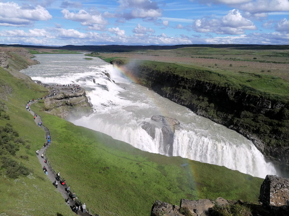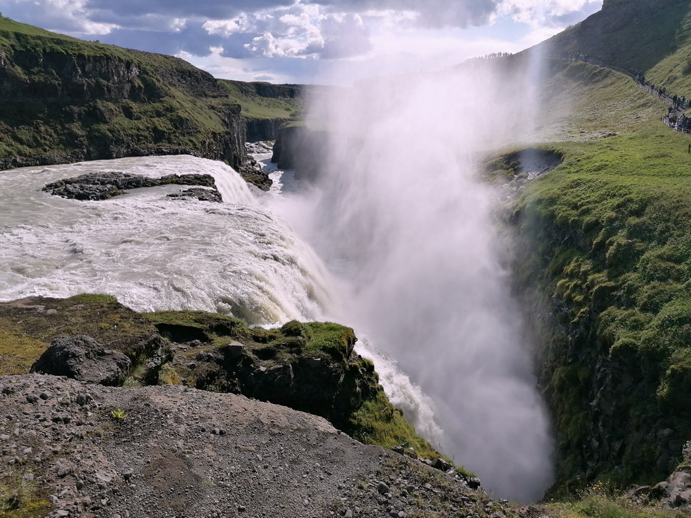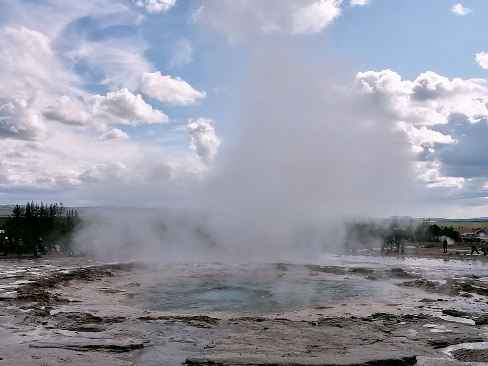 Der Mittwoch, sollte erst am Abend den Weiterflug ins Eis bringen. Also war noch ausreichend Zeit für Unternehmungen. Da die beiden Mädels noch nie in Island waren, bot sich die Touri-Route über den ‚Golden Circle‘ an. Das ist eine bequeme Tagestour entlang der bekanntesten Sehenswürdigkeiten im Südwesten Islands. Wir wählten nicht den üblichen Einstieg in die Route, sondern machten einen Schlenker entlang des ‚Hvalfjördur‘, etwas nördlich von Reykjavik gelegen. Erster Stopp auf dem Circle war dann der Nationalpark ‚Thingvellir‘, benannt nach einem historischen Versammlungsplatz, an dem im Mittelalter schon Wikinger-Parlamente tagten. Ebenfalls wurde 1944 an diesem Ort die Republik Island ausgerufen, nachdem sich die Insel endgültig von der dänischen Herrschaft gelöst hatte. Der nächste Halt war das Geothermalgebiet ‚Haukadalur‘ mit dem bekannten Geysir ‚Strokkur‘ und einigen vor sich hin schwefelenden und dampfenden Thermalquellen. Während der ‚Große Geysir‘, sozusagen der namensgebende Ur-Vater für alle Geysire, sich weitestgehend im wohlverdienten Ruhestand befindet und nur noch sehr selten und unvorhersehbar in die Höhe schießt, zeigt sich der Strokkur zuverlässig alle paar Minuten in einer bis zu 30 Meter hohen Wassersäule. Der dritte große Spot der Rundfahrt ist der Wasserfall ‚Gullfoss‘, wo über eine breite Klippe die Wassermassen über einige kleinere Kaskaden und schlussendlich über eine breite Stufe in die Tiefe stürzen.