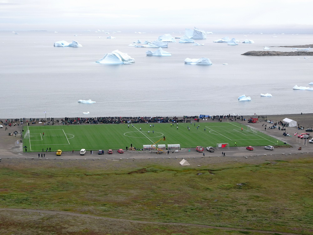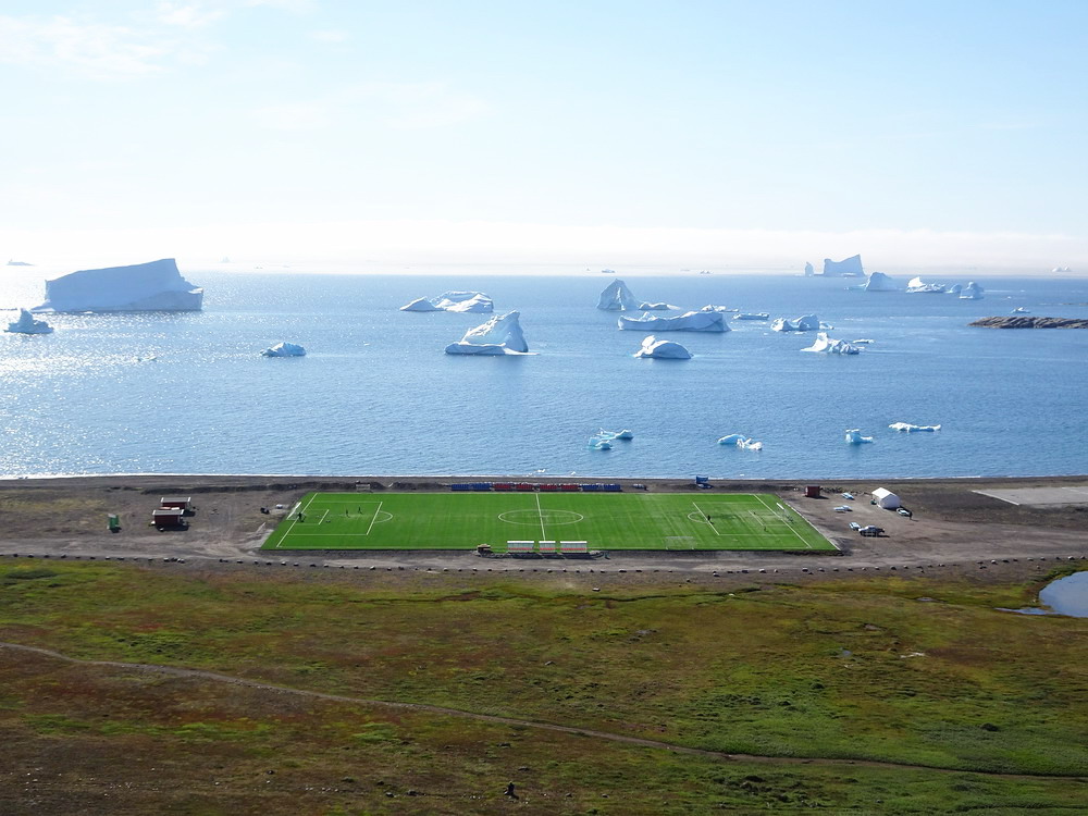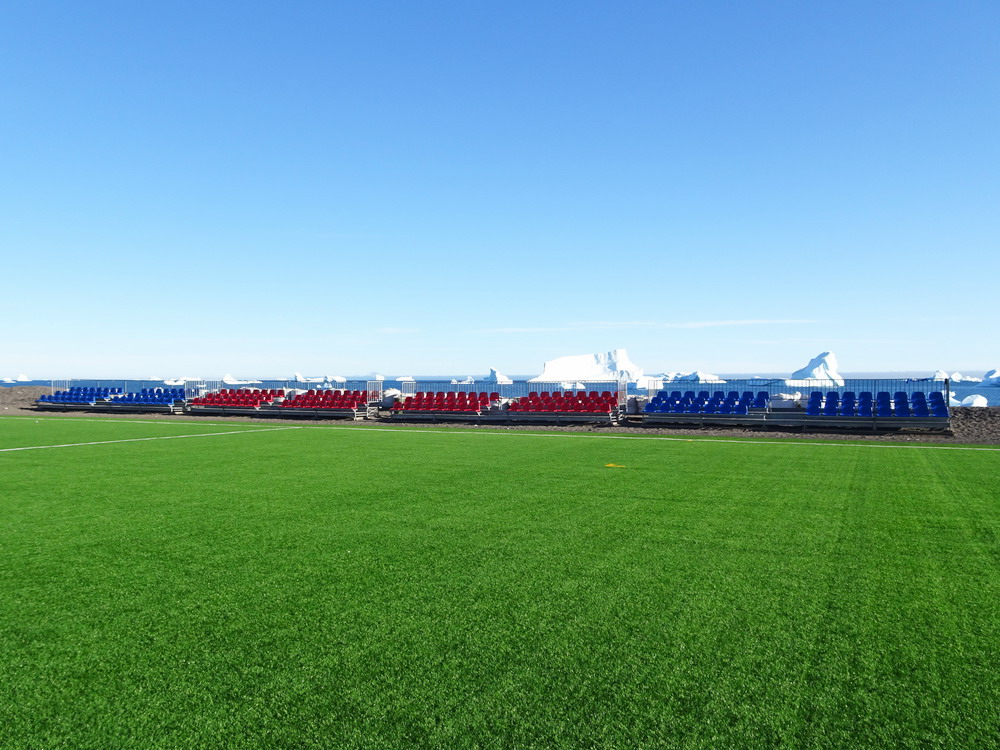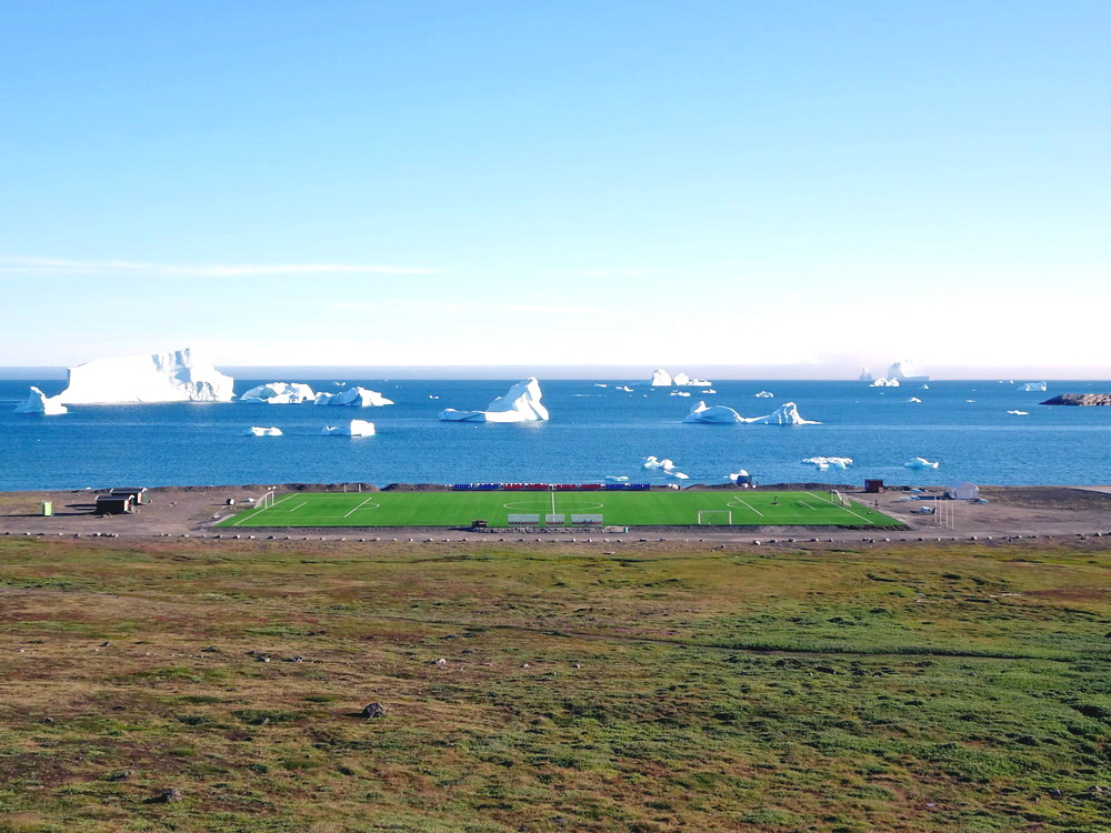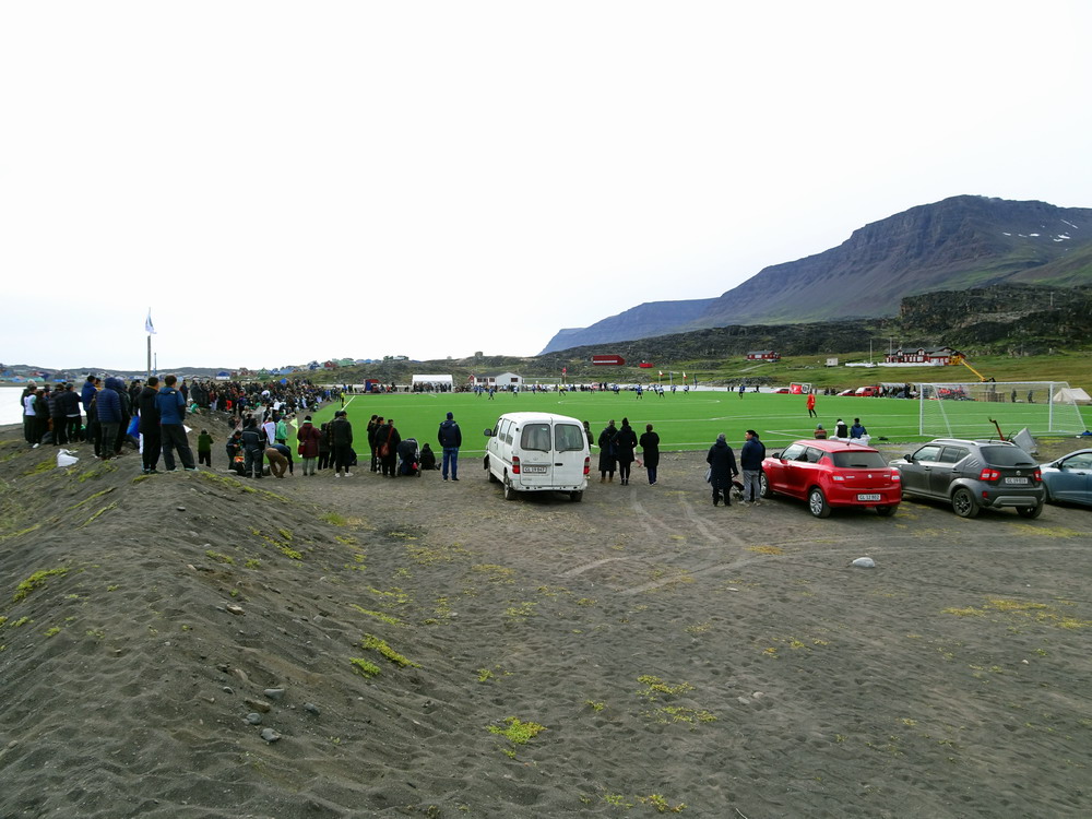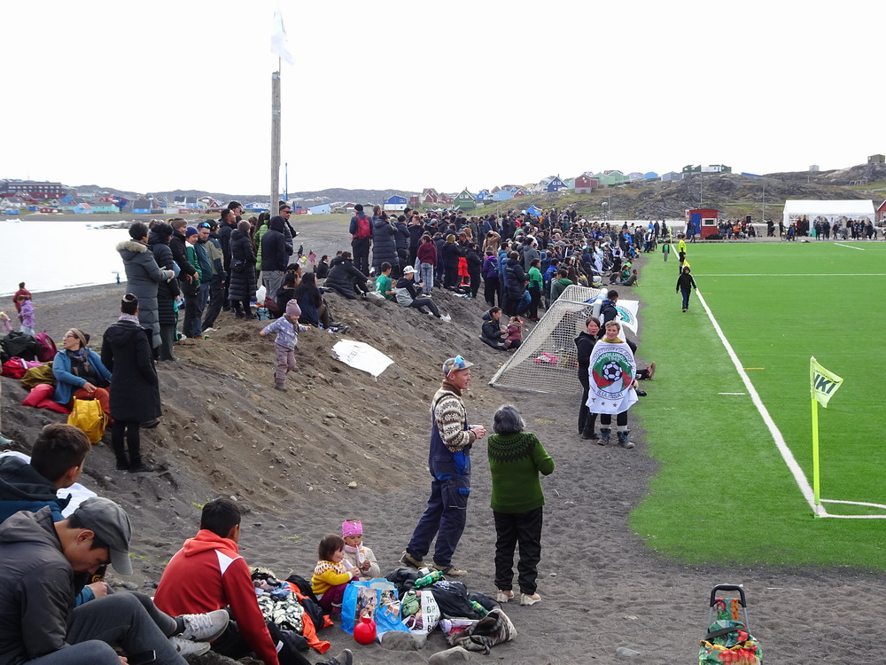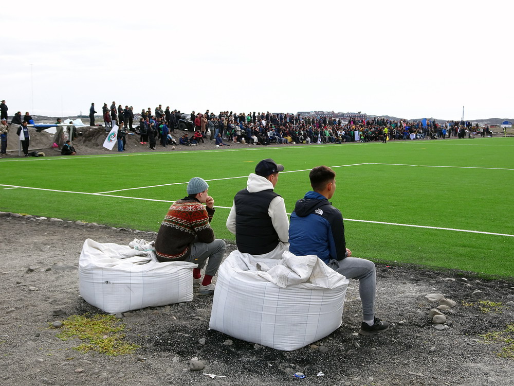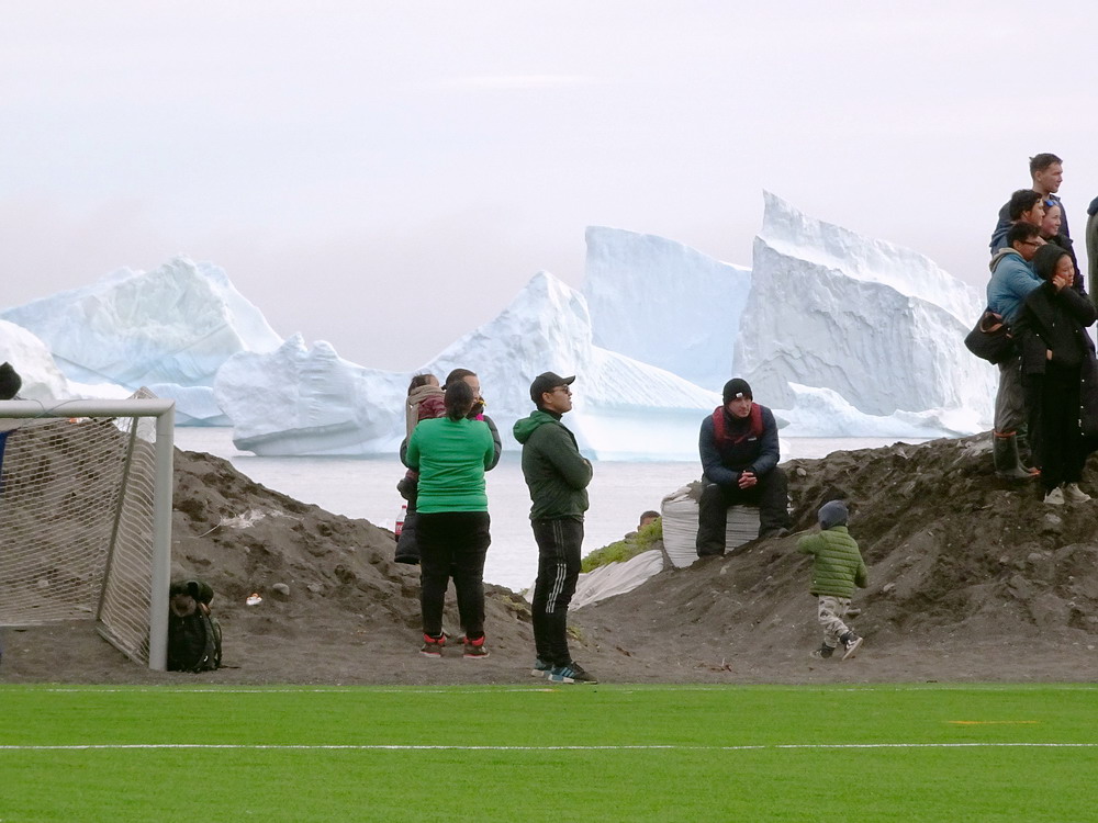 Der Platz selber hat natürlich wenig zu bieten. Dafür umso mehr die Umgebung, denn schaut man von der Meerseite aufs Spielfeld, bauen sich dahinter die beeindruckenden Basalt-Berge auf, die hoch oben auf dem Plateau in den Lyngmark-Gletscher auslaufen. Und blickt man von der Landseite auf den Platz, bietet sich der wunderschön skurrile Anblick mit einer Bucht voller Eisberge hinter einem knallgrünen Kunstgrasfeld. Im Spiel um Platz fünf standen sich die Mannschaften von SAK aus Sisimut, etwa 280 Kilometer südlich der Disko-Insel, und UB-83 aus Upernavik, das noch einmal 430 Kilometer weiter nördlich liegt, gegenüber. Da es aus nachvollziehbaren Gründen kein zusammenhängendes Straßennetz gibt, war die Anreise für die teilnehmenden Teams schon mit hohem Aufwand verbunden. Sicherlich der Grund dafür, warum das Teilnehmerfeld wenige Wochen vor dem Turnier von zehn auf sieben Teams zusammenschmolz. Auf viel Interesse stieß diese Partie nicht. Vor knapp 40 Zuschauern, darunter die angekündigten elf Deutschen inklusive uns und einem Überraschungsgast aus England, entschied SAK die etwas rustikale Partie mit zwei sehenswerten Treffern für sich.