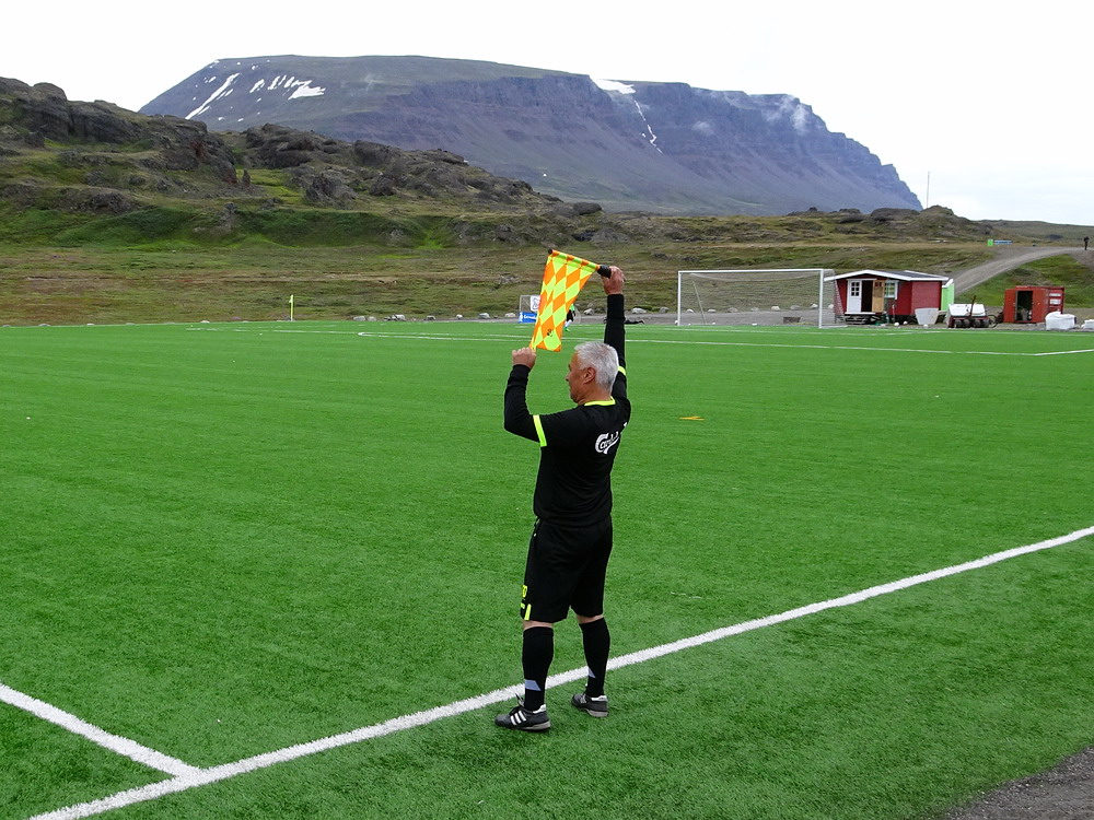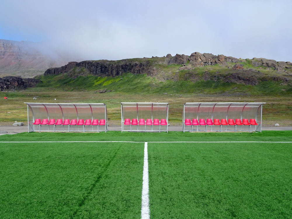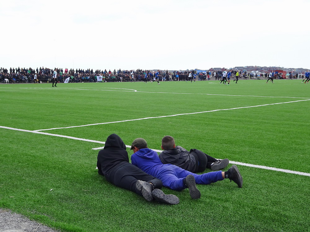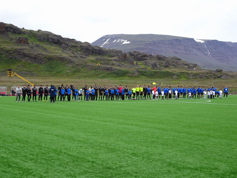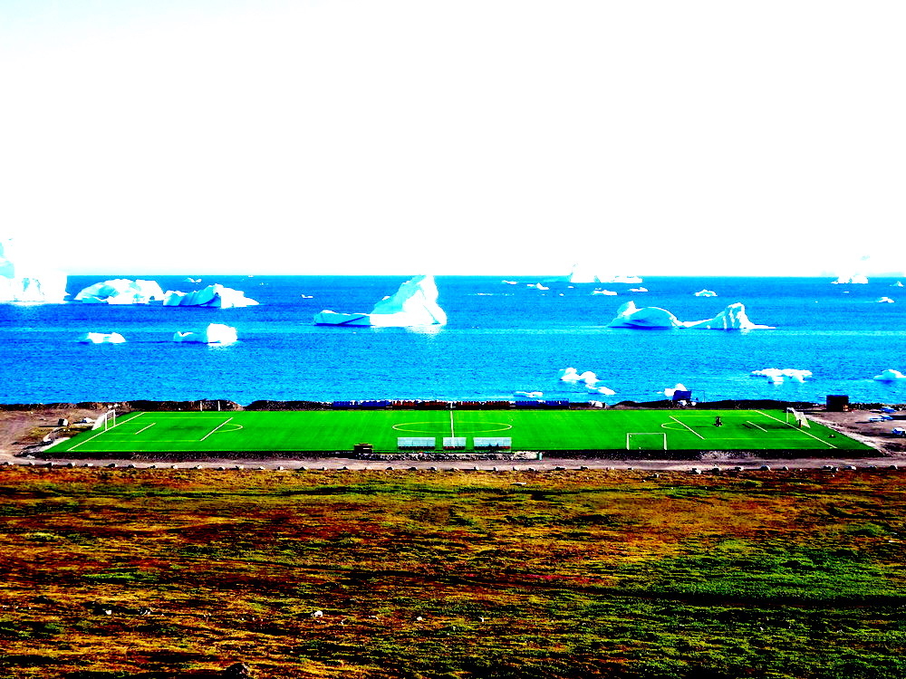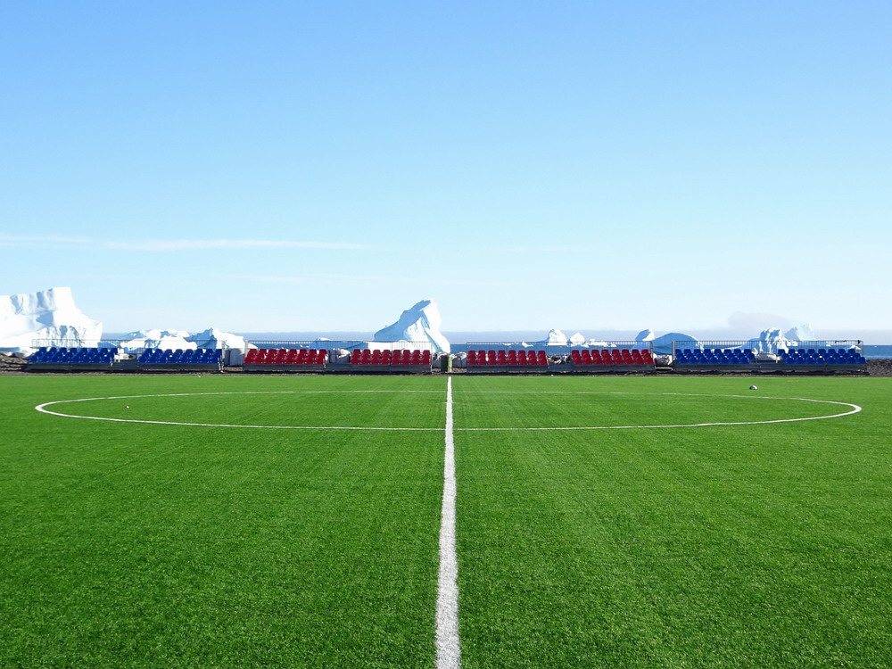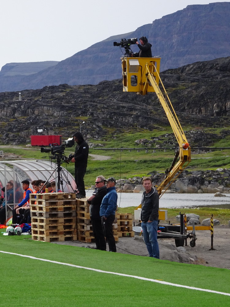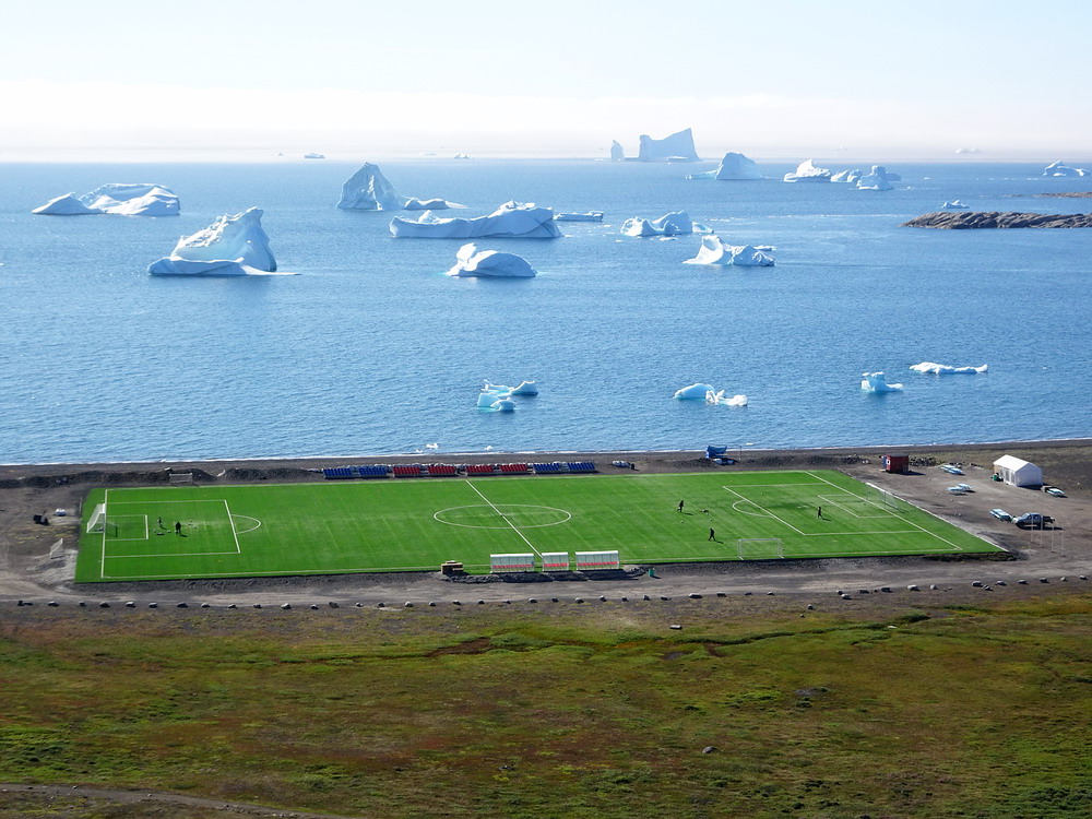 Der Platz selber hat natürlich wenig zu bieten. Dafür umso mehr die Umgebung, denn schaut man von der Meerseite aufs Spielfeld, bauen sich dahinter die beeindruckenden Basalt-Berge auf, die hoch oben auf dem Plateau in den Lyngmark-Gletscher auslaufen. Und blickt man von der Landseite auf den Platz, bietet sich der wunderschön skurrile Anblick mit einer Bucht voller Eisberge hinter einem knallgrünen Kunstgrasfeld. Im Spiel um Platz fünf standen sich die Mannschaften von SAK aus Sisimut, etwa 280 Kilometer südlich der Disko-Insel, und UB-83 aus Upernavik, das noch einmal 430 Kilometer weiter nördlich liegt, gegenüber. Da es aus nachvollziehbaren Gründen kein zusammenhängendes Straßennetz gibt, war die Anreise für die teilnehmenden Teams schon mit hohem Aufwand verbunden. Sicherlich der Grund dafür, warum das Teilnehmerfeld wenige Wochen vor dem Turnier von zehn auf sieben Teams zusammenschmolz. Auf viel Interesse stieß diese Partie nicht. Vor knapp 40 Zuschauern, darunter die angekündigten elf Deutschen inklusive uns und einem Überraschungsgast aus England, entschied SAK die etwas rustikale Partie mit zwei sehenswerten Treffern für sich.