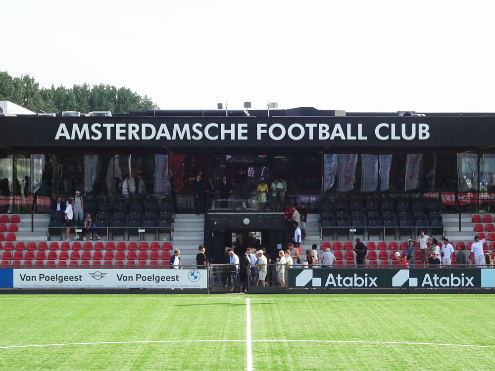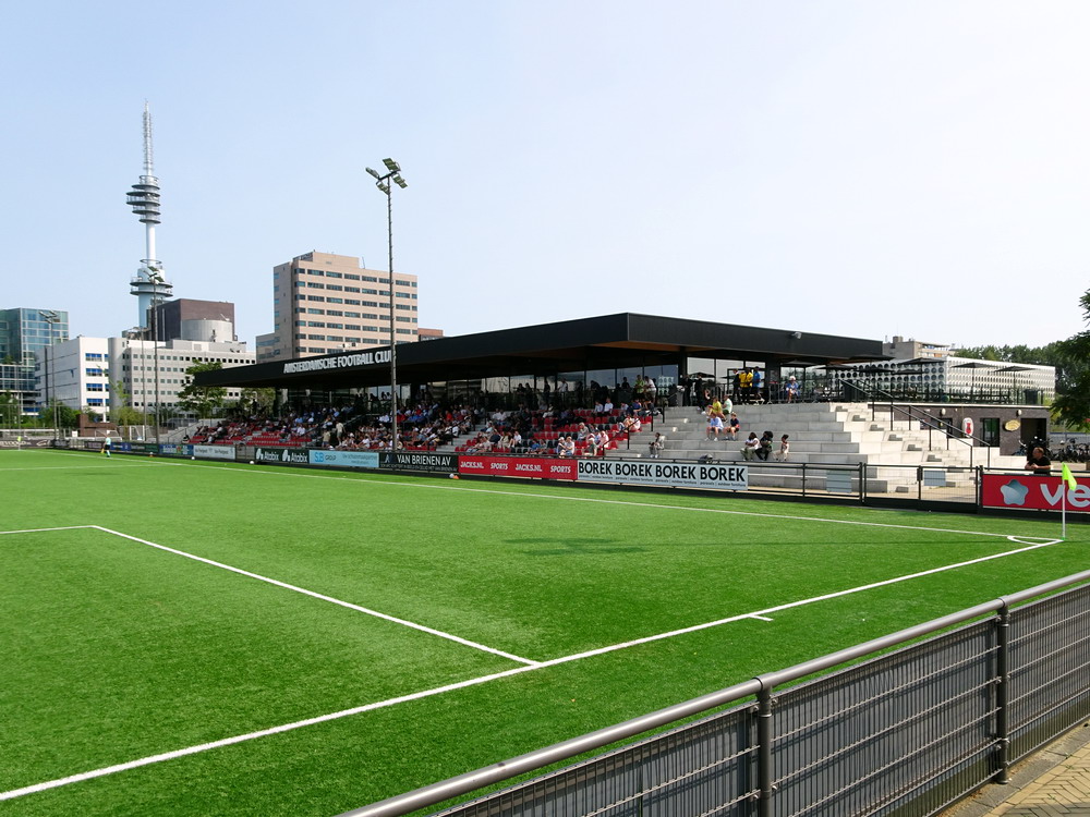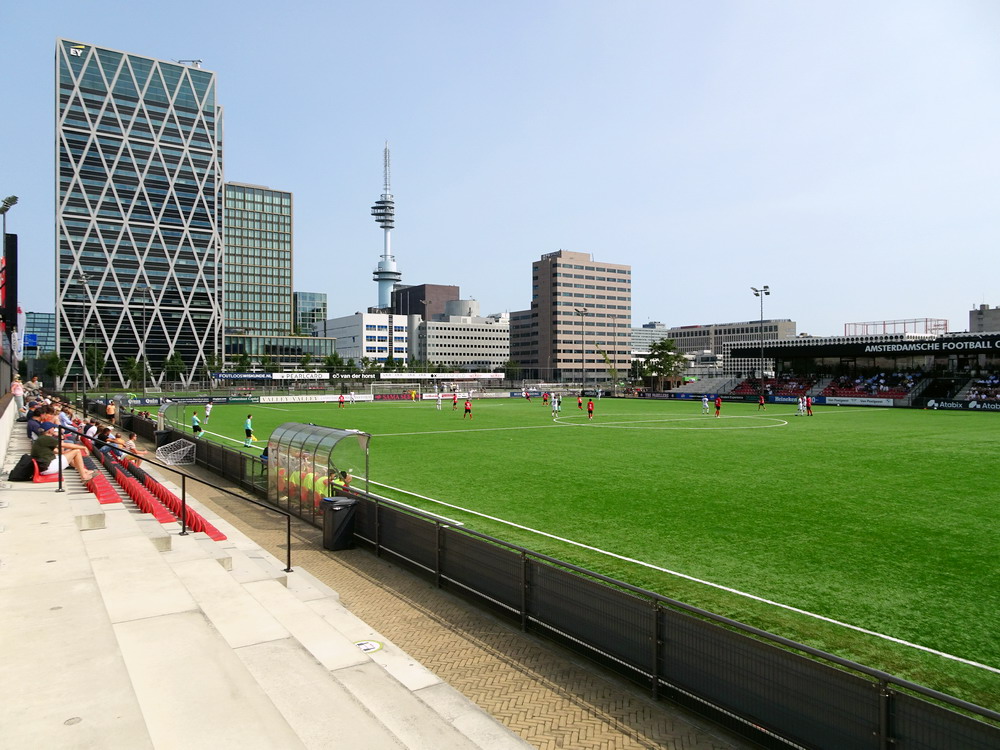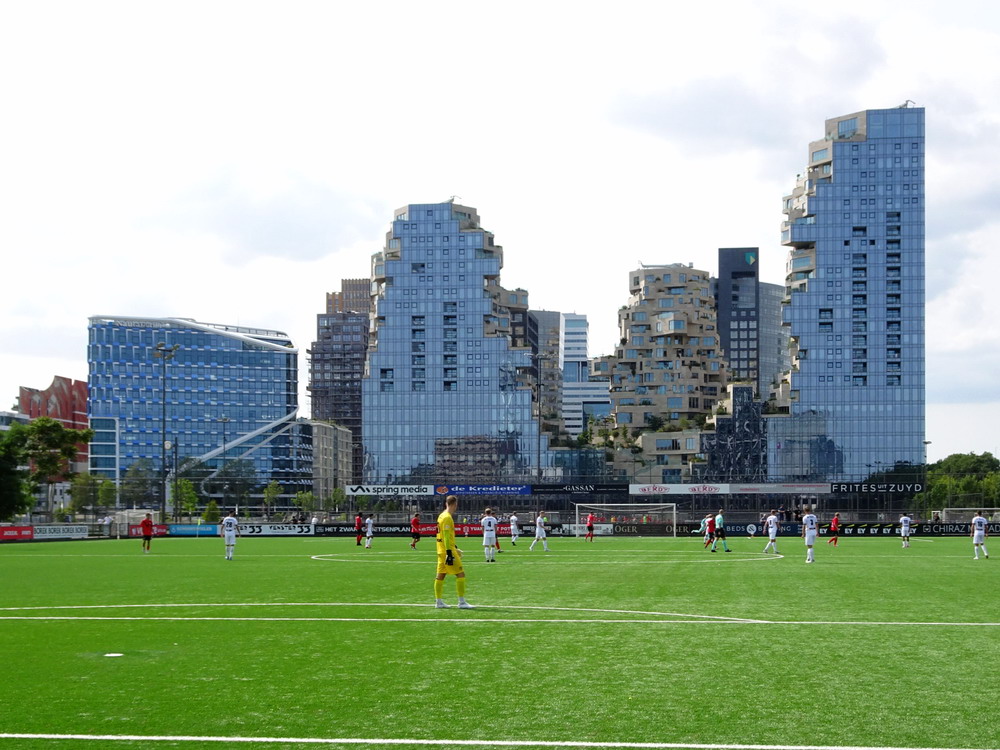 Da die Herzdame nach der Reise ins Eis noch ein wenig Entspannung reklamierte, war die holländische Küste nahe Amsterdam das Ziel. Das ermöglichte mir den Besuch beim AFC in der Amsterdamer Peripherie. ‚Schöne‘ neue Fußballwelt – während das Eintrittsgeld ausschließlich per Kartenzahlung möglich war, bekam man im Gegenzug kein Ticket. Das kleine Stadion unterscheidet sich von den anderen Amateur-Spielstätten des Landes nicht signifikant, wenn da nicht die Architektur drum herum wäre. Während sich hinter dem einen Tor eine Businesskulisse gerade macht, bringt sich hinter dem anderen Gebälk ein wilder, ungeordnet erscheinender Mischkomplex in Stellung. ‚Valley‘ heißt dieses Ensemble, welches ein echter Eyecatcher ist und einen zerklüfteten Canyon imitieren soll. Ein aus drei Türmen mit unterschiedlicher Höhe bestehender Gebäudekomplex birgt Büros, Geschäfte, Restaurants und Apartments. Die Mischung aus verspiegelten, glatten und unruhigen Fassaden vereinen irgendwie eine harmonische Disharmonie. Nicht ganz so harmonisch ging es auf dem Kunstgras-Spielfeld unterhalb des Gebäudes zu. Während beinahe zeitgleich der glorreiche RWE im DFB-Pokal gegen die Leipziger Filiale des Energydrink-Herstellers aus dem österreichischen Fuschl am See antreten musste – ein Pokal-Los, das mich nullkommanull abholte – kämpften am ersten Spieltag der dritten Spielklasse die Kontrahenten um jeden Plastikhalm. Die Führung der Gäste aus dem Norden des Landes konnte der AFC noch vor der Pause ausgleichen. Die zweite Spielhälfte war ebenso ausgeglichen wie die erste, einen Treffer gab es nicht mehr zu bestaunen.