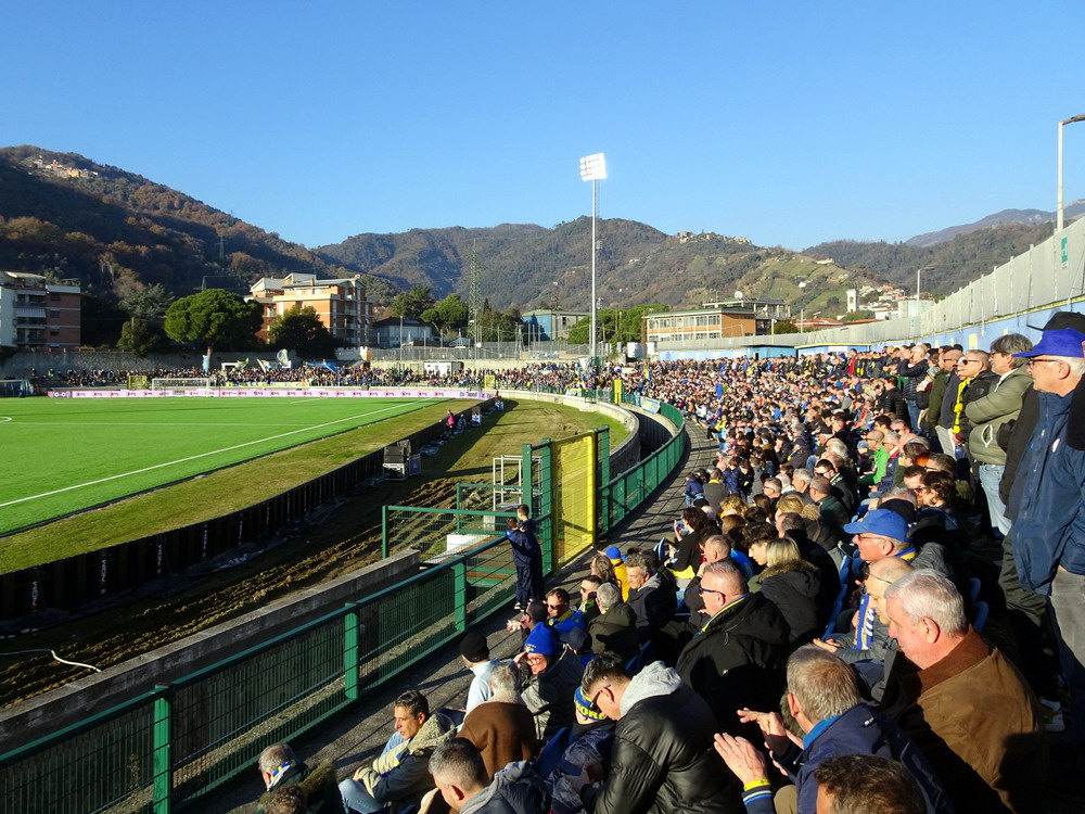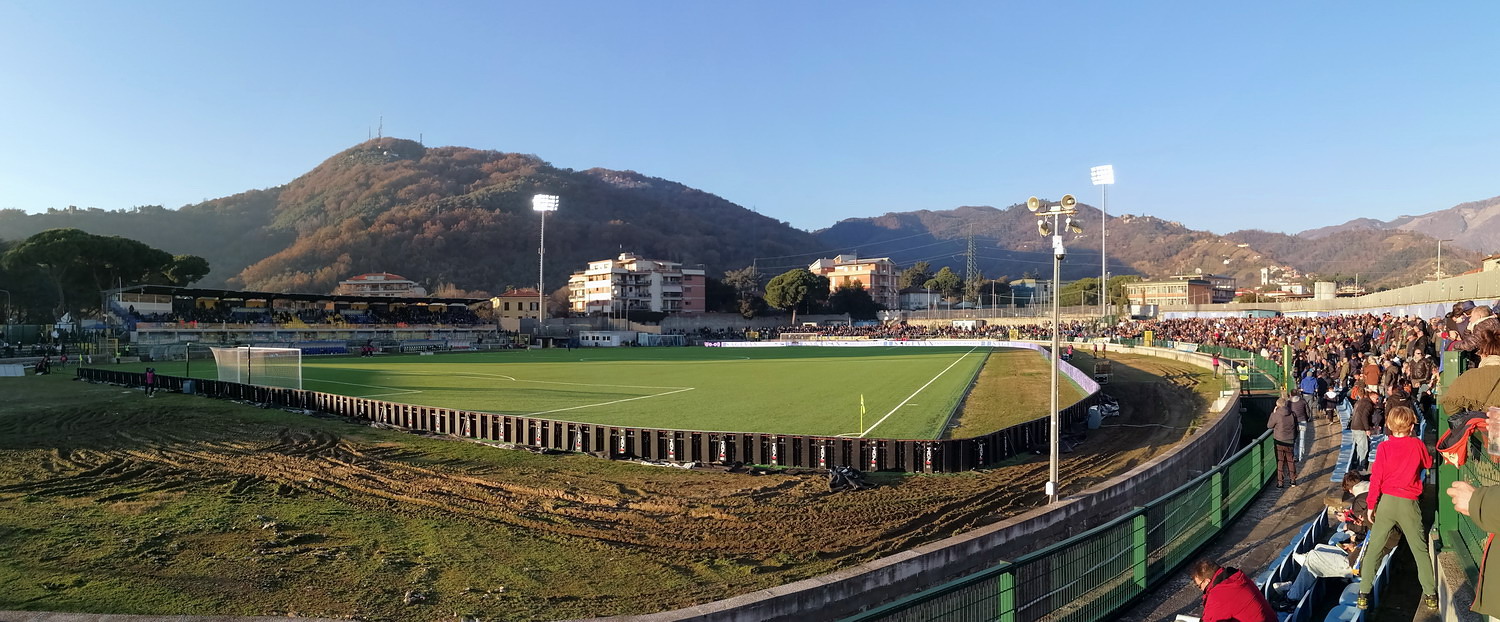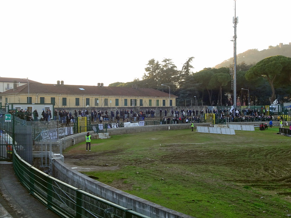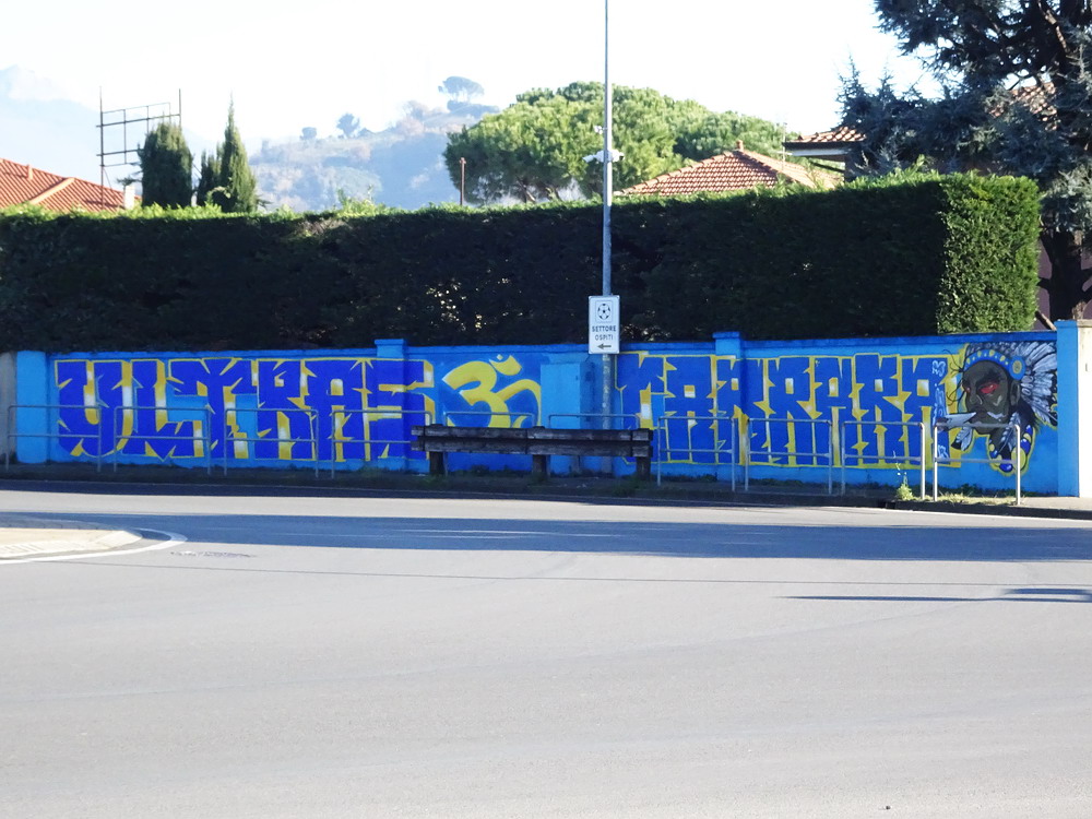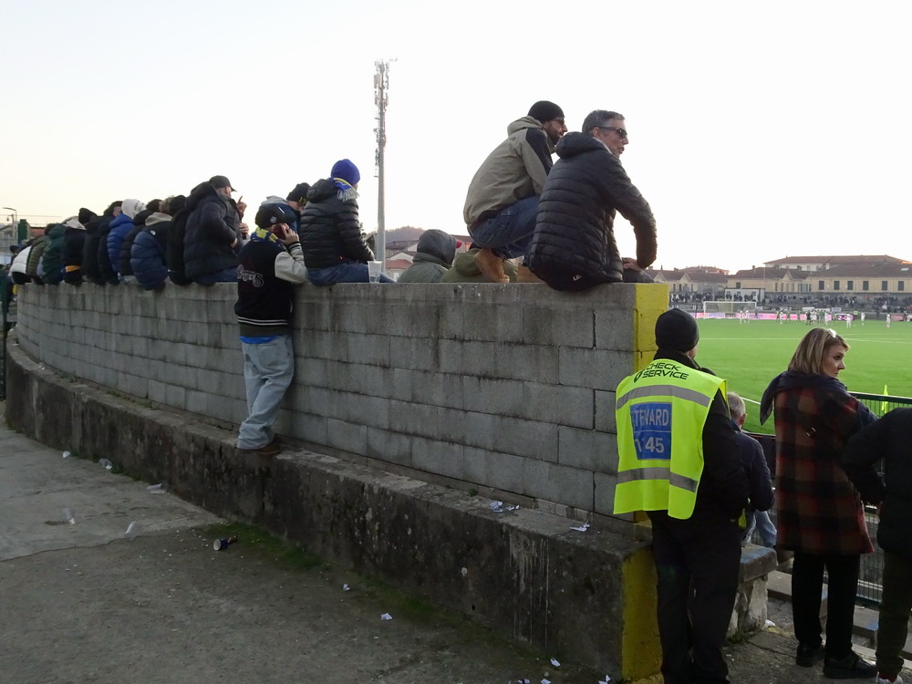 Während es den Großteil der Bewegung zwischen den Feiertagen beinahe traditionell auf die Insel zog, wählte ich den Stiefel als Zielregion aus. Ich bin gern in England und die Masse an Spielen, die rund um den Jahreswechsel angeboten wird, ist natürlich ein Argument, aber ich konnte mich nicht überwinden, dem Exodus der Szene zu folgen. Italien also, dort ist man natürlich auch nicht allein, hört aber in den Stadien eben doch eher die Landessprache als die meistgesprochene Sprache Europas. Mit dem Hinflug von Köln/Bonn nach Bergamo und dem Rückflug ab Milano-Linate nach Düsseldorf und den daraus entstehenden Herausforderungen wurde zwar ein etwas anstrengendes Routing gewählt, aber aus Zeit- und Kostengründen war dieses alternativlos. Den Auftakt machte das Zweitliga-Spiel in Carrara, übrigens Geburtsort von Torwart-Legende Gianluigi Buffon. Carrarese durfte im vergangenen Sommer nach 76 Jahren den Wiederaufstieg in die Serie B feiern und empfing Cesena im betagten ‚Stadio dei Marmi‘, einem flachen, weitläufigen Oval, in dem nur die Haupttribüne überdacht ist. Den Gästen war die Anreise erlaubt und dennoch verloren sich nur enttäuschende 200 Cesena-Tifosi im ‚Settore Ospiti‘. Darunter waren keine organisierten Gruppen, da nur Gäste-Anhänger zum Kauf einer Eintrittskarte berechtigt waren, welche über eine ‚Tessera del tifoso‘, eine Fan-ID mit Datenspeicherung verfügen. Diese Registrierung wird aber von Ultras aus Cesena abgelehnt und boykottiert, leider ein Faktor mit dem man in Italien immer rechnen muss. Die kleine aber feine Curva der Gastgeber produzierte aber ansprechende Stimmung und zur Belohnung durfte sich die Anhängerschaft über einen verdienten Sieg über das Team aus Cesena, bei dem der Sohn von Jürgen Klinsmann des Tor hütet, freuen.