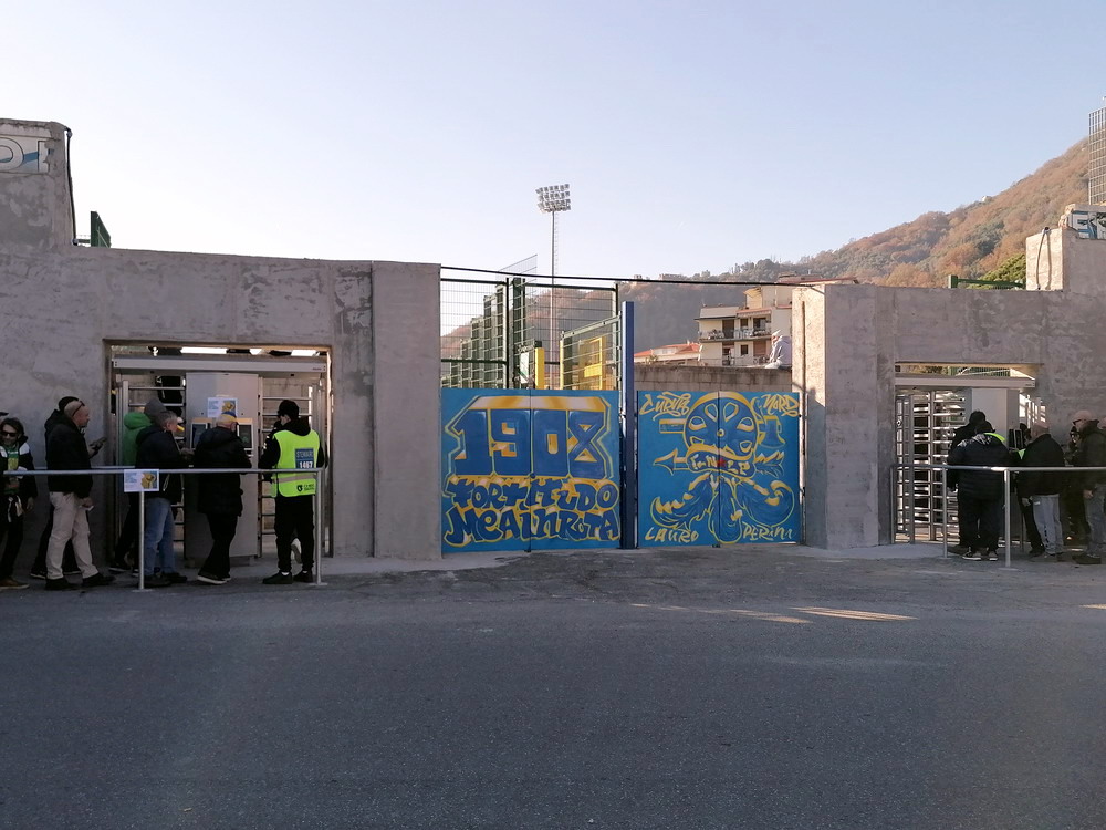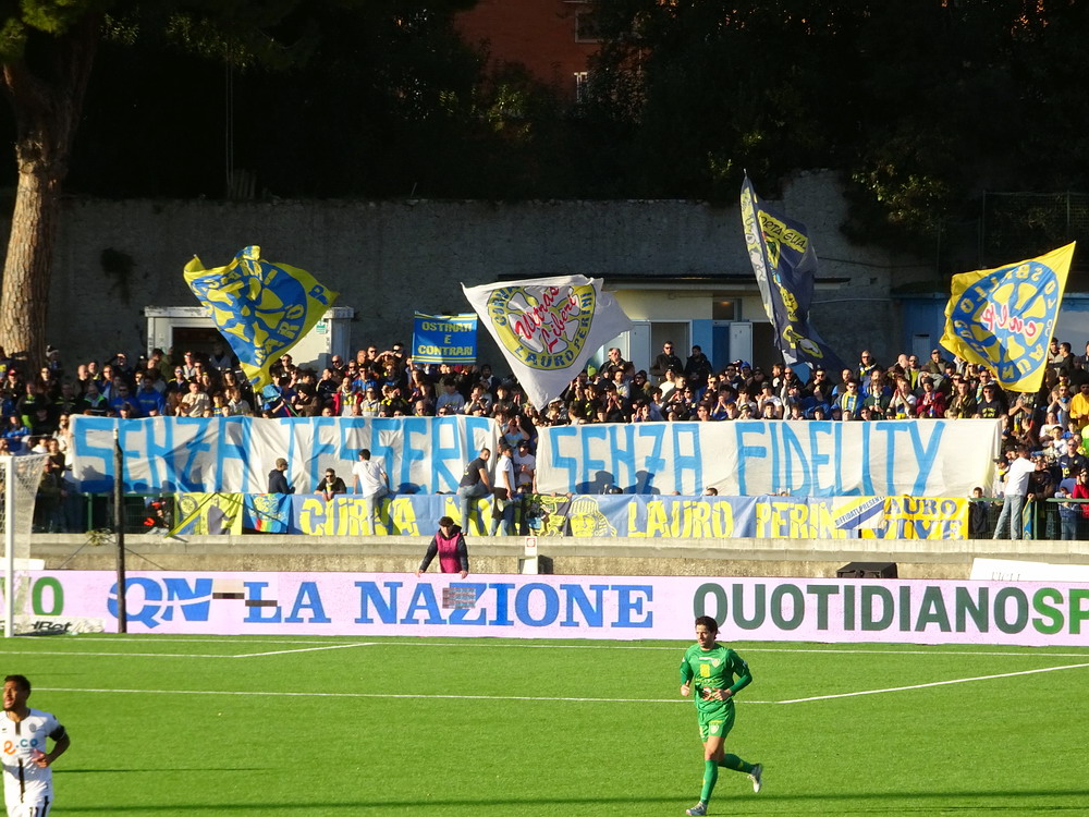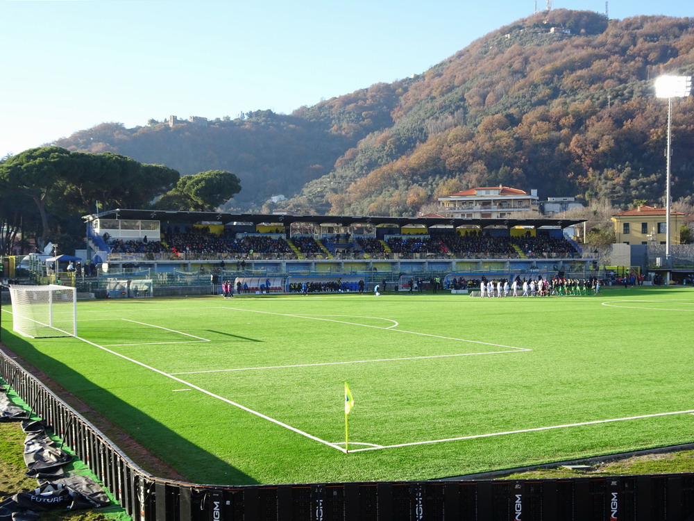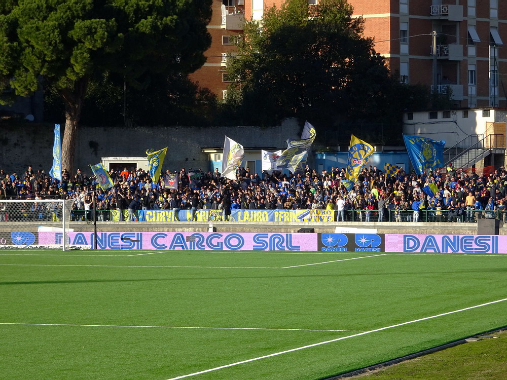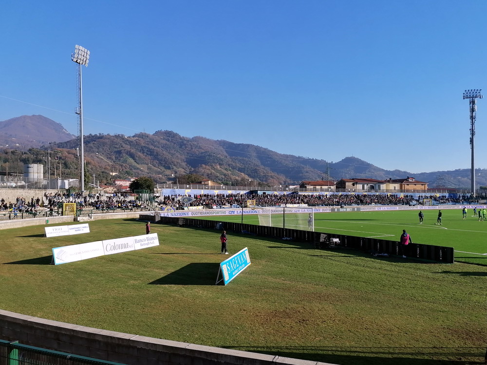 Während es den Großteil der Bewegung zwischen den Feiertagen beinahe traditionell auf die Insel zog, wählte ich den Stiefel als Zielregion aus. Ich bin gern in England und die Masse an Spielen, die rund um den Jahreswechsel angeboten wird, ist natürlich ein Argument, aber ich konnte mich nicht überwinden, dem Exodus der Szene zu folgen. Italien also, dort ist man natürlich auch nicht allein, hört aber in den Stadien eben doch eher die Landessprache als die meistgesprochene Sprache Europas. Mit dem Hinflug von Köln/Bonn nach Bergamo und dem Rückflug ab Milano-Linate nach Düsseldorf und den daraus entstehenden Herausforderungen wurde zwar ein etwas anstrengendes Routing gewählt, aber aus Zeit- und Kostengründen war dieses alternativlos. Den Auftakt machte das Zweitliga-Spiel in Carrara, übrigens Geburtsort von Torwart-Legende Gianluigi Buffon. Carrarese durfte im vergangenen Sommer nach 76 Jahren den Wiederaufstieg in die Serie B feiern und empfing Cesena im betagten ‚Stadio dei Marmi‘, einem flachen, weitläufigen Oval, in dem nur die Haupttribüne überdacht ist. Den Gästen war die Anreise erlaubt und dennoch verloren sich nur enttäuschende 200 Cesena-Tifosi im ‚Settore Ospiti‘. Darunter waren keine organisierten Gruppen, da nur Gäste-Anhänger zum Kauf einer Eintrittskarte berechtigt waren, welche über eine ‚Tessera del tifoso‘, eine Fan-ID mit Datenspeicherung verfügen. Diese Registrierung wird aber von Ultras aus Cesena abgelehnt und boykottiert, leider ein Faktor mit dem man in Italien immer rechnen muss. Die kleine aber feine Curva der Gastgeber produzierte aber ansprechende Stimmung und zur Belohnung durfte sich die Anhängerschaft über einen verdienten Sieg über das Team aus Cesena, bei dem der Sohn von Jürgen Klinsmann des Tor hütet, freuen.