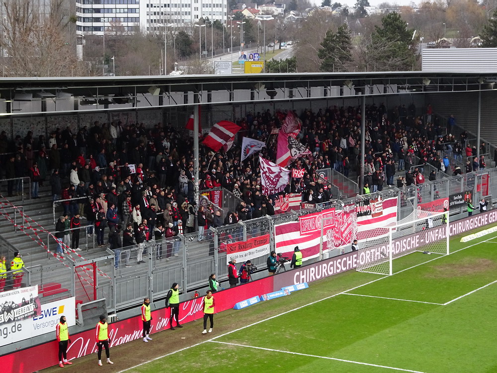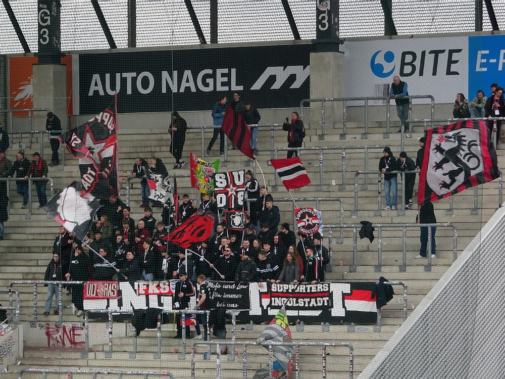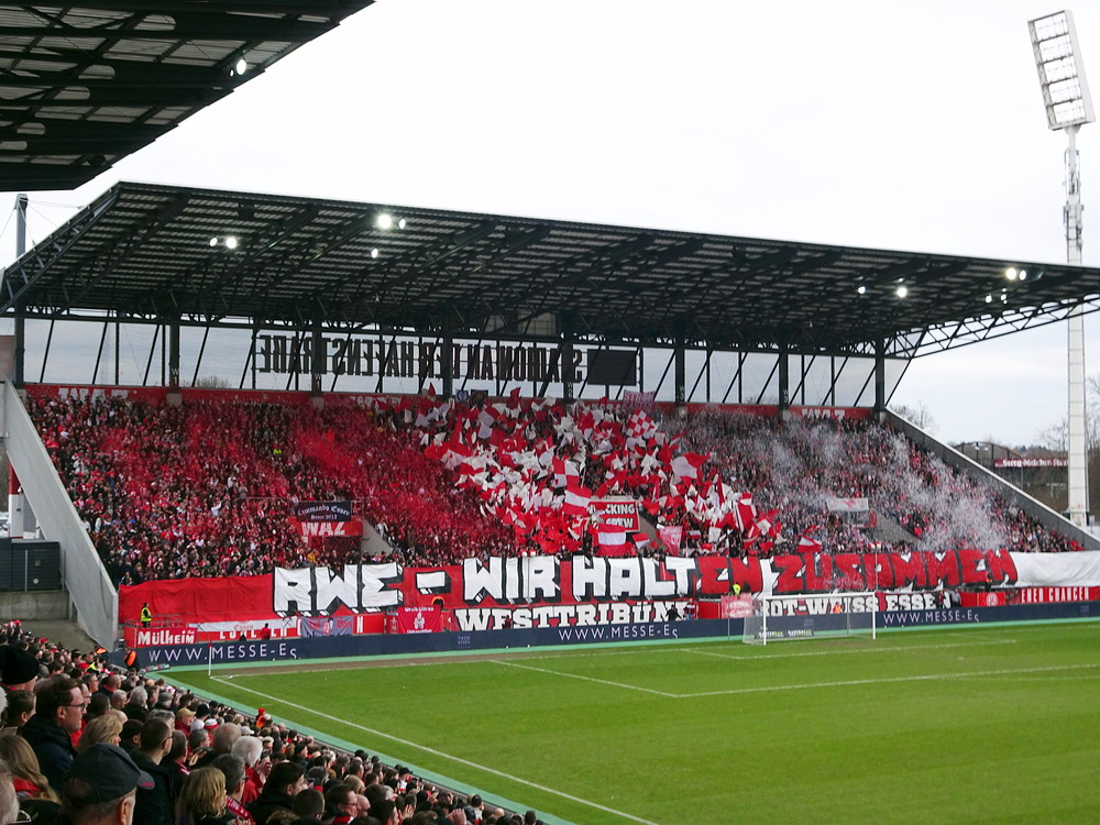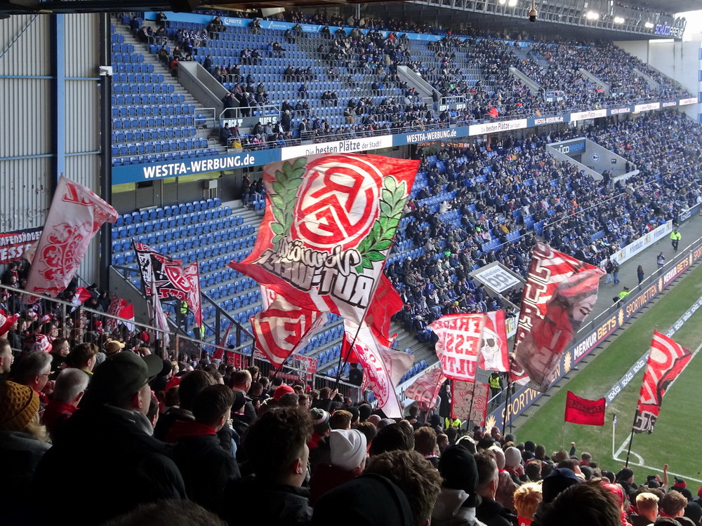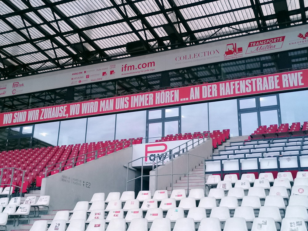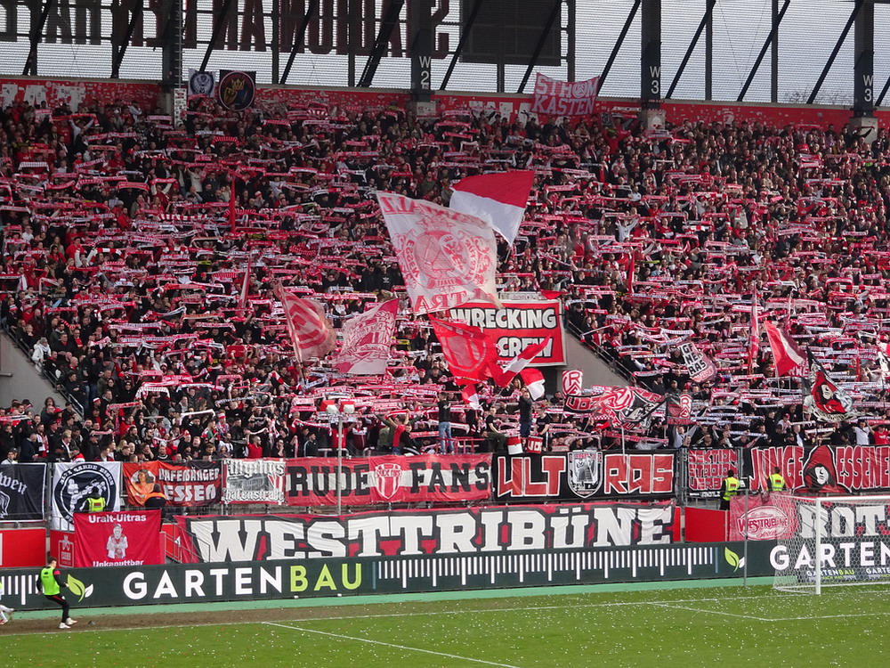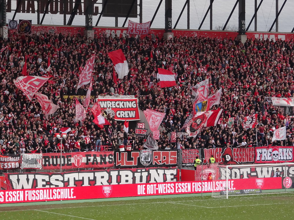 Mit der Audi-Betriebssportmannschaft stellte sich dem glorreichen RWE eine knifflige Aufgabe, denn der Gegner hatte in den letzten 18 Spielen nur einmal(!) den Platz als Verlierer verlassen müssen. Auch wenn die Roten aktuell recht gut unterwegs sind, hätte ich mich deshalb auch schon mit einem Punkt angefreundet. Auf der anderen Seite bedeutet eine lange Serie ohne oder mit wenig Niederlagen ja auch, dass die Wahrscheinlichkeit einer baldigen Schlappe steigt. Warum sollte das nicht hier und heute in Essen der Fall sein, bei einer Mannschaft, die sich nun weitestgehend gefunden zu haben scheint, auch wenn es noch genug Luft nach oben gibt. In der Westkurve gab es eine kleine Choreographie zu sehen. Im mittleren Bereich wurden viele rot-weisse Fahnen geschwenkt, rechts und links davon rotes und weißes Konfetti geworfen. Das alles untermalte ein den Zusammenhalt beschwörendes Banner am Zaun. Auf der Gegenseite versuchten sich knapp 100 ‚Schanzer‘ Gehör zu verschaffen – weitestgehend erfolglos. In der ersten Halbzeit sah ich ein ausgeglichenes Spiel. Die Oberbayern hatten die erste Torgelegenheit, danach kam auch der RWE zu Torraum-Szenen. Als Safi dann in den Sechzehner eindrang und von Malone umgegrätscht wurde, zeigte der Referee sofort auf den Punkt. Im Nachhinein sorgte die Entscheidung für Diskussion, weil Safi die riskante Aktion des Verteidigers dankend annahm, dennoch ging der Strafstoß in Ordnung. Arslan verwandelte souverän. In der Folge kamen die Gäste noch zu Möglichkeiten, das Aluminium und Golz retteten aber. Der Sohnemann des langjährigen HSV-Schnappers Richie Golz wurde im zweiten Durchgang wieder zum entscheidenden Faktor. Zunächst erhöhte Eitschberger kurz nach dem Seitenwechsel, womit nun die ganze ‚Turban-Fraktion‘ vom letzten Wochenende erneut getroffen hatte.