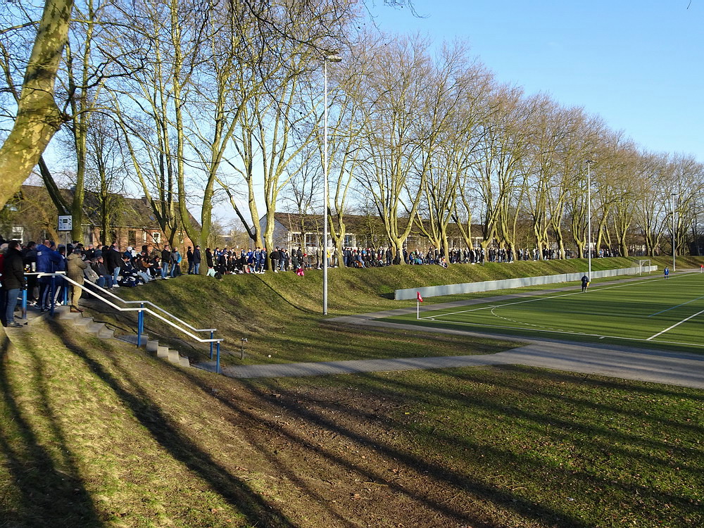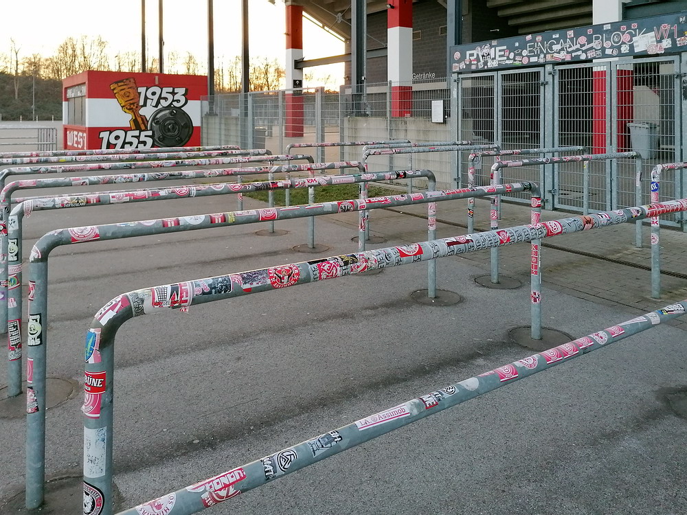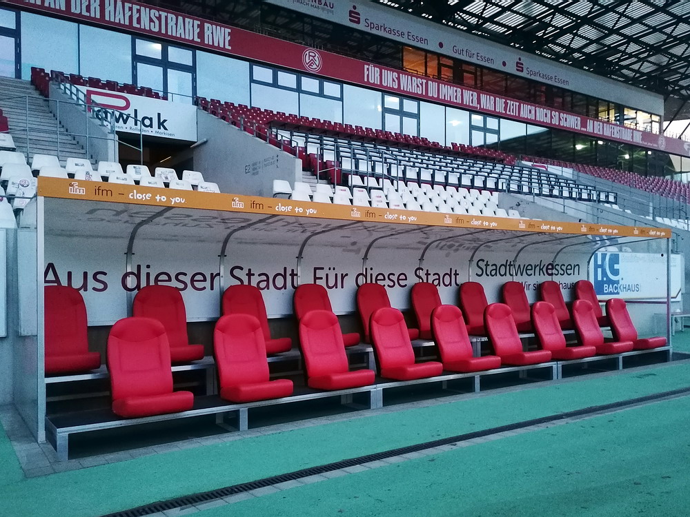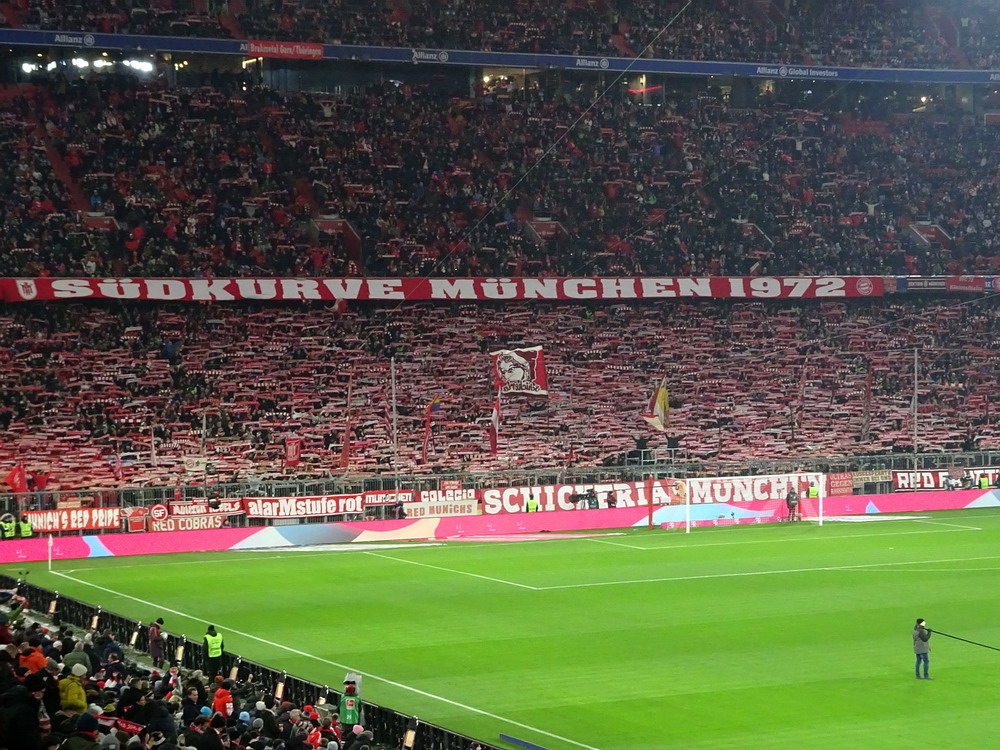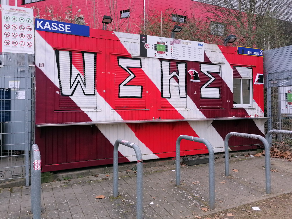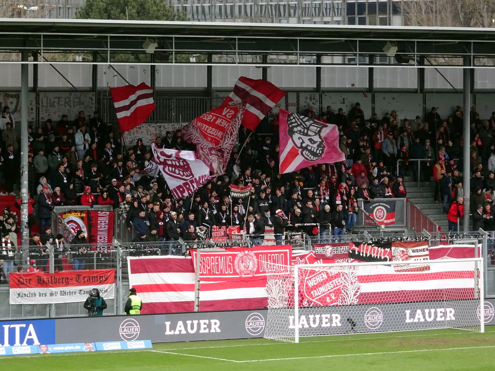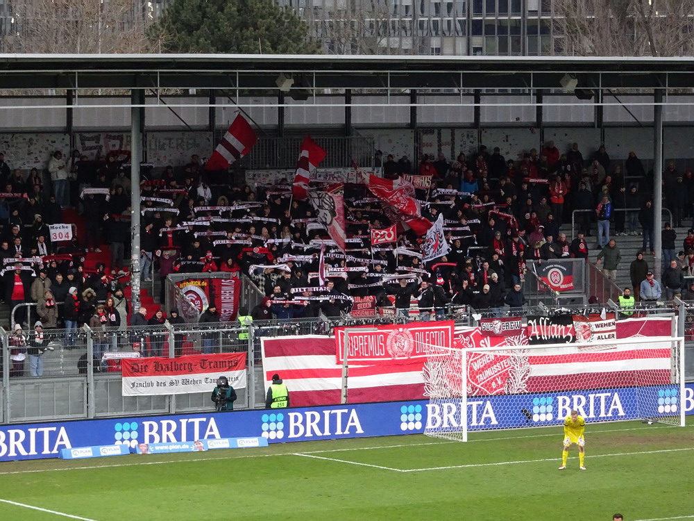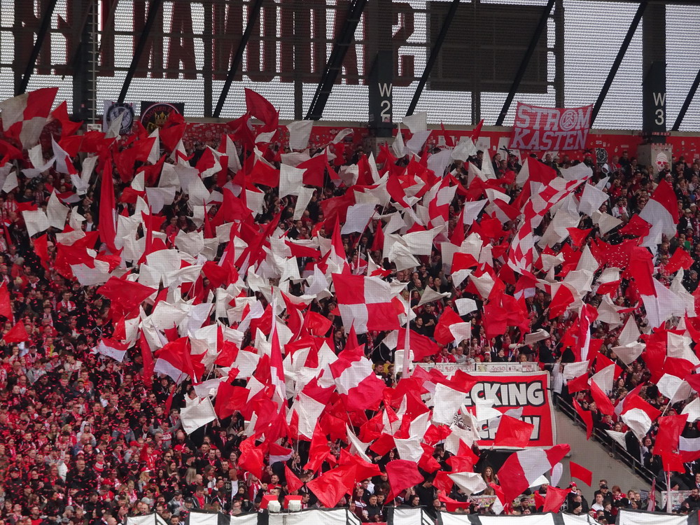 Mit der Audi-Betriebssportmannschaft stellte sich dem glorreichen RWE eine knifflige Aufgabe, denn der Gegner hatte in den letzten 18 Spielen nur einmal(!) den Platz als Verlierer verlassen müssen. Auch wenn die Roten aktuell recht gut unterwegs sind, hätte ich mich deshalb auch schon mit einem Punkt angefreundet. Auf der anderen Seite bedeutet eine lange Serie ohne oder mit wenig Niederlagen ja auch, dass die Wahrscheinlichkeit einer baldigen Schlappe steigt. Warum sollte das nicht hier und heute in Essen der Fall sein, bei einer Mannschaft, die sich nun weitestgehend gefunden zu haben scheint, auch wenn es noch genug Luft nach oben gibt. In der Westkurve gab es eine kleine Choreographie zu sehen. Im mittleren Bereich wurden viele rot-weisse Fahnen geschwenkt, rechts und links davon rotes und weißes Konfetti geworfen. Das alles untermalte ein den Zusammenhalt beschwörendes Banner am Zaun. Auf der Gegenseite versuchten sich knapp 100 ‚Schanzer‘ Gehör zu verschaffen – weitestgehend erfolglos. In der ersten Halbzeit sah ich ein ausgeglichenes Spiel. Die Oberbayern hatten die erste Torgelegenheit, danach kam auch der RWE zu Torraum-Szenen. Als Safi dann in den Sechzehner eindrang und von Malone umgegrätscht wurde, zeigte der Referee sofort auf den Punkt. Im Nachhinein sorgte die Entscheidung für Diskussion, weil Safi die riskante Aktion des Verteidigers dankend annahm, dennoch ging der Strafstoß in Ordnung. Arslan verwandelte souverän. In der Folge kamen die Gäste noch zu Möglichkeiten, das Aluminium und Golz retteten aber. Der Sohnemann des langjährigen HSV-Schnappers Richie Golz wurde im zweiten Durchgang wieder zum entscheidenden Faktor. Zunächst erhöhte Eitschberger kurz nach dem Seitenwechsel, womit nun die ganze ‚Turban-Fraktion‘ vom letzten Wochenende erneut getroffen hatte.