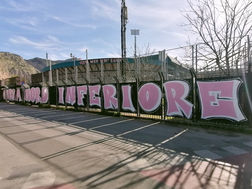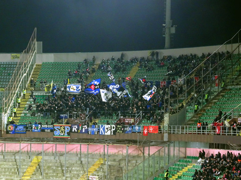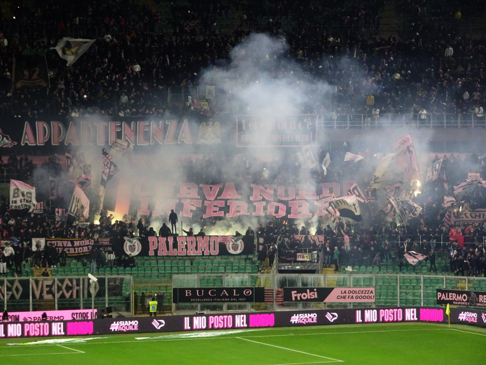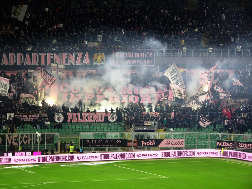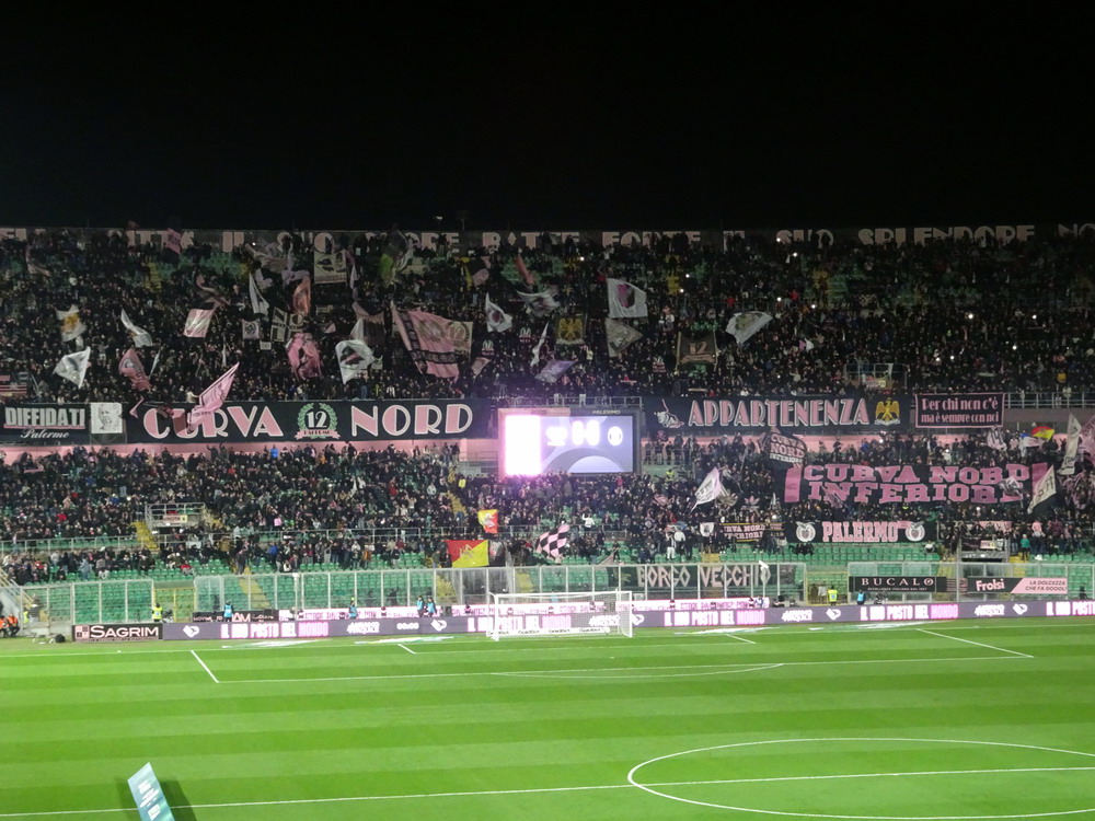 Nach einer phänomenalen Pizza und anschließendem kurzem Ausruhen in der Unterkunft war es dann auch schon Zeit in Richtung des ‚Stadio Renzo Barbera‘ aufzubrechen. Bevor wir den Kessel betraten, trafen wir uns in dessen Nähe zunächst in einer Bar auf ein paar weitere Durstlöscher mit einem Weggefährten, den ich zufällig morgens im Flieger entdeckt hatte. Das ‚Renzo Barbera‘ gehört zu den Spielorten der WM 1990 und seit dem Turnier dürfte nur das nötigste erneuert worden sein. Eigentlich ist es ein funktionaler Bau, der aber das Stadionherz dennoch schneller schlagen lässt. Als reines Fußballstadion angelegt, kommt es mit leicht gekrümmten Hintertor-Tribünen ohne rechte Winkel aus. Der Oberrang ist im steilen Winkel errichtet und wie bei den meisten Stadion Italiens, bei jenen älteren Baujahres sowieso, verfügt nur die Haupttribüne über ein schützendes Dach. Hinter der Gegengeraden baut sich eine schöne Felskulisse aus, welche dem Besucher in der Dunkelheit aber leider verborgen bleibt. Mit dem Tabellenzweiten aus Pisa stellte sich für die Gastgeber in den seltenen aber traditionellen Clubfarben Rosa und Schwarz ein Schwergewicht vor. Aus der Stadt mit dem berühmten Turm mit der noch berühmteren Neigung waren knapp 500 Tifosi angereist, für einen Freitag beachtlich. Nach ausgeglichenem Start gewannen die Gäste die Oberhand, die sie auch nie mehr abgeben sollten. Nach wenigen Minuten erzielten die Gäste, die mit vier Dänen in der Anfangsformation antraten, die Führung per Strafstoß und Mitte der ersten Hälfte einen weiteren Treffer. Diese Hypothek konnte Palermo nie ablösen, auch wenn der Anschlusstreffer nach einer Stunde Spielzeit Spannung in die Partie brachte. Mit dem Schlusspfiff durften sich die Gastgeber von der sonst ausdauernd supportenden ‚Curva Nord‘, die sich zu Ehren ihres vor wenigen Jahren früh verstorbenen Kult-Capo ‚Toto Rambo‘ nach diesem benannt hat, einige Pfiffe anhören, während die Pisani ihren Sieg vor dem Gästeblock feierten.