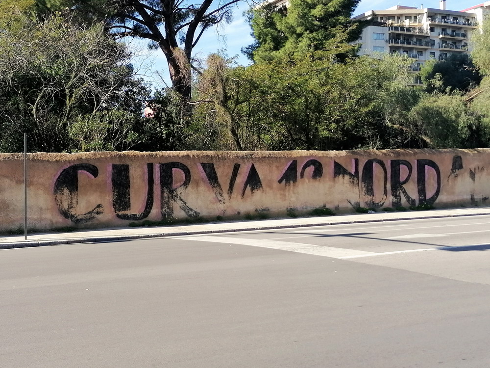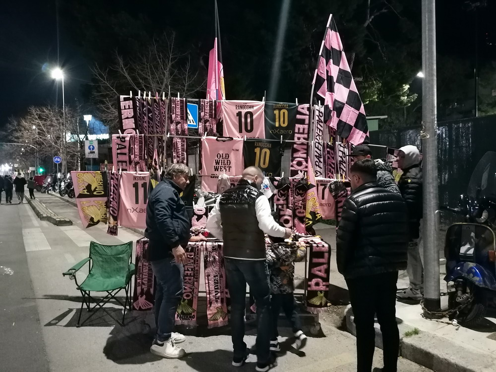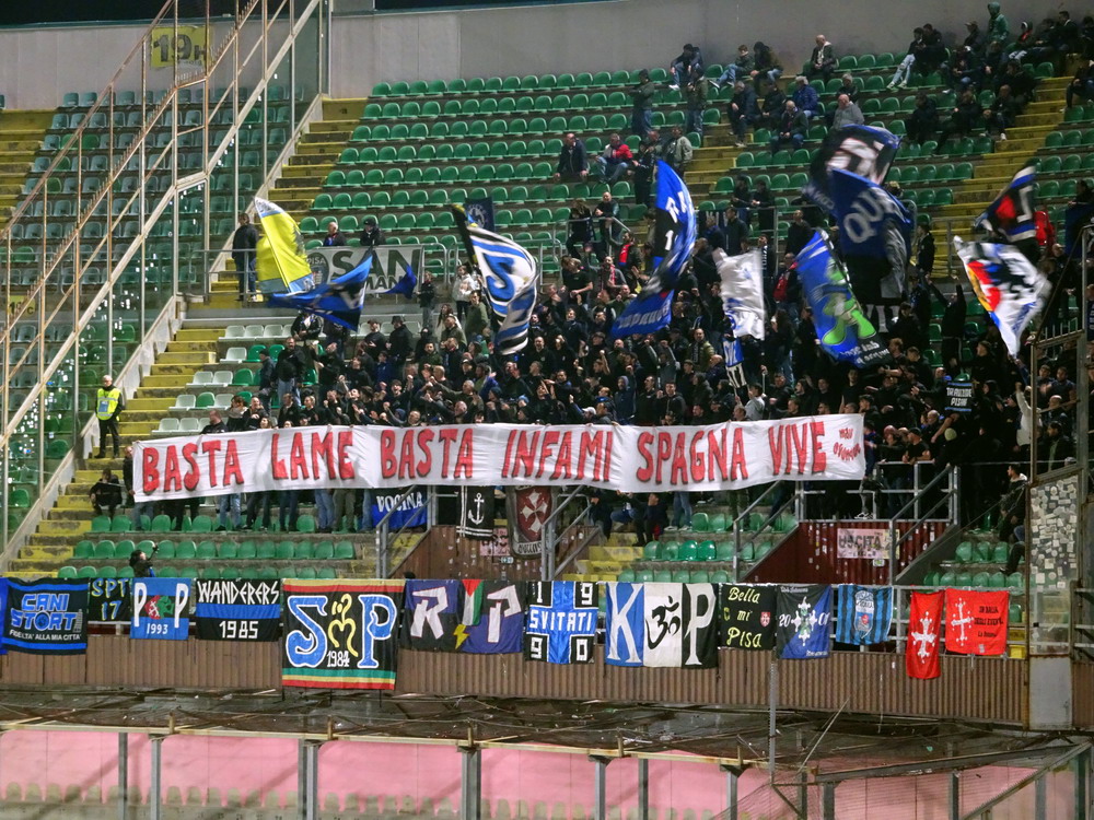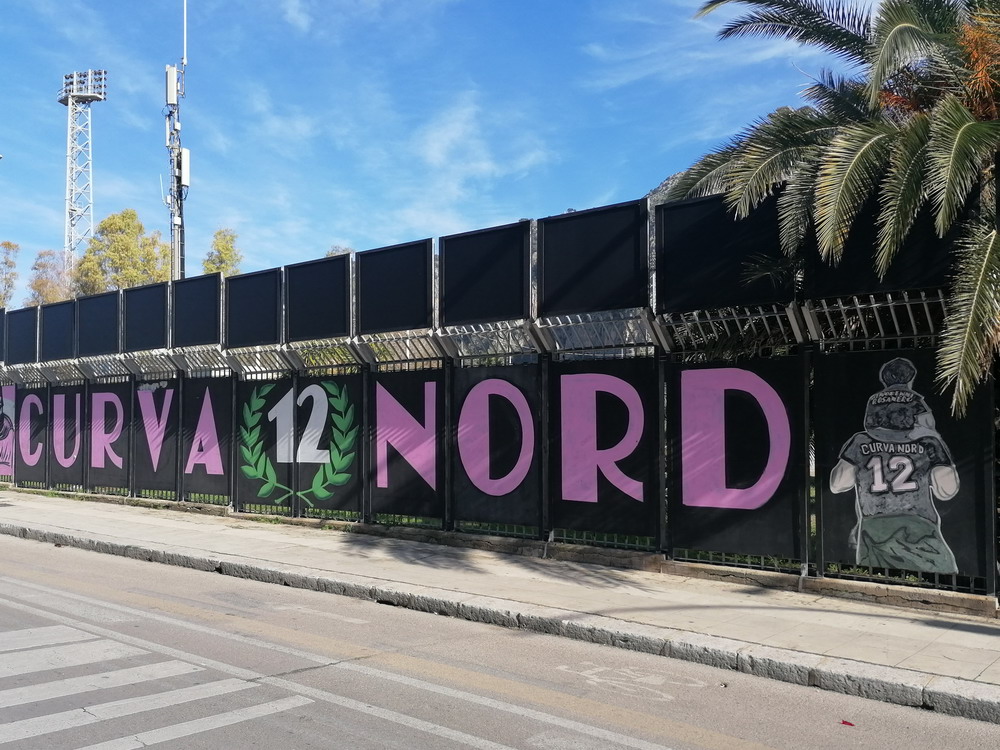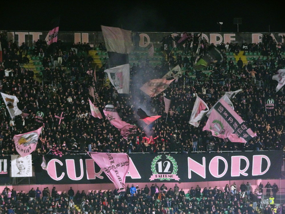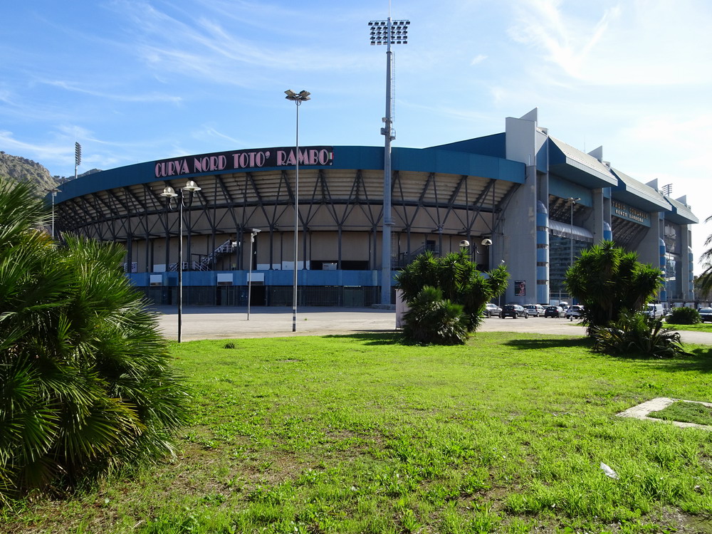 Nach einer phänomenalen Pizza und anschließendem kurzem Ausruhen in der Unterkunft war es dann auch schon Zeit in Richtung des ‚Stadio Renzo Barbera‘ aufzubrechen. Bevor wir den Kessel betraten, trafen wir uns in dessen Nähe zunächst in einer Bar auf ein paar weitere Durstlöscher mit einem Weggefährten, den ich zufällig morgens im Flieger entdeckt hatte. Das ‚Renzo Barbera‘ gehört zu den Spielorten der WM 1990 und seit dem Turnier dürfte nur das nötigste erneuert worden sein. Eigentlich ist es ein funktionaler Bau, der aber das Stadionherz dennoch schneller schlagen lässt. Als reines Fußballstadion angelegt, kommt es mit leicht gekrümmten Hintertor-Tribünen ohne rechte Winkel aus. Der Oberrang ist im steilen Winkel errichtet und wie bei den meisten Stadion Italiens, bei jenen älteren Baujahres sowieso, verfügt nur die Haupttribüne über ein schützendes Dach. Hinter der Gegengeraden baut sich eine schöne Felskulisse aus, welche dem Besucher in der Dunkelheit aber leider verborgen bleibt. Mit dem Tabellenzweiten aus Pisa stellte sich für die Gastgeber in den seltenen aber traditionellen Clubfarben Rosa und Schwarz ein Schwergewicht vor. Aus der Stadt mit dem berühmten Turm mit der noch berühmteren Neigung waren knapp 500 Tifosi angereist, für einen Freitag beachtlich. Nach ausgeglichenem Start gewannen die Gäste die Oberhand, die sie auch nie mehr abgeben sollten. Nach wenigen Minuten erzielten die Gäste, die mit vier Dänen in der Anfangsformation antraten, die Führung per Strafstoß und Mitte der ersten Hälfte einen weiteren Treffer. Diese Hypothek konnte Palermo nie ablösen, auch wenn der Anschlusstreffer nach einer Stunde Spielzeit Spannung in die Partie brachte. Mit dem Schlusspfiff durften sich die Gastgeber von der sonst ausdauernd supportenden ‚Curva Nord‘, die sich zu Ehren ihres vor wenigen Jahren früh verstorbenen Kult-Capo ‚Toto Rambo‘ nach diesem benannt hat, einige Pfiffe anhören, während die Pisani ihren Sieg vor dem Gästeblock feierten.