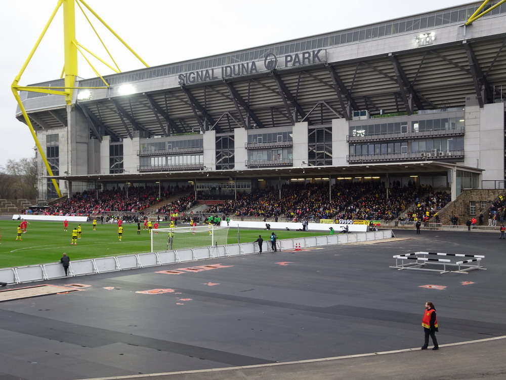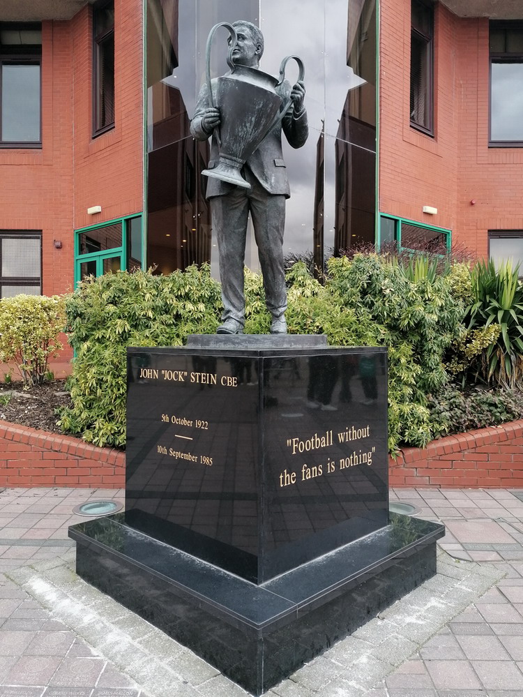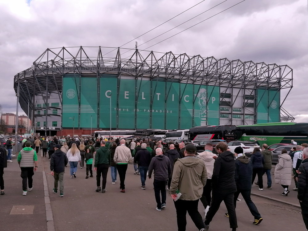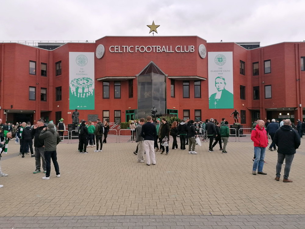Guinnes-verträumt etwas mühsam aus dem Bett gestiegen, trafen wir uns am Vormittag mit den Mitgliedern des ‚MacConnells Celtic Supporters Club‘, einem von 603 offiziellen Celtic Fanclubs weltweit, in der gleichnamigen Bar. Die Jungs chartern immer einen Bus für die kurze Fahrt vom Pub zum Stadion in Parkhead, den auch wir nutzen durften. Das zweite ‚Old Firm‘ der laufenden Saison mit Heimrecht für Celtic stand an und das zweite Mal durfte ich dabei sein. Ebenso natürlich die verehrte Frau Gemahlin, damit sie auch mal die Magie dieses Spieles erleben konnte. In einer Liga, in welcher nach Celtic und den Rangers lange nichts kommt, und in der auch die Grün-Weißen ihren blauen Rivalen in den letzten Jahren auf Strecke meist deutlich überlegen waren, ist dieses Spiel natürlich ein besonderes. Aber eben nicht nur aufgrund der sportlichen Situation, sondern bekanntermaßen aus der Historie heraus. Auch wenn die Zeiten, in denen auf der einen Seite nur Katholiken und auf der anderen nur Protestanten spielten, schon Jahrzehnte vorbei sind, ist diese Partie eine Frage des Glaubens wie der Politik. Und obwohl man sich in der Liga vier Male pro Saison misst und dazu in den beiden Pokal-Wettbewerben meistens auch noch aufeinandertrifft, ist die Atmosphäre um die Partie besonders und knisternd. Wenn man sich dem von Grund auf errichteten ‚Celtic Park‘ nähert, macht das ja immer wieder Eindruck – der hochaufragende Bau bestimmt die Silhouette des Stadtteils.