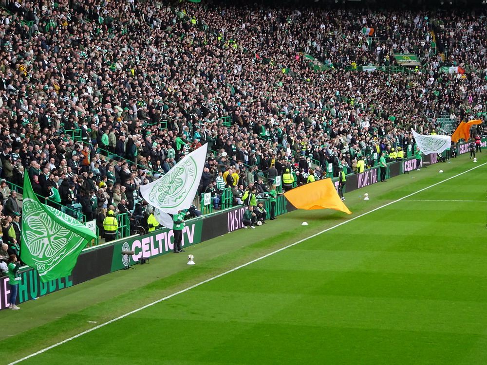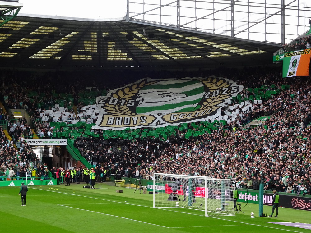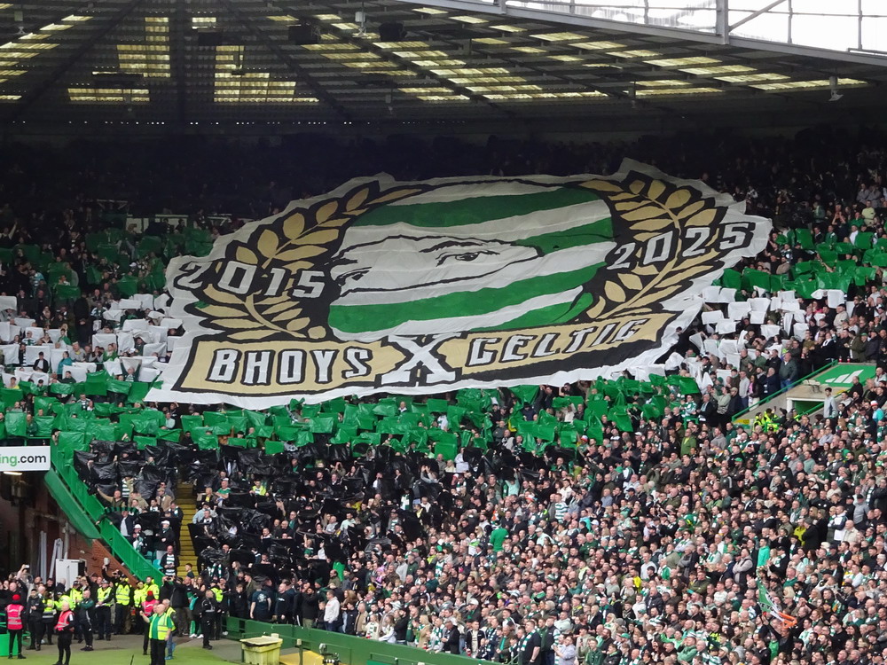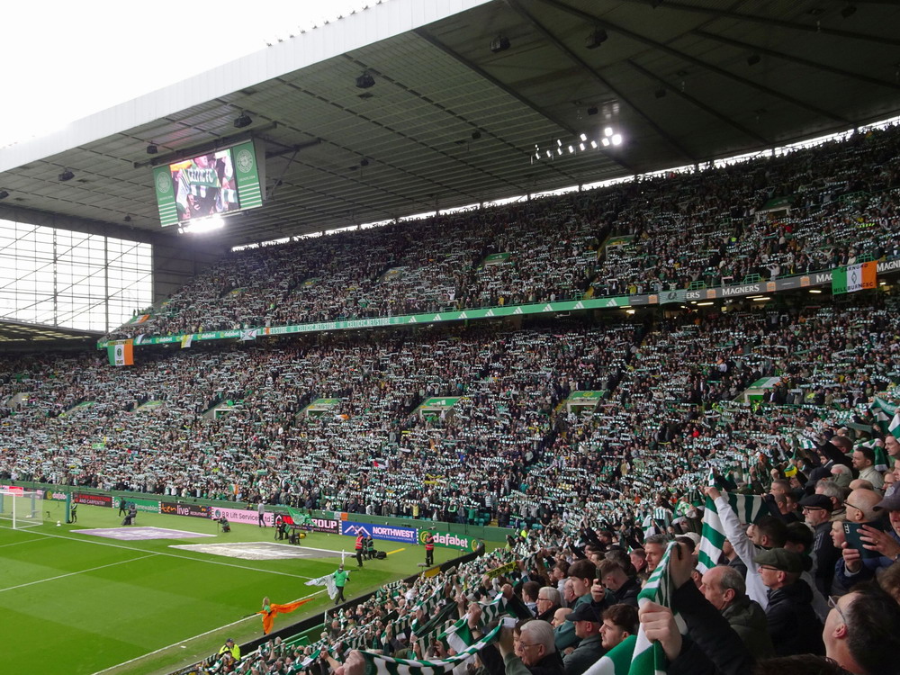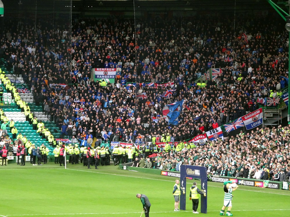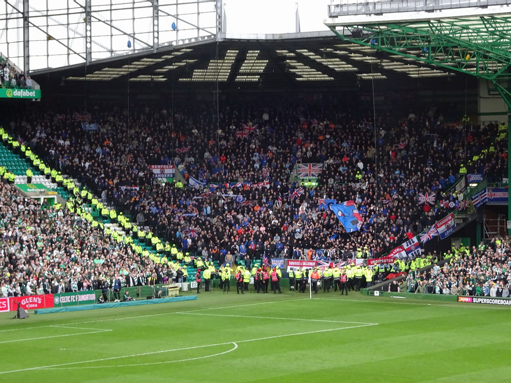 Seit 2023 waren zum ersten Mal wieder Gäste-Fans anwesend. Nachdem die Kontingente in einer „Wie Du mir, so ich Dir“-Mentalität immer weiter reduziert wurden, bis es schließlich zum kompletten Ausschluss kann, einigte man sich für diese Saison wieder auf ein Away-Kontingent, aber es dauerte bis zum dritten Vergleich, bis die Absichten Realität wurden. Gut so, denn auch davon lebt die Mystik dieser Spielpaarung. 2.400 Hunnen waren gekommen und dennoch hatte ich die Stimmung aus dem vergangenen Jahr deutlich besser in Erinnerung. Dass nach einem wieder einmal ohrenbetäubenden, Gänsehaut erregenden „You’ll never walk alone“ dann der Stimmungsfunke im Stadion nicht so übersprang, hatte mehrere Gründe. Die Rangers-Supporter um die ‚Union Bears‘ mühten sich im Eckblock zwar, hätten nach meinem Geschmack für ihre Anzahl aber lauter sein dürfen. Die ‚Bhoys Celtic‘ zeigten in ihrem Eck zwar eine Choreo, aber die Gruppe selber ist nicht besonders groß, hat einen nach meiner Meinung unglücklichen Standort und vermag es nur selten, die Umstehenden in die Gesänge einzubinden. Daher ist für das Stimmungsbarometer in der Regel die ‚Green Brigade‘ zuständig. Diese fehlte aber heute, die angestammten Reihen der etwa 250-300 Köpfe starken Gruppierung blieben verwaist. Der Grund war eine polizeiliche Maßnahme am Treffpunkt der Gruppe, dem Social Club der ‚Celtic Supporters Association‘. Die Police verlangte nach präventiver Durchsuchung und Personalienfeststellung zur Vermeidung von Straftaten. Derart willkürliche Aktionen akzeptiert keine Ultra-Gruppierung der Welt und als Folge entschied man sich, dem Spiel fernzubleiben, respektive man musste fernbleiben. Soweit die vereinfachte Version, insgesamt ist die Geschichte komplizierter und hat mit der auflebenden und sich vergrößernden Ultra-Szenerie in Schottland zu tun, welche die Staatsorgane gerne kleinhalten oder am besten ganz ersticken möchten, wie man es auch aus anderen Ländern kennt.
