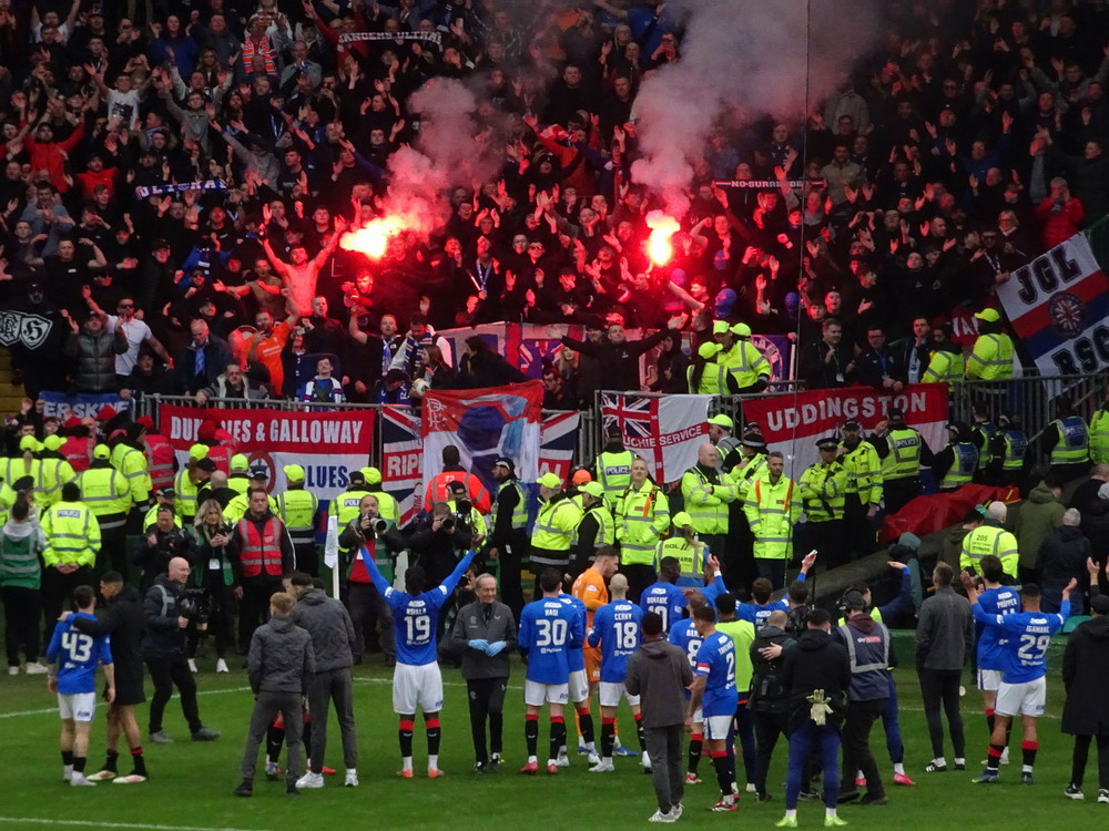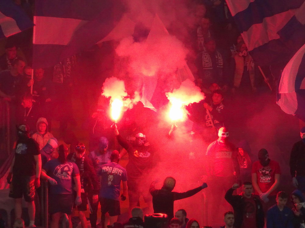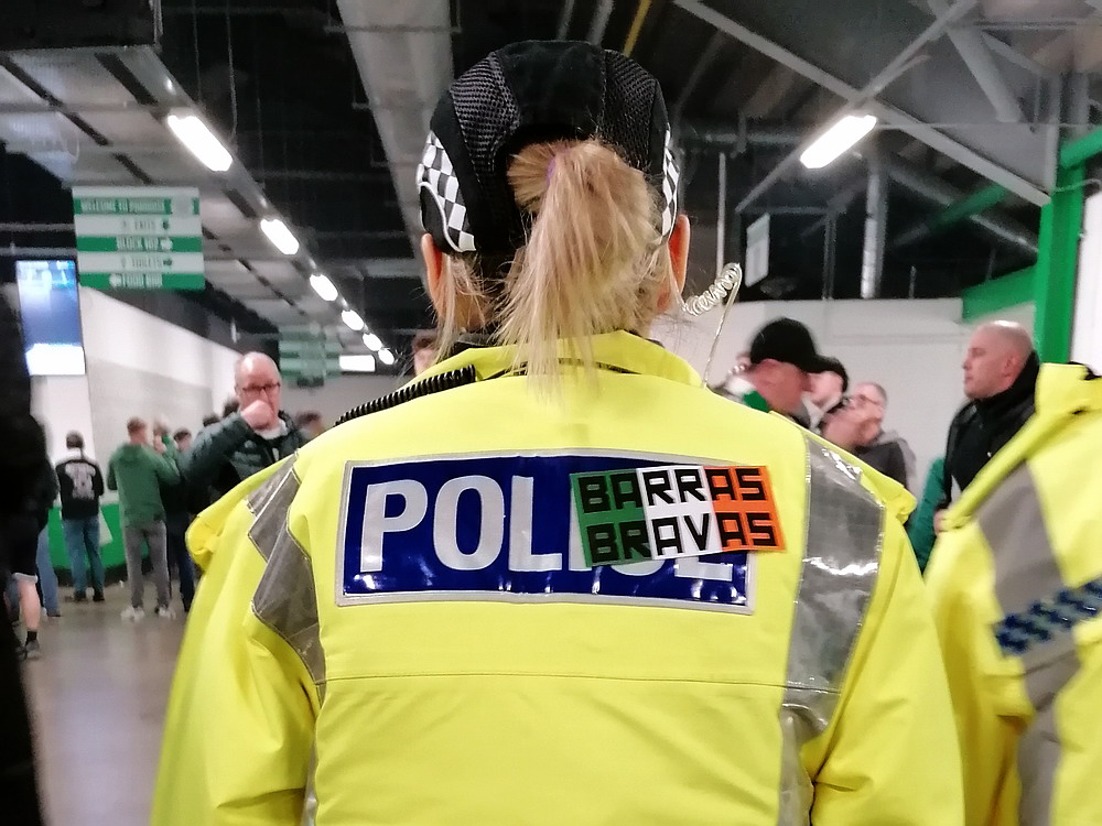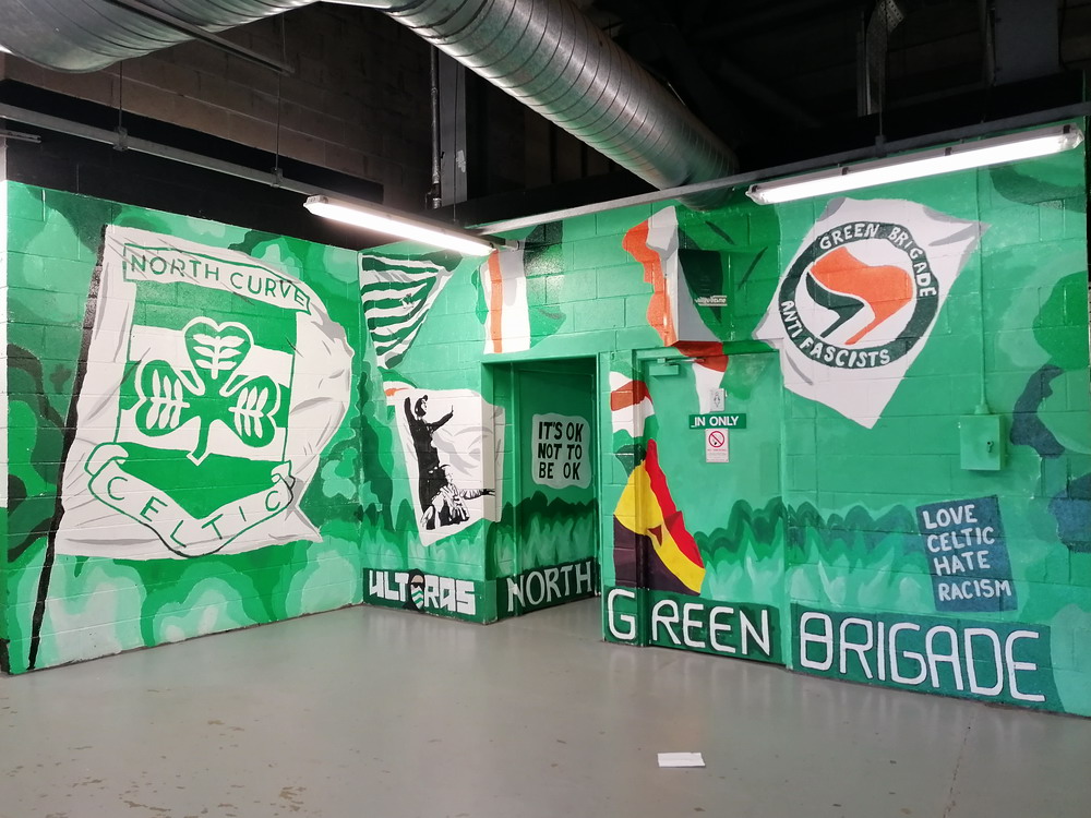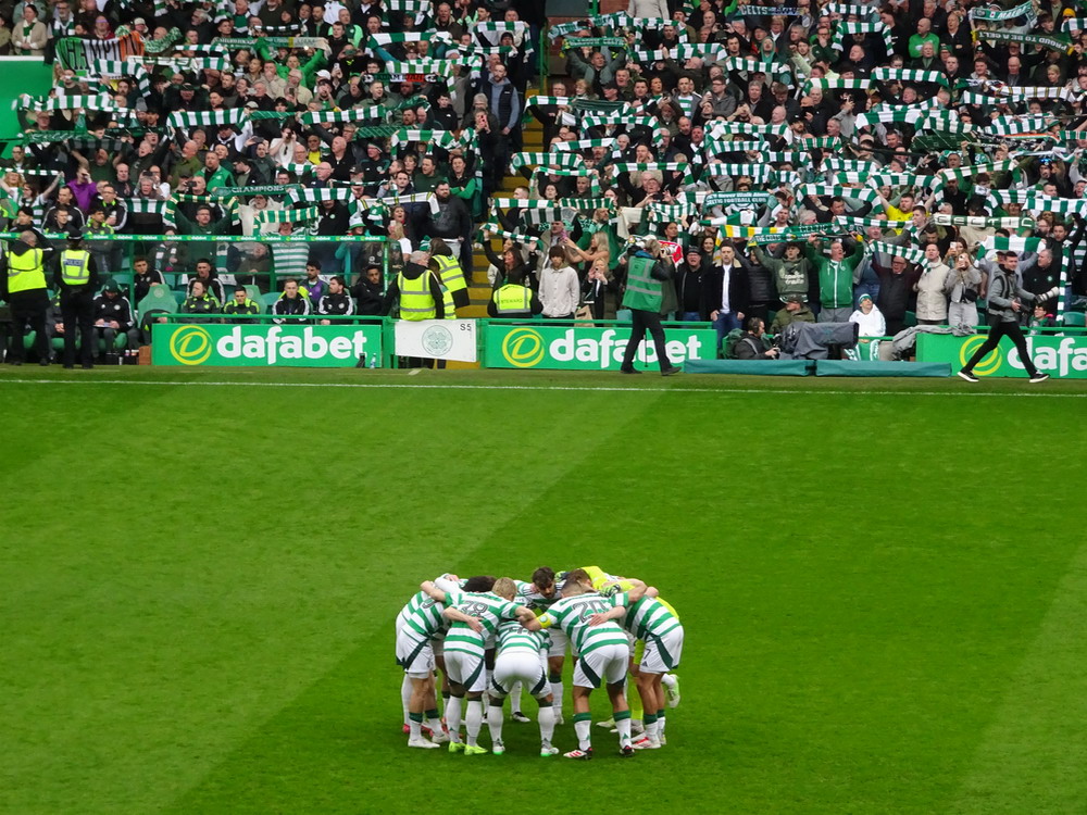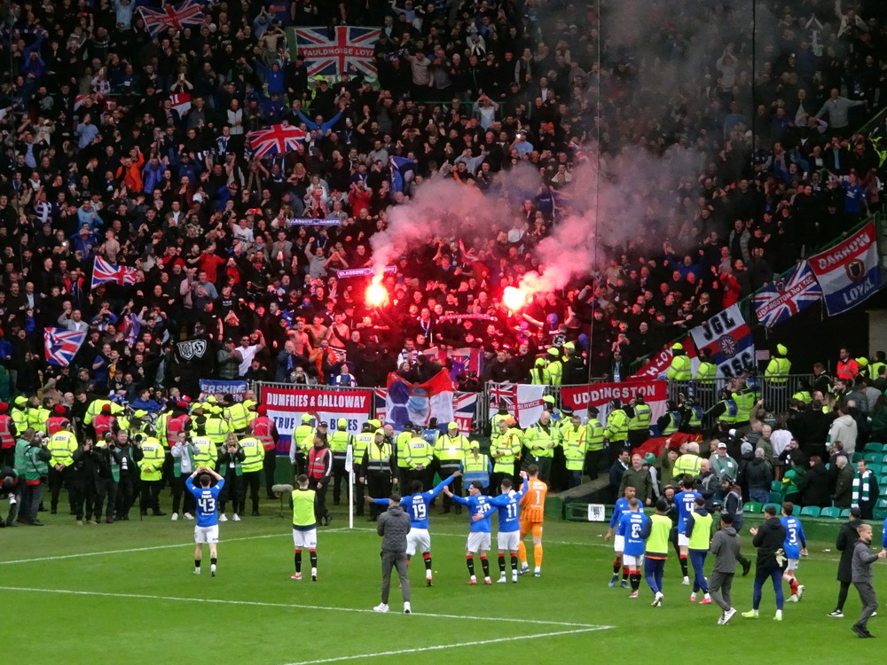 Seit 2023 waren zum ersten Mal wieder Gäste-Fans anwesend. Nachdem die Kontingente in einer „Wie Du mir, so ich Dir“-Mentalität immer weiter reduziert wurden, bis es schließlich zum kompletten Ausschluss kann, einigte man sich für diese Saison wieder auf ein Away-Kontingent, aber es dauerte bis zum dritten Vergleich, bis die Absichten Realität wurden. Gut so, denn auch davon lebt die Mystik dieser Spielpaarung. 2.400 Hunnen waren gekommen und dennoch hatte ich die Stimmung aus dem vergangenen Jahr deutlich besser in Erinnerung. Dass nach einem wieder einmal ohrenbetäubenden, Gänsehaut erregenden „You’ll never walk alone“ dann der Stimmungsfunke im Stadion nicht so übersprang, hatte mehrere Gründe. Die Rangers-Supporter um die ‚Union Bears‘ mühten sich im Eckblock zwar, hätten nach meinem Geschmack für ihre Anzahl aber lauter sein dürfen. Die ‚Bhoys Celtic‘ zeigten in ihrem Eck zwar eine Choreo, aber die Gruppe selber ist nicht besonders groß, hat einen nach meiner Meinung unglücklichen Standort und vermag es nur selten, die Umstehenden in die Gesänge einzubinden. Daher ist für das Stimmungsbarometer in der Regel die ‚Green Brigade‘ zuständig. Diese fehlte aber heute, die angestammten Reihen der etwa 250-300 Köpfe starken Gruppierung blieben verwaist. Der Grund war eine polizeiliche Maßnahme am Treffpunkt der Gruppe, dem Social Club der ‚Celtic Supporters Association‘. Die Police verlangte nach präventiver Durchsuchung und Personalienfeststellung zur Vermeidung von Straftaten. Derart willkürliche Aktionen akzeptiert keine Ultra-Gruppierung der Welt und als Folge entschied man sich, dem Spiel fernzubleiben, respektive man musste fernbleiben. Soweit die vereinfachte Version, insgesamt ist die Geschichte komplizierter und hat mit der auflebenden und sich vergrößernden Ultra-Szenerie in Schottland zu tun, welche die Staatsorgane gerne kleinhalten oder am besten ganz ersticken möchten, wie man es auch aus anderen Ländern kennt.