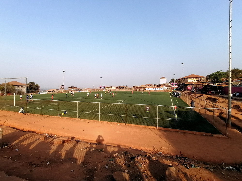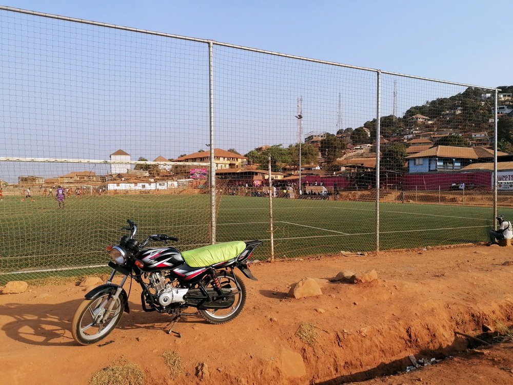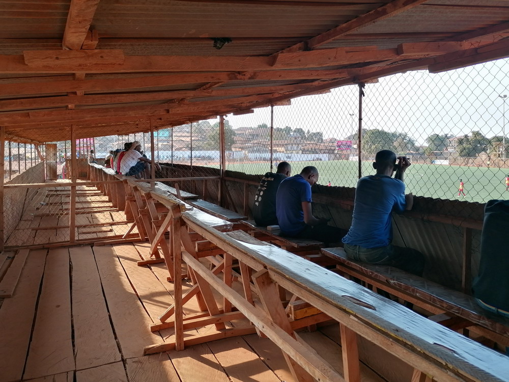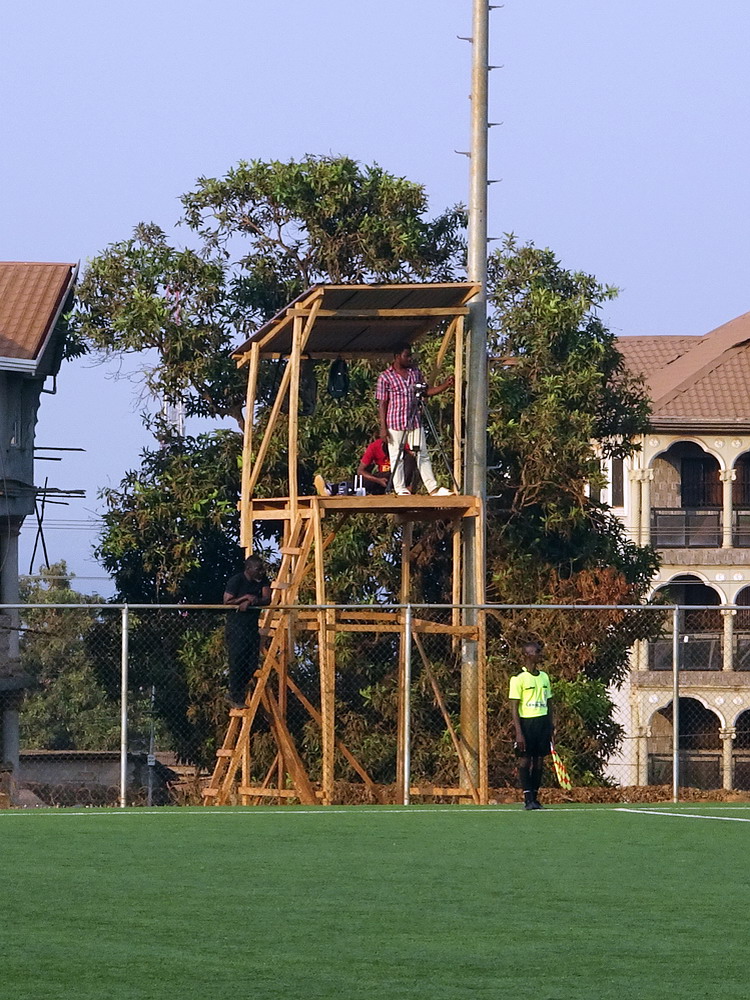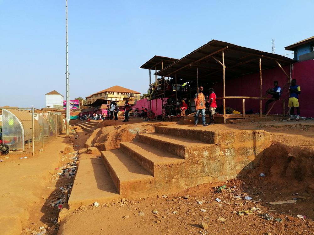 Ein wenig ausgeruht und frischgemacht, war es schon Zeit, zum ersten Spiel aufzubrechen. Dafür müssten wir die halbe Stadt durchqueren und wählten ein Tuk-Tuk. Ich mag die Dinger ja, aber in dem offenen Gefährt kommt man bei der abgasgeschwängerten Luft afrikanischer Großstädte dem Krebstod auch deutlich näher. Auf der ‚Bai Bureh Road‘, der großen vierspurigen Ausfallstraße, sprangen wir aus dem klapprigen Gefährt und mussten noch durch ein paar richtig abgefuckte Straßen laufen, ehe wir am ‚Approved School Ground‘ ankamen. Freetown City gegen Mighty Blackpool hieß die Paarung der Sierra Leone Premier League. Bis vor zwei, drei Jahren wurde hier noch auf Sand gespielt und der Ausbau ist auch etwas, nennen wir es mal rustikal. Etwas wild angeordnet gibt es in den Lehmboden geschnittene Stufen, gemauerte Stehränge und eine kleine Stahlrohr-Sitztribüne. Besonders speziell ist der erhöht errichtete ‚VIP-Bereich‘, welcher eher an eine Kreuzung aus Hühnerstall und Arrestzelle erinnert. Von Premier ist diese League halt noch weit entfernt, Sierra Leone ist ein Fußball-Entwicklungsland. Vielleicht 50 Leute hatten sich zum Anpfiff eingefunden, im Laufe des Spiels wuchs diese Zahl dann an. Bei den fliegenden Händlerinnen konnten wir uns mit ein paar kühlen Star-Bieren versorgen und verfolgten den bescheidenen Kick aus dem Schatten eines wackligen Pavillons. Der City FC, das Team des City Council, ging im ersten Durchgang in Führung und stellte mit dem zweiten Treffer zehn Minuten vor Ende vermeintlich auf Sieg. Aber die Mächtigen aus Blackpool kamen mächtig zurück, erzielten zügig den Anschluss und in der Nachspielzeit noch den umjubelten Ausgleich. Wie wir hergekommen waren, ging es zurück und auf der Suche nach etwas Essbarem zu einem African-Style KFC-Verschnitt. Nach der Rückkehr ins Hotel gab es dort noch zwei Schlummer-Biere, welche den Tag abschlossen.