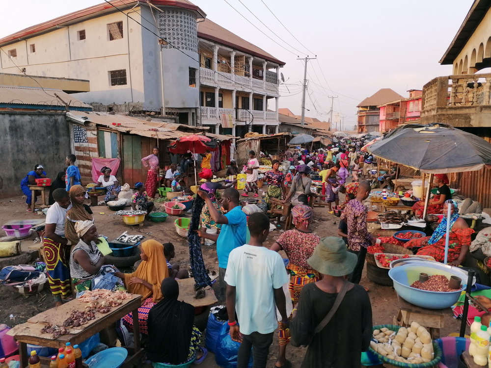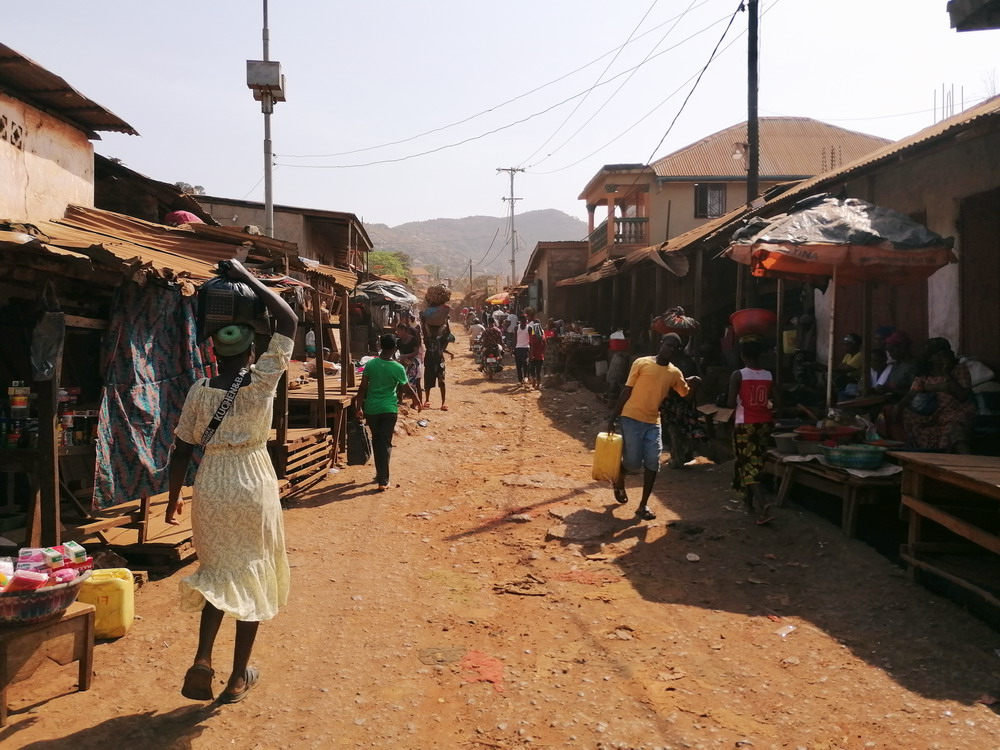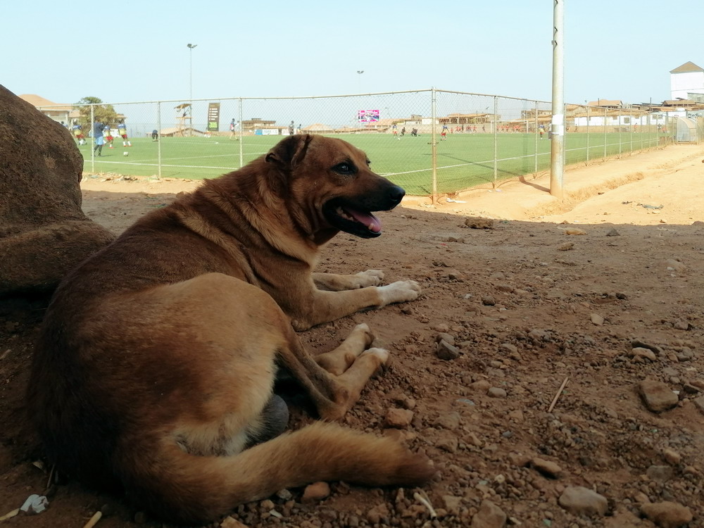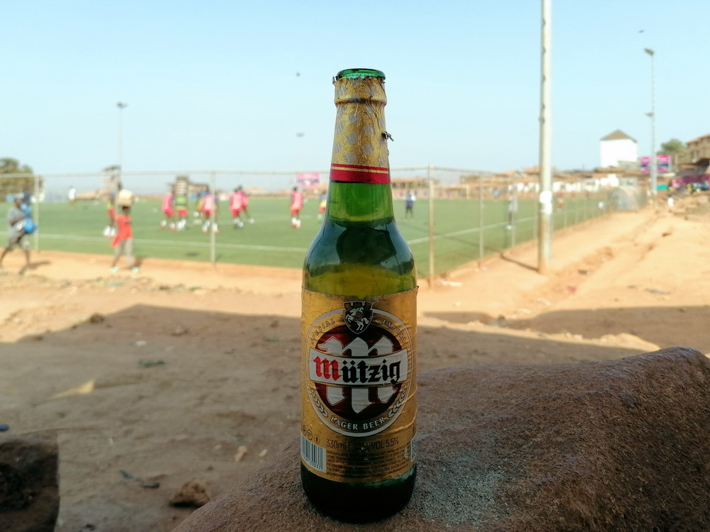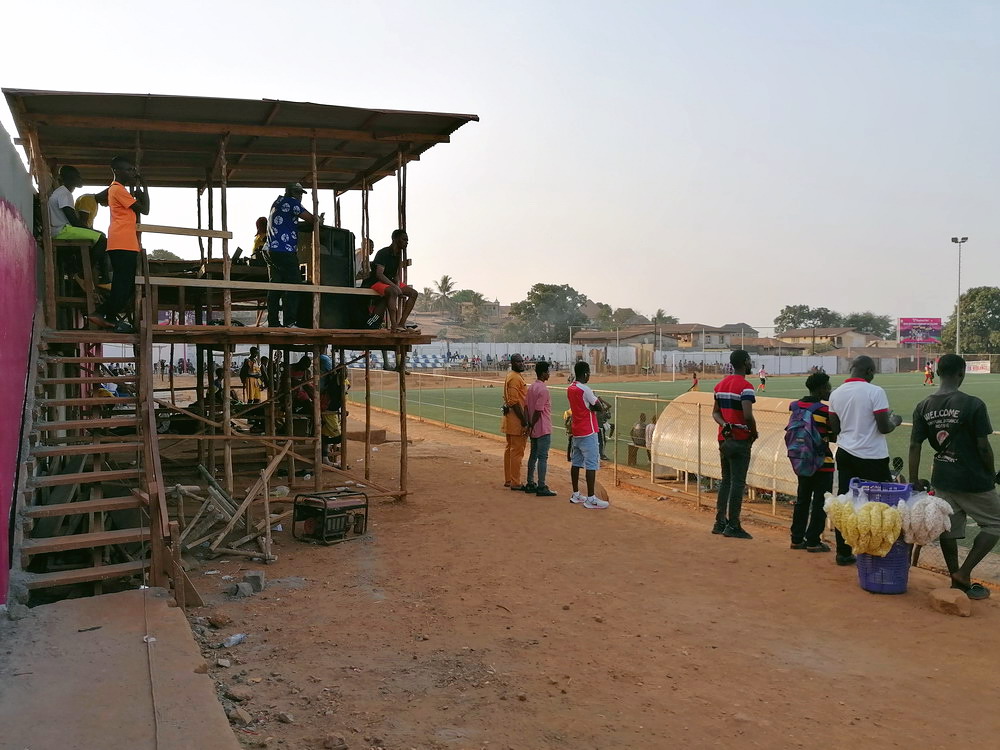 Ein wenig ausgeruht und frischgemacht, war es schon Zeit, zum ersten Spiel aufzubrechen. Dafür müssten wir die halbe Stadt durchqueren und wählten ein Tuk-Tuk. Ich mag die Dinger ja, aber in dem offenen Gefährt kommt man bei der abgasgeschwängerten Luft afrikanischer Großstädte dem Krebstod auch deutlich näher. Auf der ‚Bai Bureh Road‘, der großen vierspurigen Ausfallstraße, sprangen wir aus dem klapprigen Gefährt und mussten noch durch ein paar richtig abgefuckte Straßen laufen, ehe wir am ‚Approved School Ground‘ ankamen. Freetown City gegen Mighty Blackpool hieß die Paarung der Sierra Leone Premier League. Bis vor zwei, drei Jahren wurde hier noch auf Sand gespielt und der Ausbau ist auch etwas, nennen wir es mal rustikal. Etwas wild angeordnet gibt es in den Lehmboden geschnittene Stufen, gemauerte Stehränge und eine kleine Stahlrohr-Sitztribüne. Besonders speziell ist der erhöht errichtete ‚VIP-Bereich‘, welcher eher an eine Kreuzung aus Hühnerstall und Arrestzelle erinnert. Von Premier ist diese League halt noch weit entfernt, Sierra Leone ist ein Fußball-Entwicklungsland. Vielleicht 50 Leute hatten sich zum Anpfiff eingefunden, im Laufe des Spiels wuchs diese Zahl dann an. Bei den fliegenden Händlerinnen konnten wir uns mit ein paar kühlen Star-Bieren versorgen und verfolgten den bescheidenen Kick aus dem Schatten eines wackligen Pavillons. Der City FC, das Team des City Council, ging im ersten Durchgang in Führung und stellte mit dem zweiten Treffer zehn Minuten vor Ende vermeintlich auf Sieg. Aber die Mächtigen aus Blackpool kamen mächtig zurück, erzielten zügig den Anschluss und in der Nachspielzeit noch den umjubelten Ausgleich. Wie wir hergekommen waren, ging es zurück und auf der Suche nach etwas Essbarem zu einem African-Style KFC-Verschnitt. Nach der Rückkehr ins Hotel gab es dort noch zwei Schlummer-Biere, welche den Tag abschlossen.