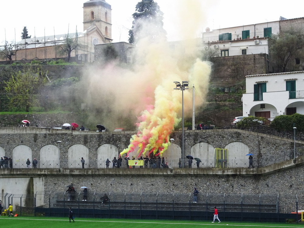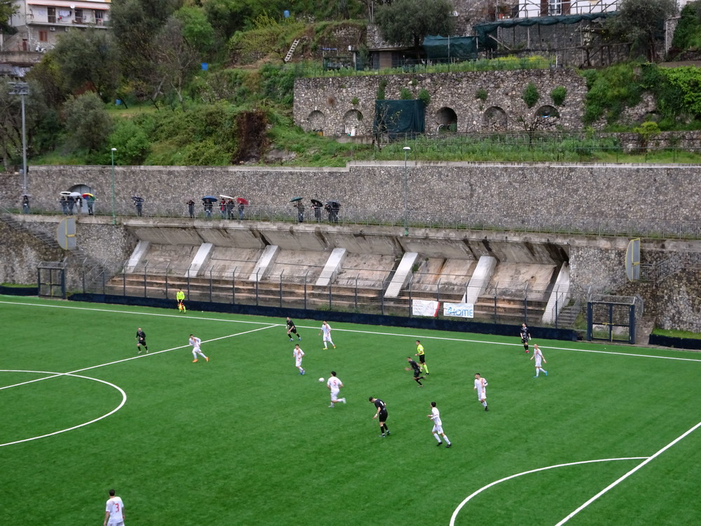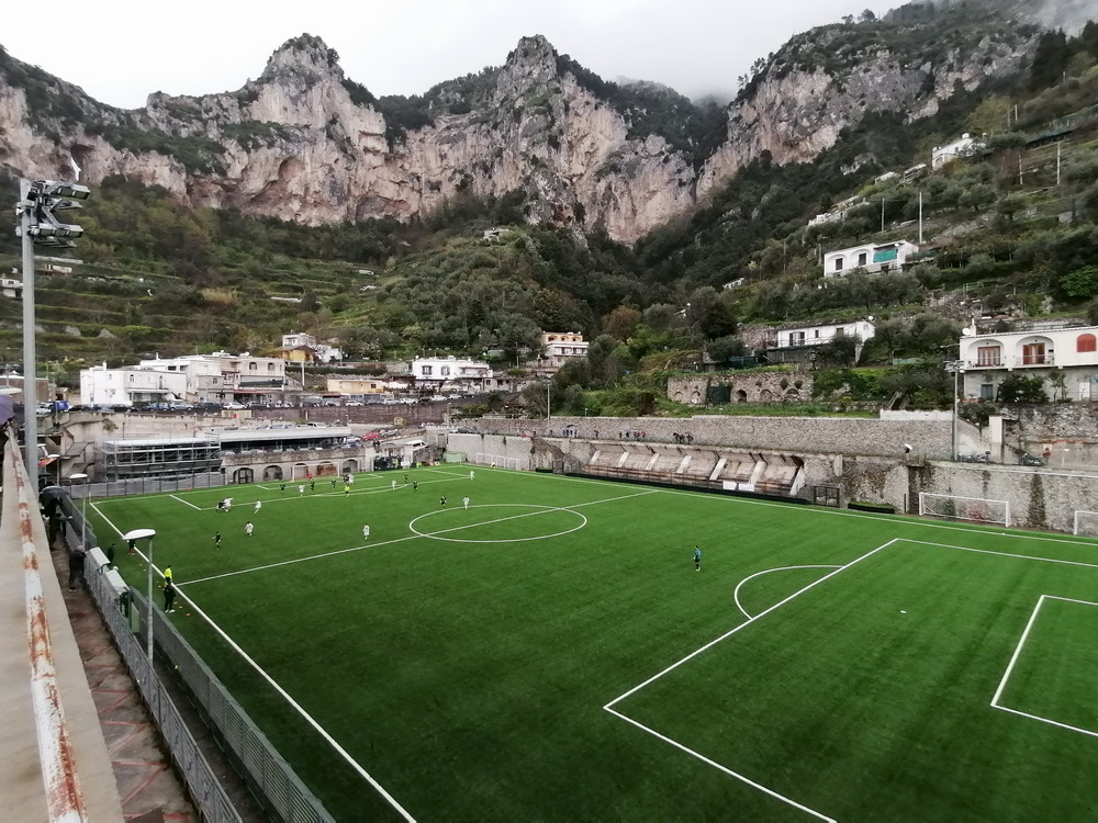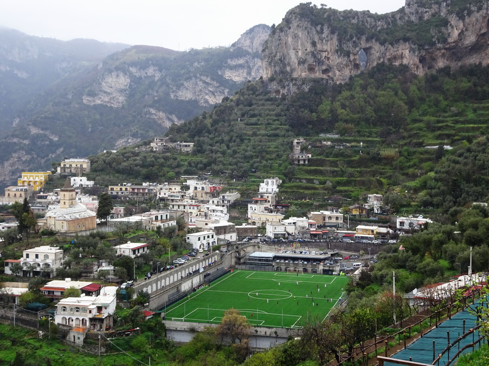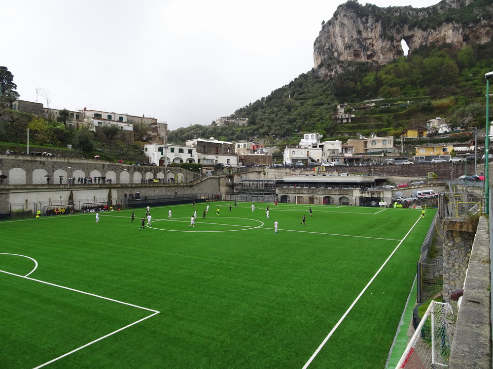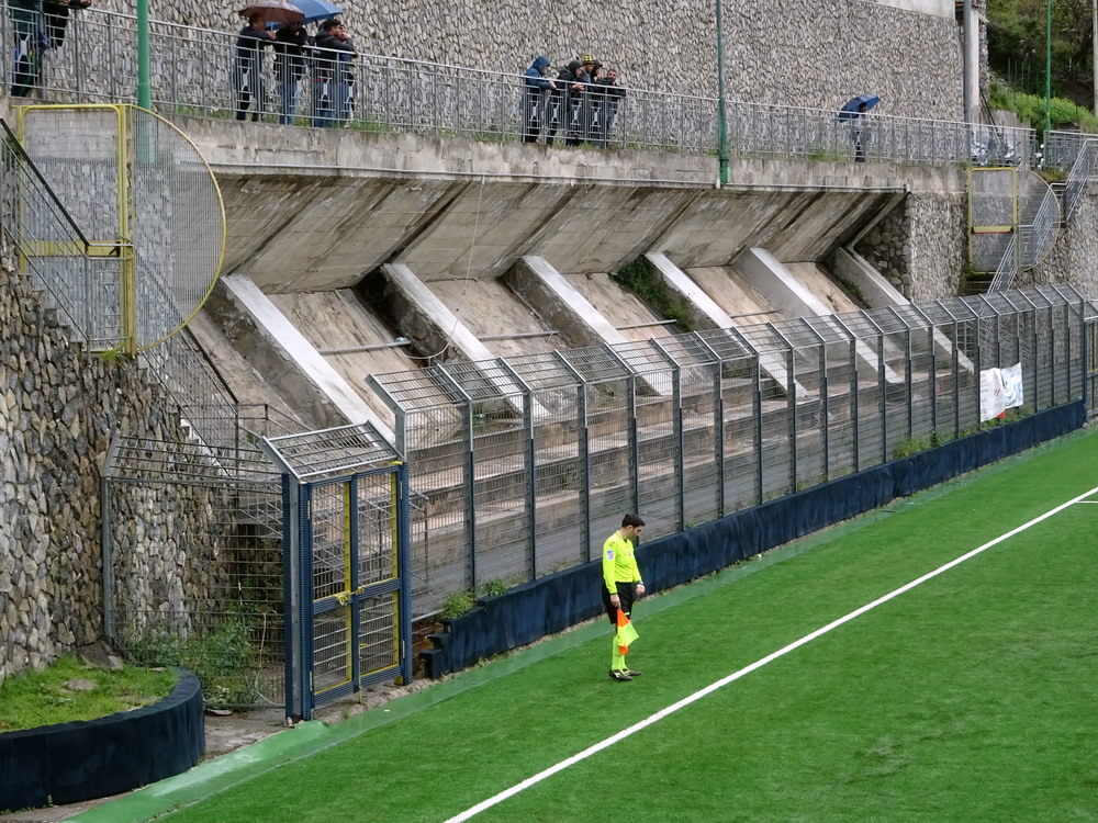 Nur gute 30 Stunden nach der Rückkehr aus Afrika hieß es schon wieder „Leinen los!“. Die Reise nach Bari war ursprünglich gar nicht als Fußball-Trip geplant, die Entwicklung nach der Buchung führte aber letztlich dazu, dass die Reise zu einer solchen wurde – dieses weiter auszuführen, würde den Rahmen sprengen. Da mich die Ansetzungen im Raum Bari nicht so abholten, verwirklichte ich die lange gehegte Idee in Kampanien mal ein paar unterklassige Spiele zu besuchen, denn dort werden ja viele Clubs von kleinen Ultra-Szenen unterstützt. Das Spiel in Monterpertuso nahe Positano bot zudem eine Spielstätte mit brachialer Gebirgskulisse, eines der wenigen Stadien, die auf meiner nicht sehr umfangreichen Must-have-Liste stehen, denn prinzipiell hat mein Weg ja keine strikte Linie, stattdessen lasse ich mich weitestgehend von meinen Launen treiben. Ein weiterer Positiv-Aspekt dieser Wahl war die Anfahrt entlang der malerischen Amalfi-Küste. Das heißt, hätte es sein sollen, denn in der benötigten Fahrzeit hatte ich mich deutlich geirrt. Auf der engen, kurvigen Küstenstraße regiert nicht die Langsamkeit, sondern die Hyper-Langsamkeit. Das Konglomerat aus begrenzten fahrerischen Fähigkeiten und der offensichtlichen Terminfreiheit der anderen Verkehrsteilnehmer nötigte mich schließlich zu einigen ‚The fast and the furios‘-haften Überholmanövern, um das Ziel pünktlich zu erreichen, was schließlich auch gelang. Leider war das Wetter nicht wohlgesonnen, so dass sich die Aura dieser wunderschönen Gegend nicht vollends entfalten konnte, aber auch regnerisches, wolkenreiches Wetter kann ja in gebirgigen Regionen eine Wirkung haben.