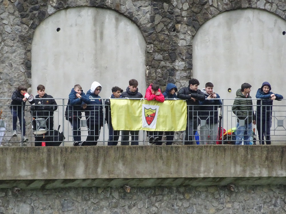 Mit Spielbeginn ließ der Regen nach und hörte wenig später ganz auf. Zur angesprochenen Kulisse rund um die Spielstätte braucht man nicht viel erläutern, die Bilder erübrigen jede Beschreibung. Das tiefgelegene Spielfeld vermittelt zudem den Eindruck einer Arena aus der Zeit des römischen Reiches, so dass man eher darauf wartet, dass die Löwen eingelassen werden, anstelle zweier Fußball-Teams. Die aus einem guten Dutzend Teenagern bestehende Anhängerschaft ließ Rauchsäulen in den Vereinsfarben in den beinahe windstillen Himmel aufsteigen und unterstützte die Mannschaft dann mehr oder weniger ausdauernd unter Anleitung eines Jung-Capos und eines Trommlers, der offensichtlich noch in der Lernphase ist. Der Support konnte mit den visuellen Rahmenbedingungen also nicht mithalten, aber der Wille war erkennbar. Immerhin ließ die Heimmannschaft ihre jugendlichen Fans über einen durchaus verdienten Dreier jubeln. Die Partie der zweithöchsten Regional-Spielklasse, landesweit sechstklassig, war unerwartet technisch anspruchsvoll und besser anzusehen, als manche Veranstaltung auf höherem Niveau.