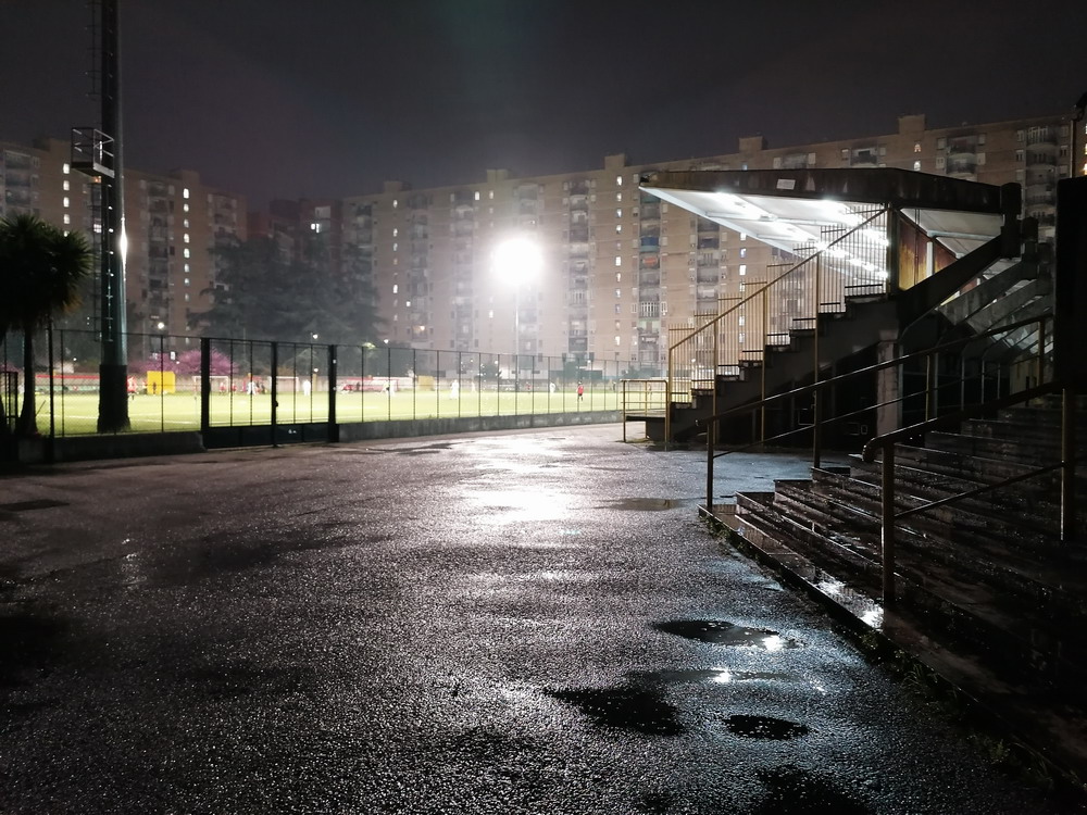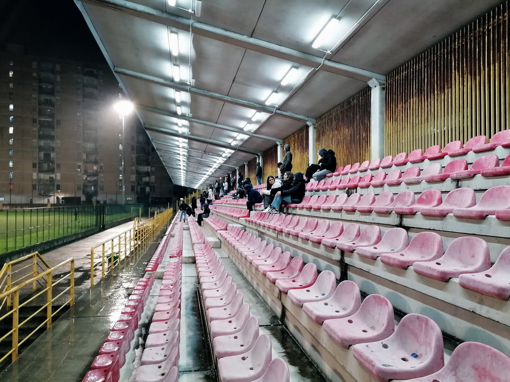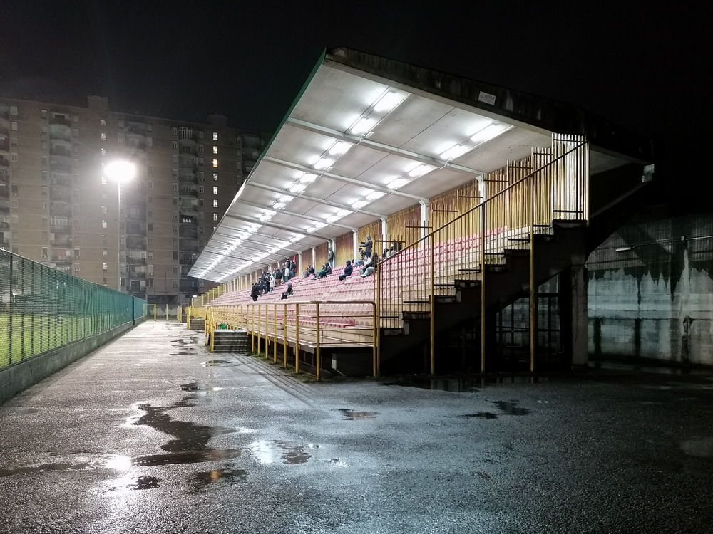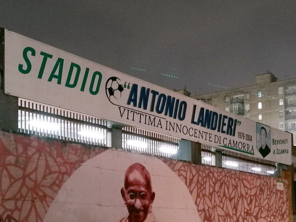 Durch die heraufbeschworene Zeitknappheit vor der vergangenen Partie musste ich die dringend notwendige Betankung des Miet-Vehiculums vernachlässigen. Die Internet-Recherche ergab, dass die vom Bordcomputer angezeigte Restkraftstoffmenge zum Erreichen der nächsten Tankstelle genügen sollte. Dem Computer war aber nicht bekannt, dass noch ein Höhenzug und die dadurch bedingte Steigung bezwungen werden wollte, was das Spritvolumen gefährlich zusammenschrumpfen ließ. Buchstäblich mit den letzten Tropfen Benzin im Tank rollte ich an die ersehnte Zapfsäule heran. Auf dem Weg zum zweiten Spiel des Tages checkte ich kurz in die Unterkunft ein und musste mich dann mit dem dichtem Verkehr der Metropolregien Napolis herumärgern, so dass ich erneut auf den letzten Drücker im ‚Stadio Antonio Landieri‘ eintraf, welches eingerahmt von hohen Wohnblöcken im Problem-Stadtteil Scampia liegt. Konsumenten der Netflix-Serie ‚Gomorrha‘ ist Scampia als sozialer Brennpunkt und Drogensumpf bekannt, was aber eben auch der Realität entspricht. Scampia ist ein Hotspot der ‚Camorra‘, ein von brutalen Wohnklötzen beherrschtes Viertel, in dem viele illegale, vor allem dem Roma-Volk zuzurechnende Menschen leben. Weiterhin ist eine Jugendarbeitslosigkeit von über 60% die beste Basis, um junge Menschen in die Strukturen von verbrecherischen Banden zu treiben. Der Namensgeber des Stadions wurde im Alter von 27 Jahren infolge einer Verwechslung von Handlangern der Camorra irrtümlich ermordet.