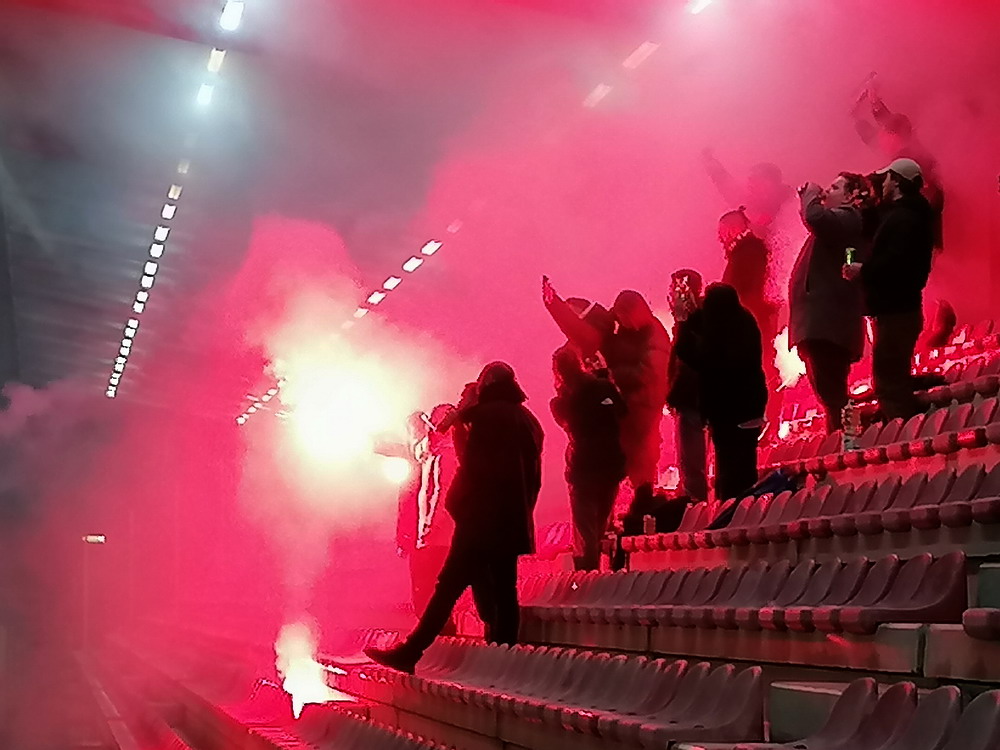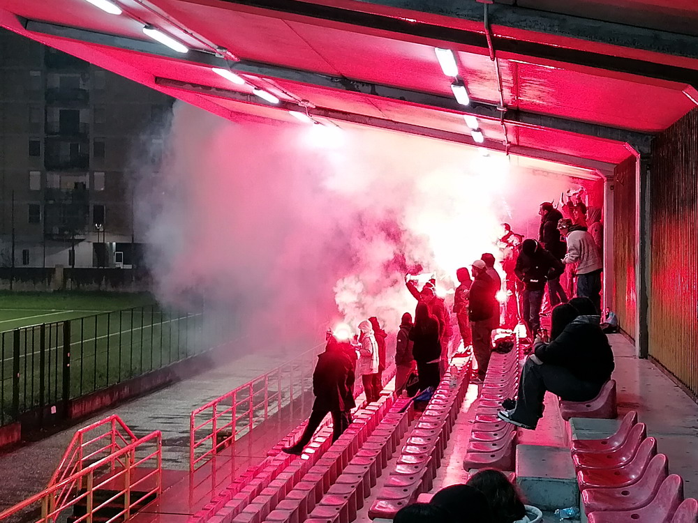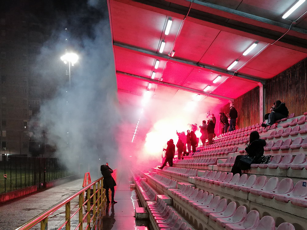 Das Spiel auf landesweit siebtklassigem Niveau war mäßig gut, aber spannend. Leider war der Regen zurückgekehrt, was es im Verbund mit unangenehm durch das Gewand pfeifendem Wind zu einer ungemütlichen Angelegenheit werden ließ. Die Halbzeitführung der Roten Sterne konnten die Gäste im zweiten Durchgang drehen. Nachdem der Torschütze zum 1:0 dann einen Elfmeter zum Ausgleich vergab, traf er in den Schlussminuten dann noch doppelt zum Sieg und avancierte damit zum ‚Man of the match‘. Und natürlich bejubelt vom unübersehbar dem linken Spektrum zugewandten Anhang, was ja auch schon der Vereinsname vermuten lässt. Etwa zwanzig Personen unterstützten ihre Mannschaft nach Kräften, was von den umliegenden vielgeschossigen Häusern ordentlich zurückschallte. Auch eine schöne Pyro-Aktion wurde während der ersten Hälfte eingestreut. Nach einer absolut genialen Pizza – auf die Gefahr, dass ich mich wiederhole, aber die in Italien servierten Pizzen sind mit dem zähen aus billigem Mehl gekneteten Gelumpe, das unsere indischen und arabischen Zuwanderer in den deutschen Schnellpizzerien lieblos zusammen matschen nicht im Ansatz zu vergleichen – zog ich mich in mein beheiztes Refugium zurück.
