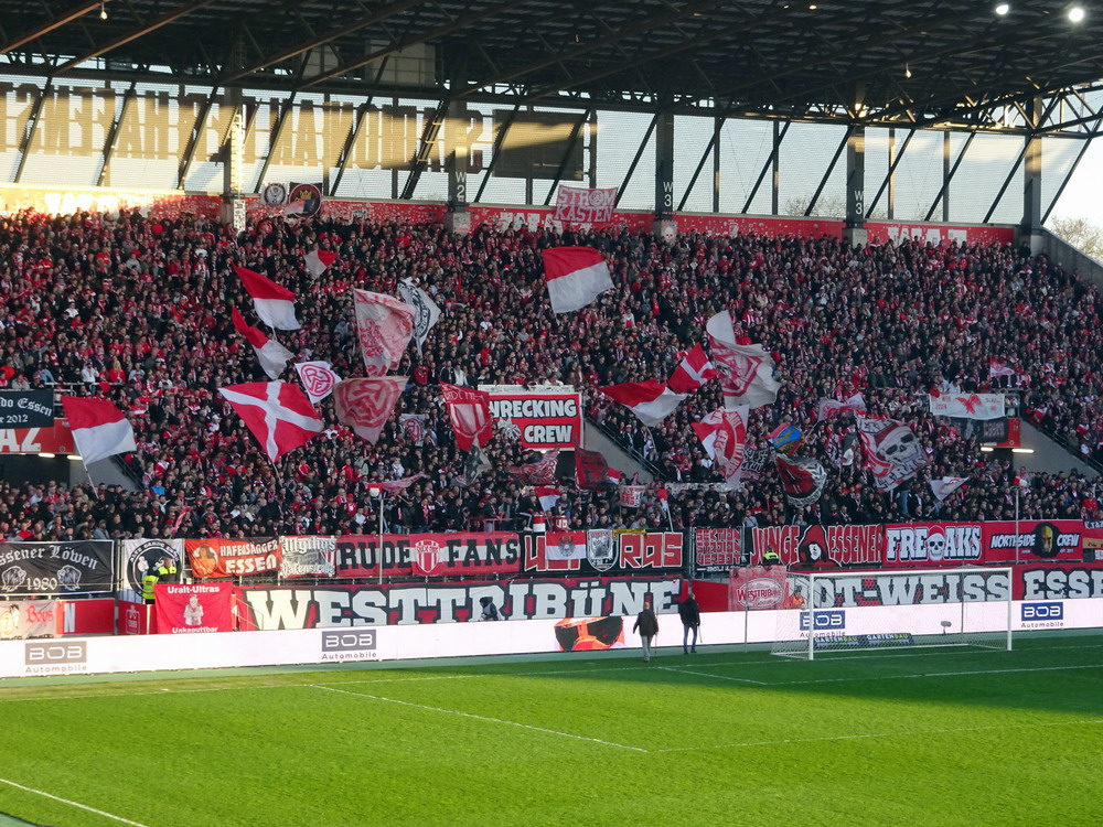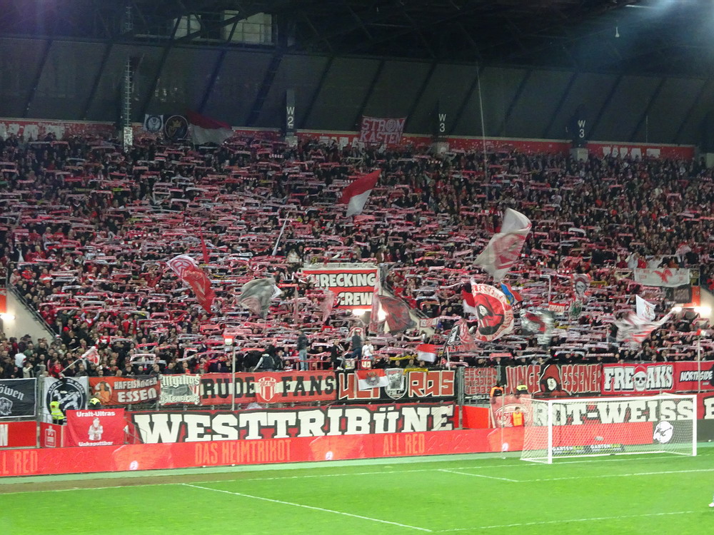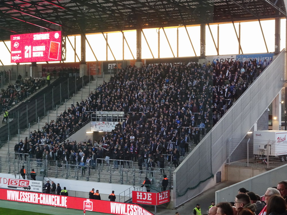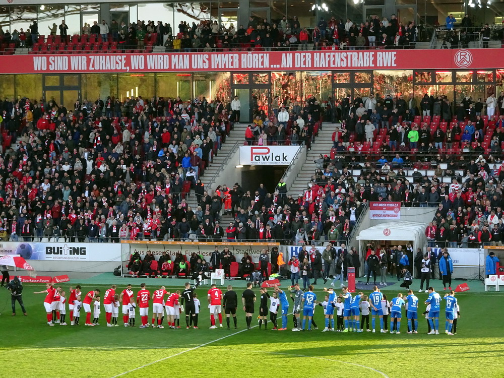 Nach zuletzt nur einem Punkt aus drei Spielen war der glorreiche RWE gut beraten, mal wieder einen Dreier einzufahren. Mit der Kogge aus dem Mecklenburger Norden stellte sich dafür eine schon recht hohe Hürde in den Weg, aber in dieser perversen Liga hat ja eine Favoritenstellung auch wenig Aussagekraft, denn üblicherweise ist keine Mannschaft in irgendeinem Spiel chancenlos, zumal der Deutsche Meister von 1955 noch immer eines der besten Rückrunden-Teams ist. Apropos Meister 1955 – die Meisterschaft jährt sich in diesem Jahr zum 70. Mal und anlässlich dessen lief die Truppe in einem an das Hemd des Meister-Jahres angelehnten Sonder-Trikot auf. Das schien aber zunächst eher schwer auf den Schultern der elf Mannen im rot-weissen Dress zu lasten, denn die Hanseaten übernahmen nach kurzem Abtasten die Regie und brachten die Gastgeber mit schnellen wie präzisen, kurzen Pässen in Verlegenheit. Eine schlecht verteidigte Ecke endete dann im verdienten frühen Führungstreffer. Dass nur ein Rot-Weisser eine kurz ausgeführte Ecke unterbinden soll, ist ja schon ambitioniert, wenn sich dem ausführenden Spieler aber gleich zwei Mitspieler kurz anbieten, ein Ding der Unmöglichkeit. Natürlich kam es zur kurzen Ausführung, der Ballempfänger zog in in die Mitte vor den Sechzehner, in dem sich ebenso unerklärlicher Weise alle anderen Rot-Weissen eingeigelt hatten und der Ex-Rote und Aufstiegsheld Harenbrock verlängerte den Distanzschuss mit der Hacke ins Tor. Abgesehen von einem ersten Aufreger im Rostocker Sechzehner, als der Hansa-Keeper in höchster Not gegen Arslan klären konnte, ging es erst mal munter weiter in Richtung des Tores von Jakob Golz. Bis Arslan nach zwanzig Minuten ein schlechtes Zuspiel in der Hansa-Hintermannschaft abfing und im Eiltempo in Richtung des Hansa-Tores stürmte, anstatt den mitgelaufenen Safi zu bedienen, noch einen Verteidiger aussteigen ließ und das Spielgerät dann trocken zum Ausgleich versenkte.