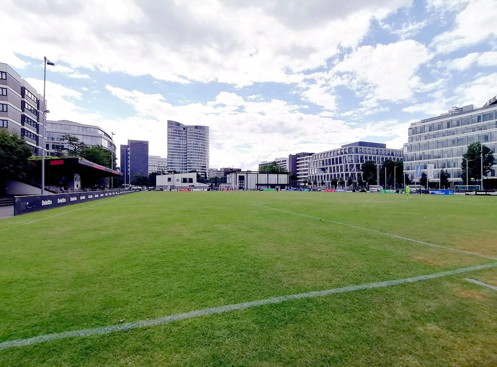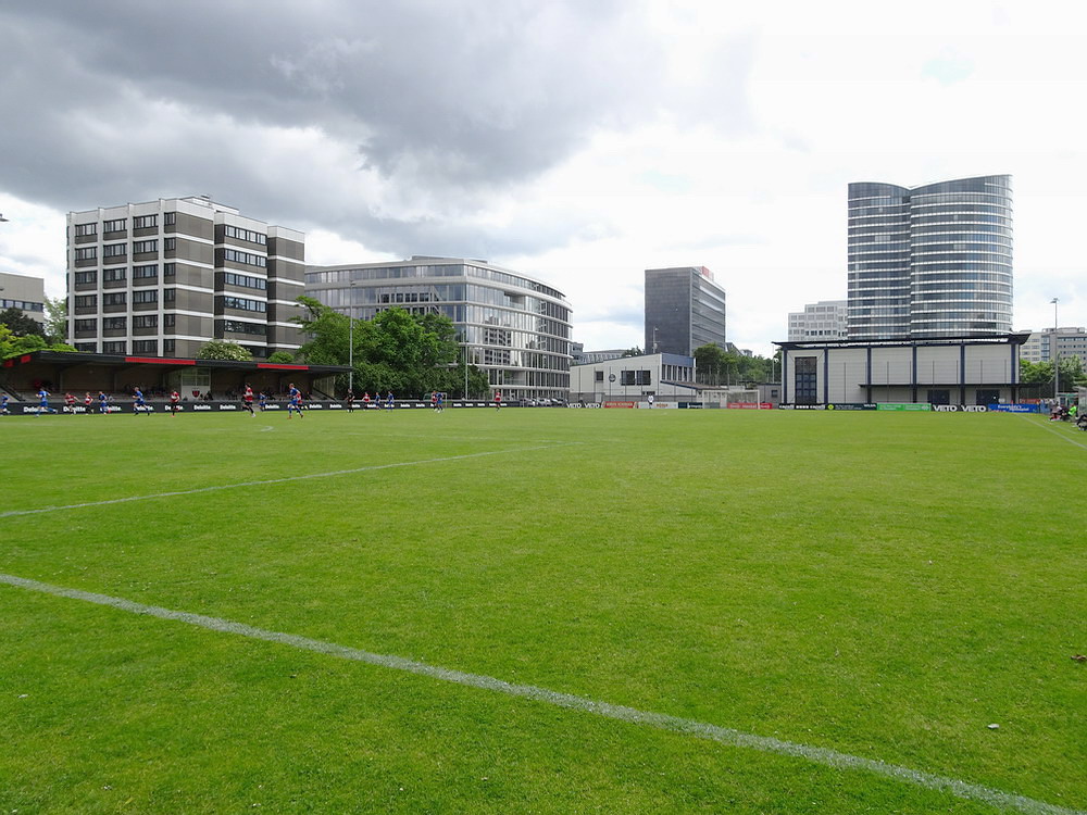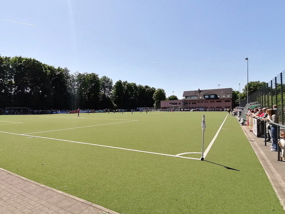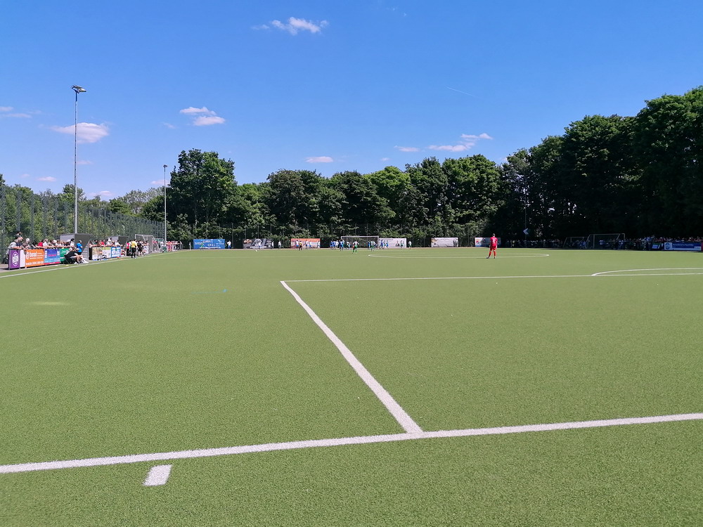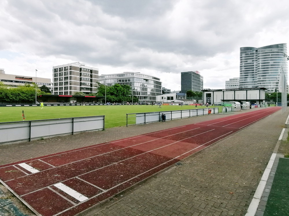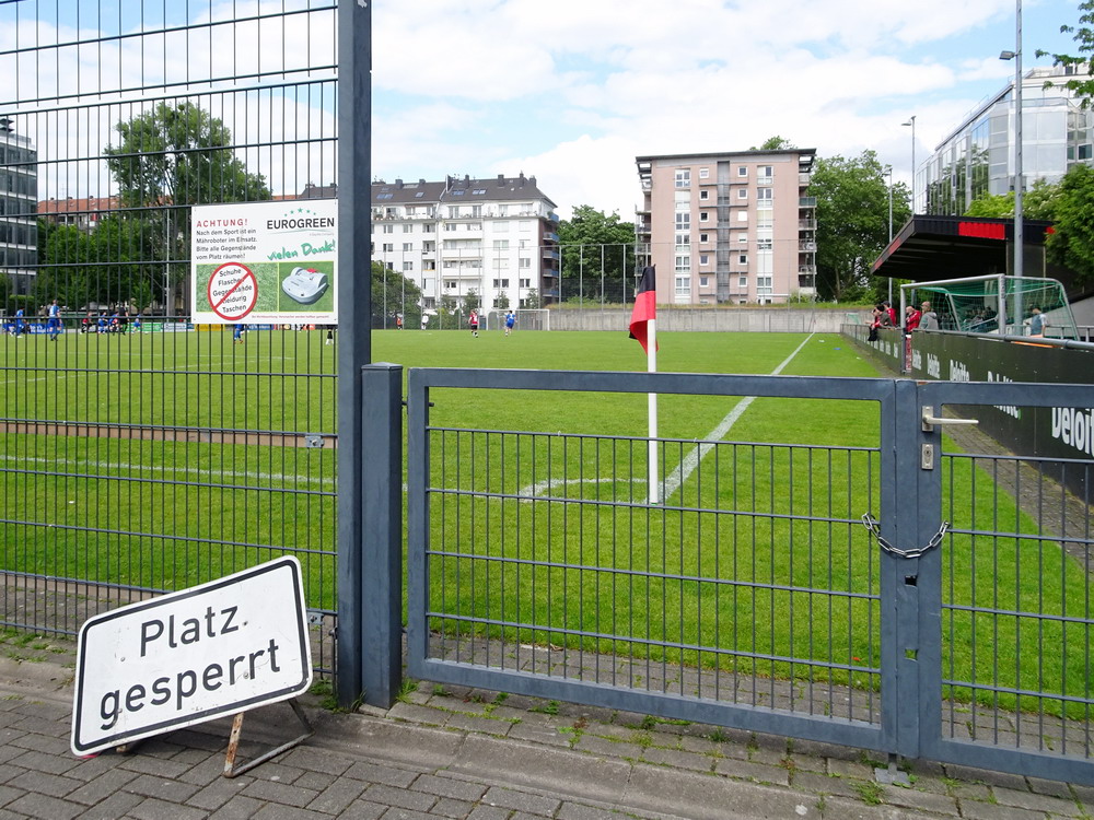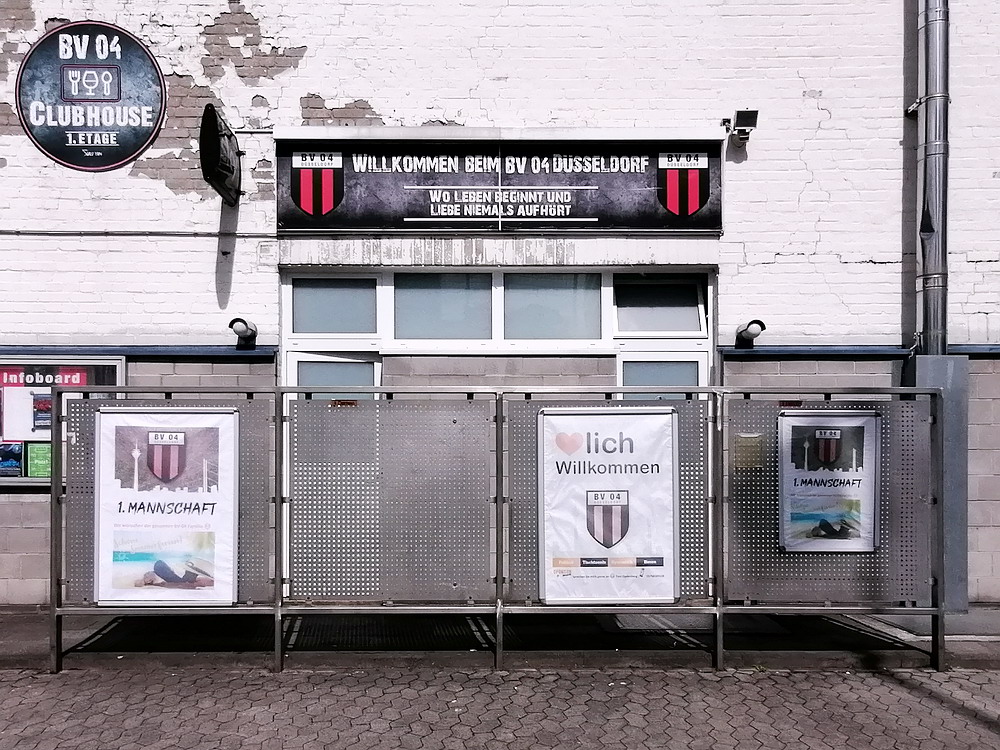 Eine wechselhafte Geschichte hat der Ballspielverein 04 aus der Landeshauptstadt Nordrhein-Westfalens. Lange Zeit spielte der Verein meist auf Landesliga-Niveau mit wenigen Ausreißern nach unten und oben. Mitte der vergangenen Dekade begaben sich die Schwarz-Roten dann in eine Abwärtsspirale die letztlich gar in der Kreisliga C endete. Seit in paar Saisons wird wieder auf B-Klassen-Ebene gekickt, bisher allerdings ohne ernsthaft ins Aufstiegsgeschehen eingreifen zu können. Überregional bekannt ist der BV 04 für die jährlich zu Ostern ausgerichtete und schon seit über 60 Jahren stattfindende ‚U19-Champions-Trophy‘, zu der namhafte Mannschaften aus Europa und auch aus der ganzen Welt anreisen. Die Sportanlage liegt eher untypisch inmitten eines gemischten Wohn- und Geschäftsquartieres und erhält durch die umliegende Bebauung auf irgendeine Art eine interessante Kulisse. Prunkstück der Anlage ist der Naturrasenplatz mit der überdachten Tribüne. Eine gute Note hat auch das durch den Pächter der Vereinsgaststätte geführte Grill-Catering verdient. Die Sucuk im Fladenbrot mit Gurken und geschmorten Zwiebeln waren hervorragend. Während der BV 04 jenseits von Gut und Böse im oberen Mittelfeld des Tableaus steht, ging es für die Gäste um nichts weniger als den Aufstieg. Mit einem passenden Ergebnis des Verfolgers hätte dieser schon heute realisiert werden können. Daraus wurde nichts, aber mit dem heutigen Kantersieg wurde das Tor zur Kreisliga A sperrangelweit aufgestoßen.