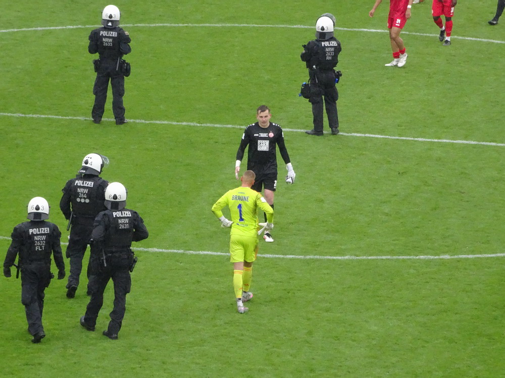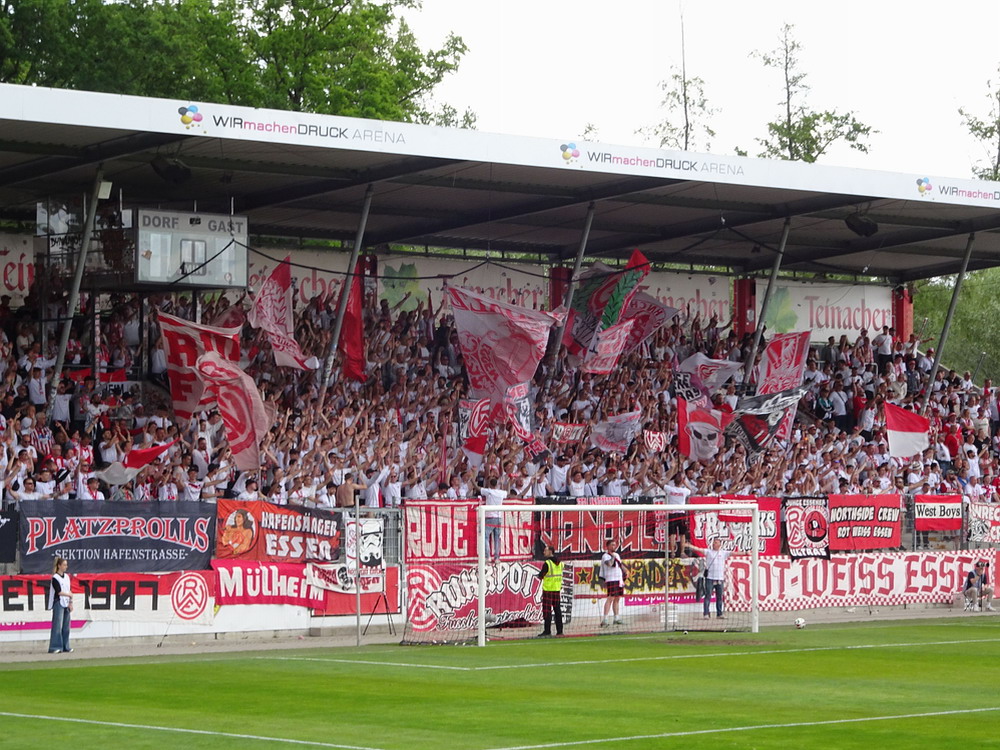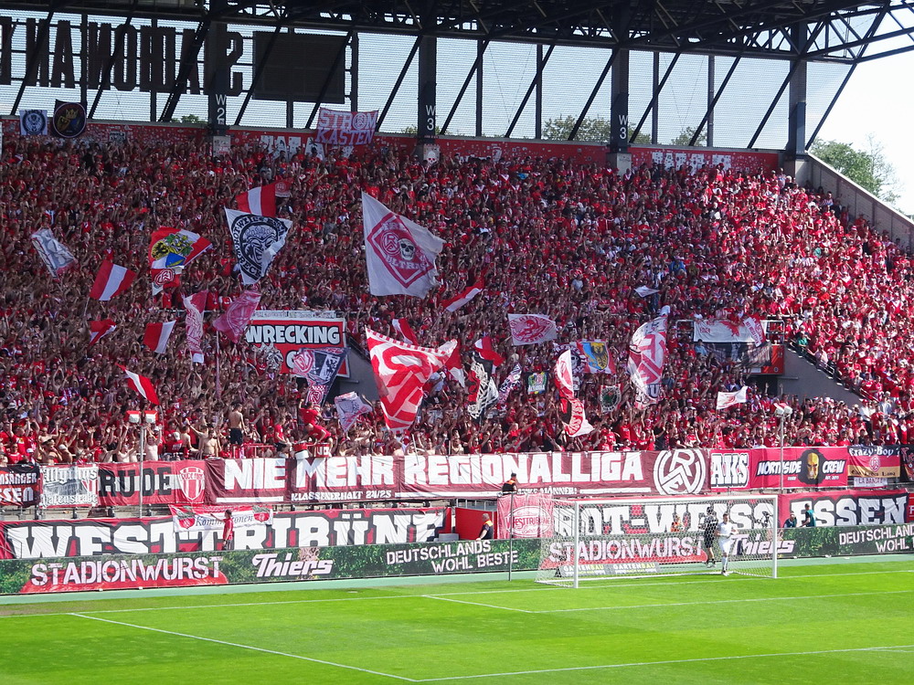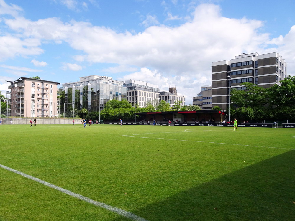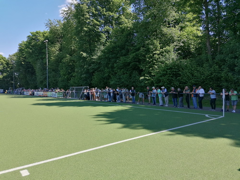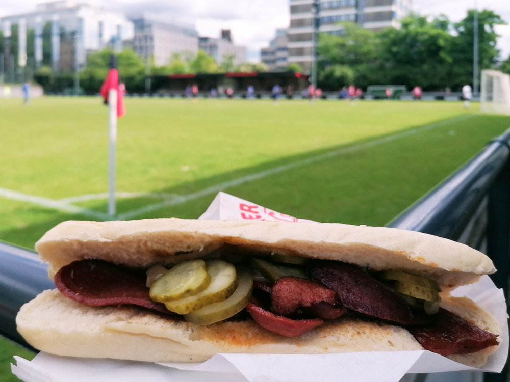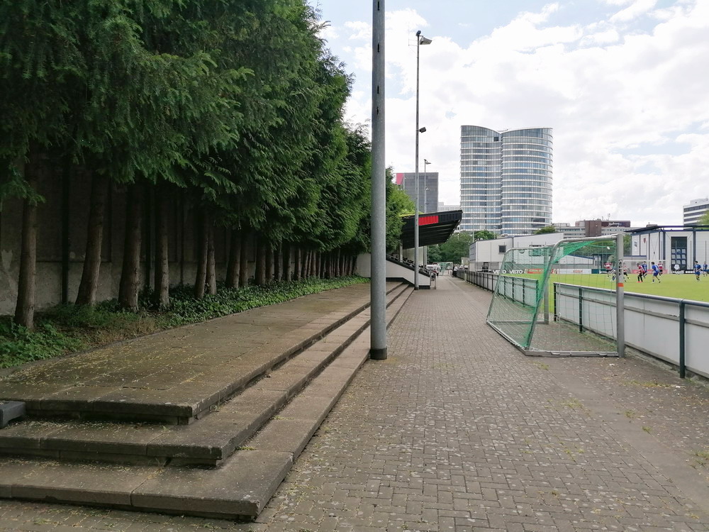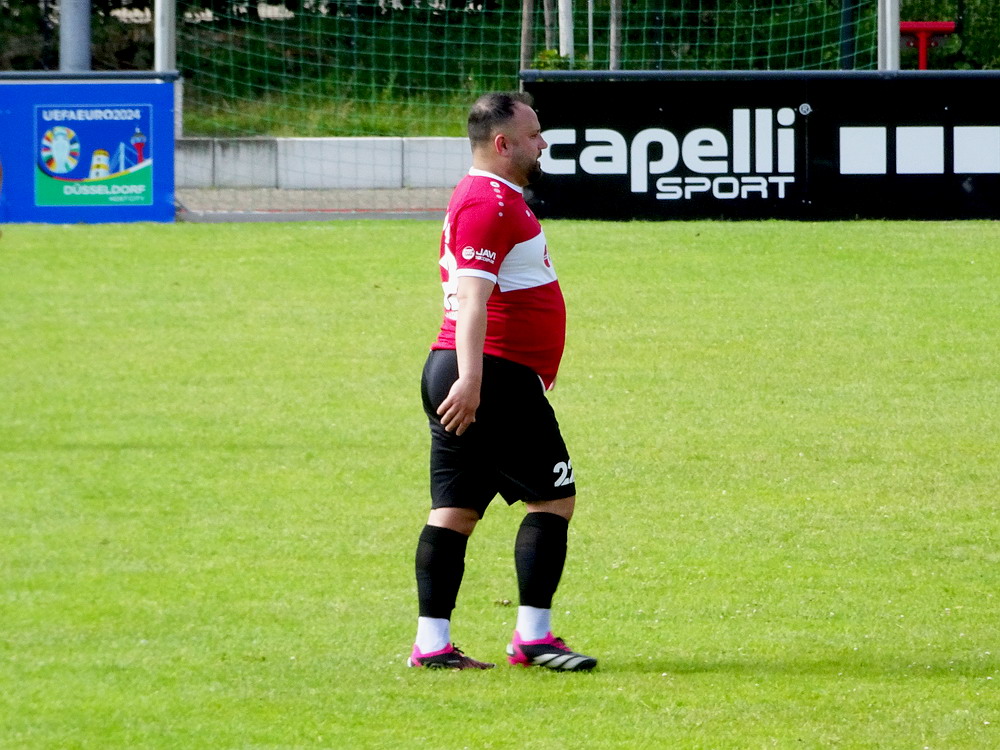 Eine wechselhafte Geschichte hat der Ballspielverein 04 aus der Landeshauptstadt Nordrhein-Westfalens. Lange Zeit spielte der Verein meist auf Landesliga-Niveau mit wenigen Ausreißern nach unten und oben. Mitte der vergangenen Dekade begaben sich die Schwarz-Roten dann in eine Abwärtsspirale die letztlich gar in der Kreisliga C endete. Seit in paar Saisons wird wieder auf B-Klassen-Ebene gekickt, bisher allerdings ohne ernsthaft ins Aufstiegsgeschehen eingreifen zu können. Überregional bekannt ist der BV 04 für die jährlich zu Ostern ausgerichtete und schon seit über 60 Jahren stattfindende ‚U19-Champions-Trophy‘, zu der namhafte Mannschaften aus Europa und auch aus der ganzen Welt anreisen. Die Sportanlage liegt eher untypisch inmitten eines gemischten Wohn- und Geschäftsquartieres und erhält durch die umliegende Bebauung auf irgendeine Art eine interessante Kulisse. Prunkstück der Anlage ist der Naturrasenplatz mit der überdachten Tribüne. Eine gute Note hat auch das durch den Pächter der Vereinsgaststätte geführte Grill-Catering verdient. Die Sucuk im Fladenbrot mit Gurken und geschmorten Zwiebeln waren hervorragend. Während der BV 04 jenseits von Gut und Böse im oberen Mittelfeld des Tableaus steht, ging es für die Gäste um nichts weniger als den Aufstieg. Mit einem passenden Ergebnis des Verfolgers hätte dieser schon heute realisiert werden können. Daraus wurde nichts, aber mit dem heutigen Kantersieg wurde das Tor zur Kreisliga A sperrangelweit aufgestoßen.