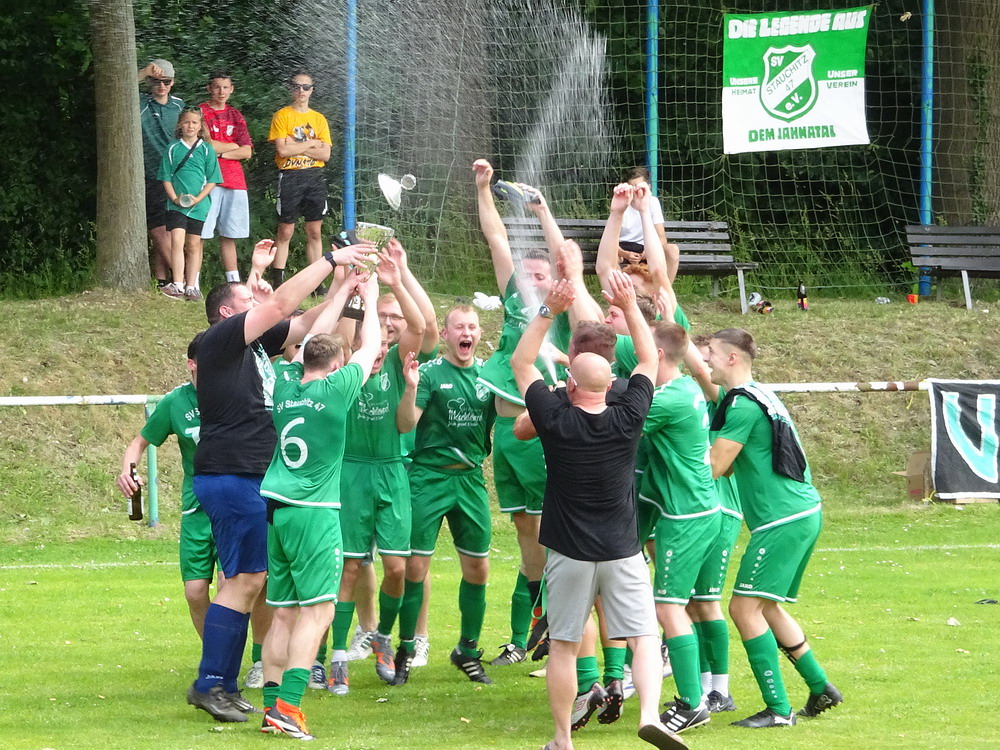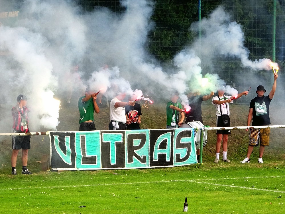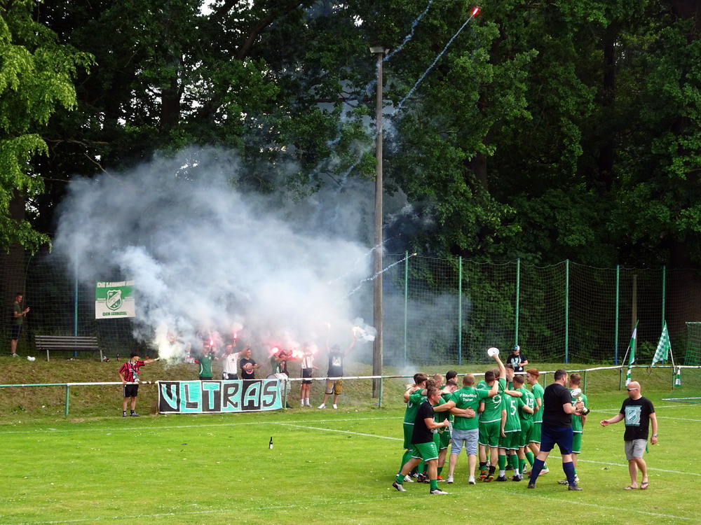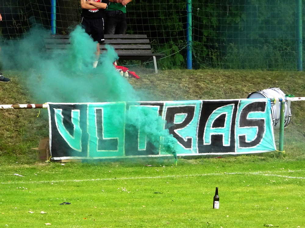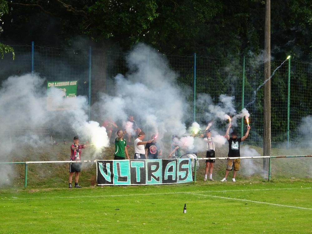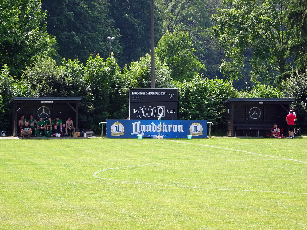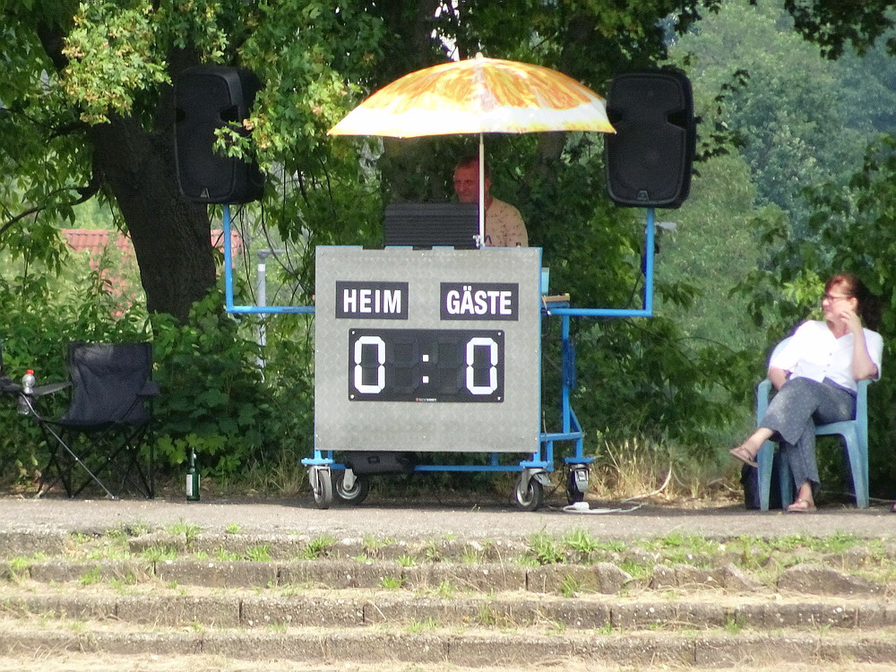 Gut 500 Zuschauer fanden sich ein, um der Veranstaltung zu frönen. Die Sportanlage hat außer ein paar Merkmalen nicht viel anzubieten. Das Spiel kann lediglich ebenerdig am Stankett stehend verfolgt werden, sieht man mal von ein paar betagten wie traurigen Stufen ab, die auf wenigen Metern Länge ihr Dasein fristen und von alten Zeiten träumen. Auf dem künstlichen Geläuf sah es lange so aus, als würden die Akteure irgendein ungeliebtes Testspiel hinter sich bringen, so lustlos wirkte das Gebolze im ersten Durchgang. Vermutlich spielte die Angst mit, den ersten Fehler zu machen, jedenfalls war es nicht allzu tragisch, dass ich am Grillstand viel zu lange auf meinen bestellten Phosphatschlauch warten musste, da auf der Plastikwiese eh nix passierte. Dafür kam dann in Hälfte zwei deutlich mehr Leben in das Geschehen und die Zweite des Grafschafter SV nahm die Zügel in die Hand. Die halbwegs logische Folge war eine Zwei-Tore-Führung nach gut 70 Minuten. Aber die Gastgeber kamen kurz darauf mit dem Anschlusstreffer ins Spiel zurück. Als in der Nachspielzeit alle auf den Abpfiff warteten, erhielt Rumeln noch einen Elfmeter. Der Schütze verwandelte nervenstark und dieser Punkt hätte für die Kreisliga A gereicht. Aber der Kick war noch nicht zu Ende und zwei Minuten später gab es für die Gäste ebenfalls einen Strafstoß. Auch dieser landete sicher im Netz und bescherte dem GSV das Happy End in buchstäblich letzter Minute.