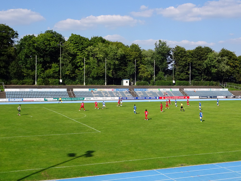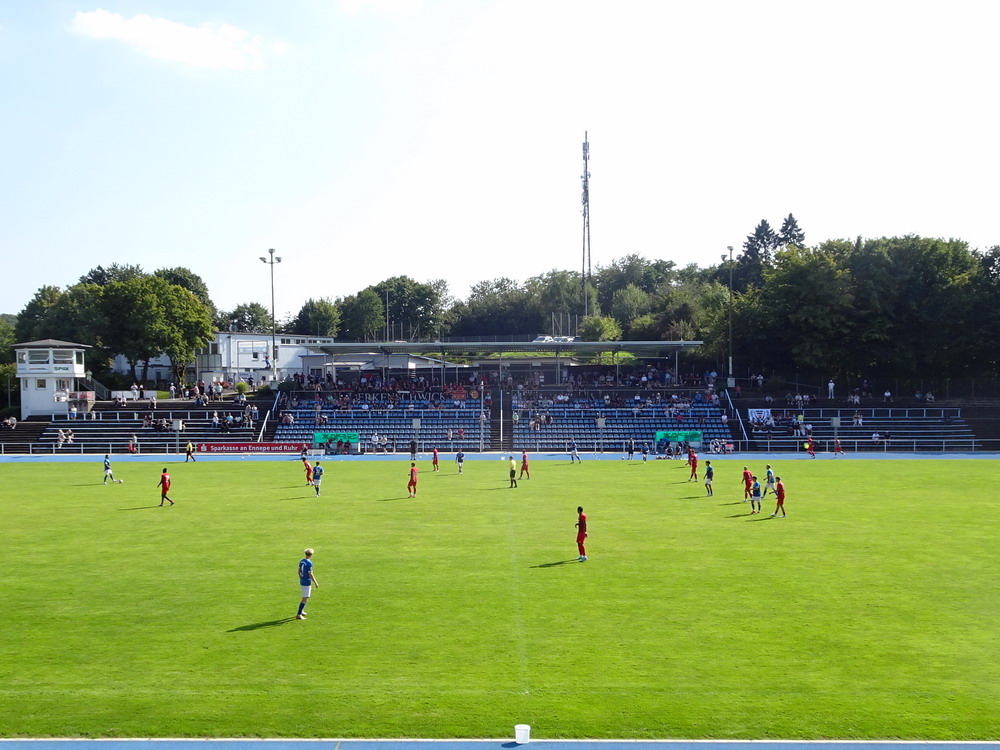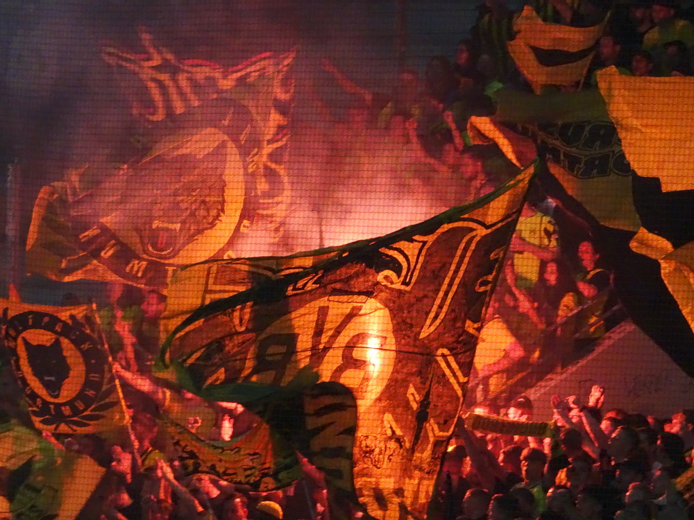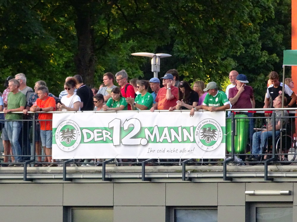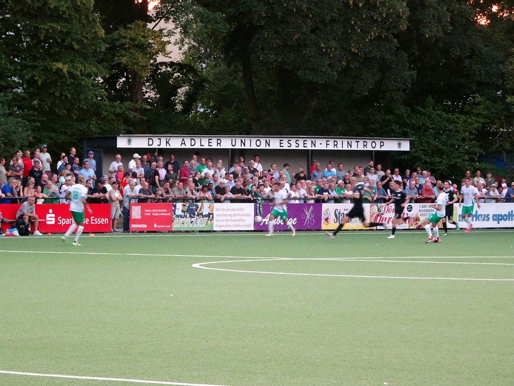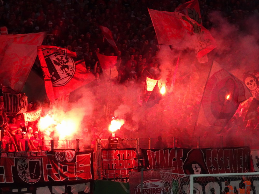 Wenig später schmiss Safi seinen Turbo an, eilte auf dem rechten Flügel allen davon und bediente klug Mizuta, der den Ball zum Ausgleich ins linke untere Eck schob. Schließlich brachte ein Handelfmeter den dritten Treffer durch Arslan. Aufgabe erledigt? Mitnichten, denn nun wurde es immer wilder. Der heute Abend ohne große Fehler trotzdem etwas indisponiert wirkende Golz verursachte nur wenig später einen Foulelfmeter, der Wehen den Anschluss brachte. Drei Minuten vor dem Ende musste sich Obuz anlasten lassen, eine Flanke nicht energisch genug verhindert zu haben. Über Umwege landete der Ball auf dem Kopf eines Wehener Spielers und die Partie war wieder auf Remis gestellt. Das Visier war aber nun bei beiden Teams offen. Mizuta hatte beinahe im Gegenzug wieder die Führung erzielt, was die Gastgeber mit etwas Glück verhinderten. Dennoch fand der Kick noch einen Sieger und zwar den richtigen! Koschinat bewies in der Schussminute ein glückliches Händchen und wechselte Owusu und Müsel ein. Der eine legte ab auf den anderen und schon lag der RWE wieder in Front. Kurz danach war die turbulente Fahrt vorüber und wichtige Punkte gingen nach Essen. Für neutrale Besucher war das sicher eine tolle Veranstaltung, ich bin aber wieder deutlich gealtert. Das Gedächtnis hatte aber wohl eh schon gelitten, denn da ich meine Digi vergessen hatte, kann ich leider nur ein paar lausige Handy-Fotos bieten.