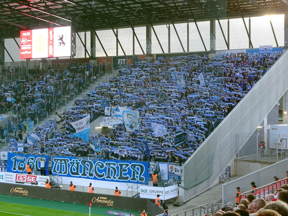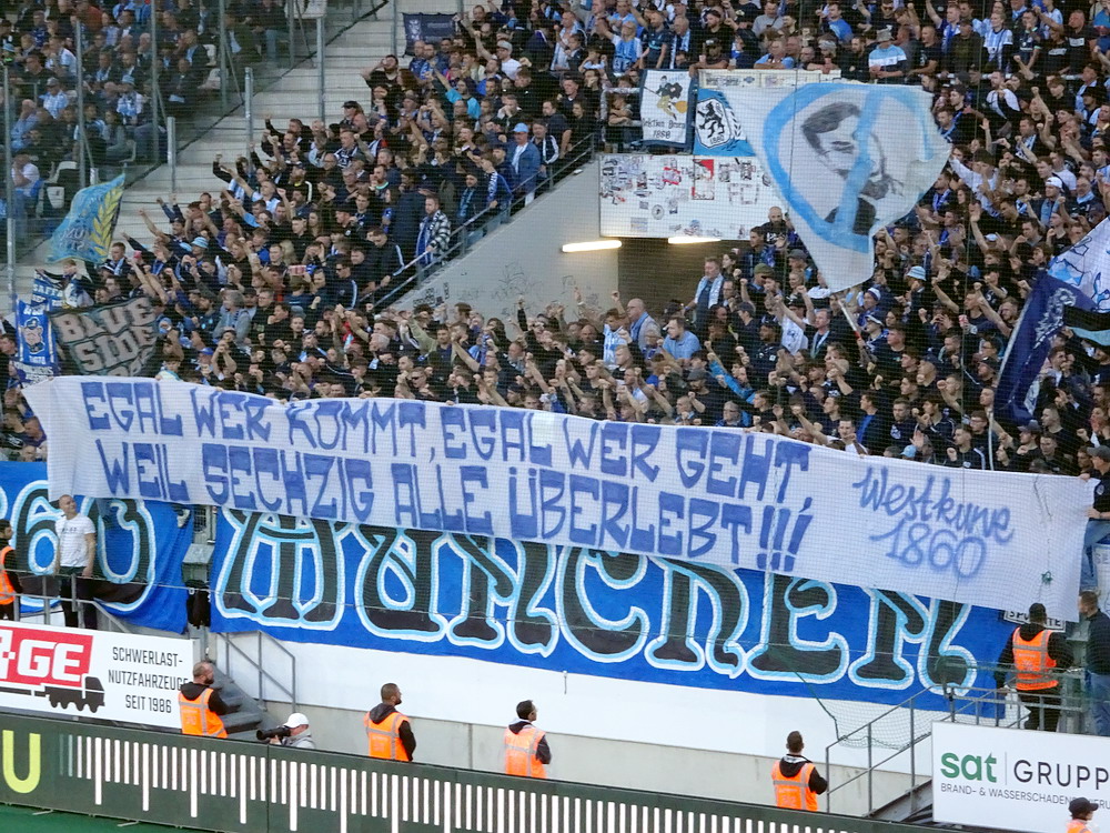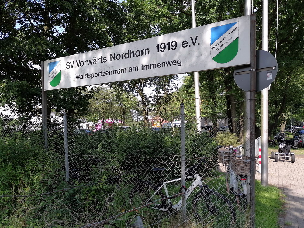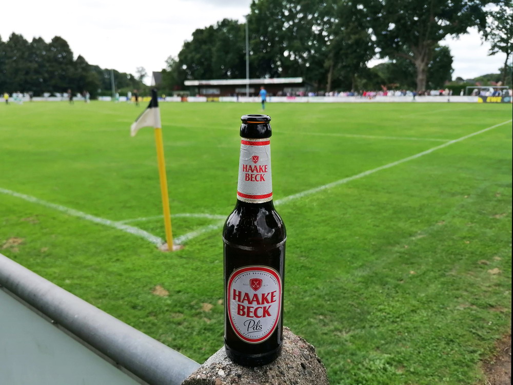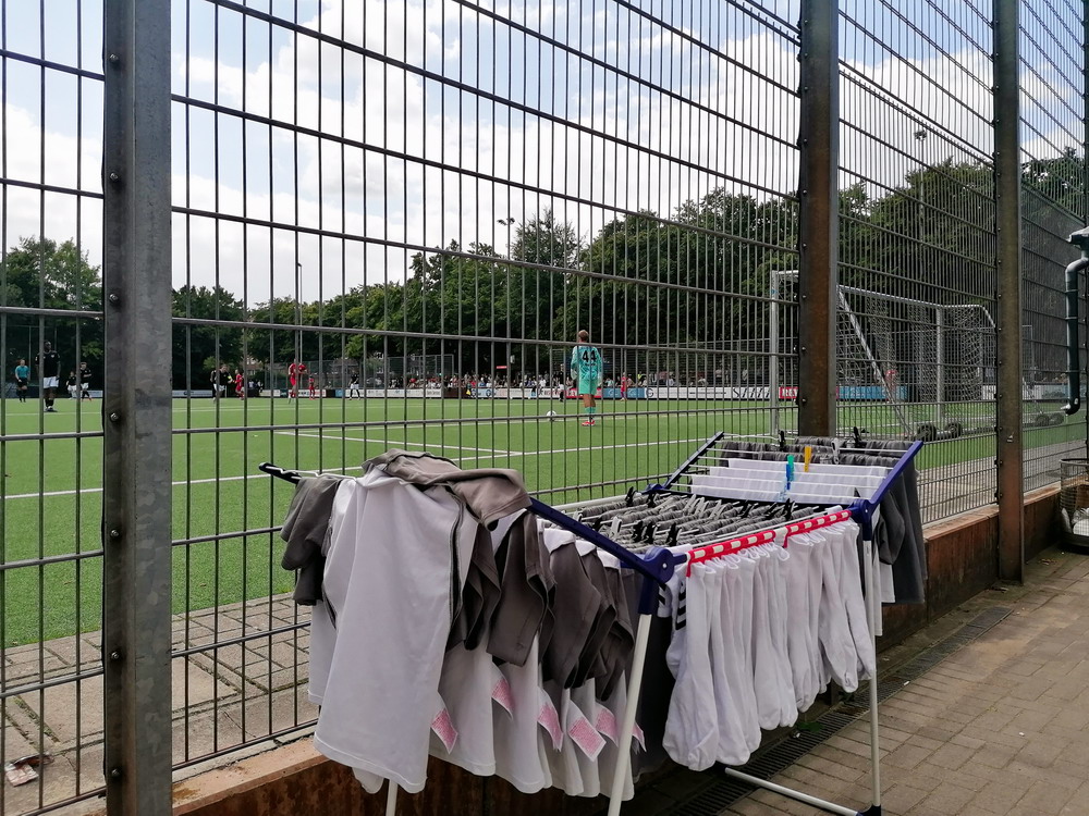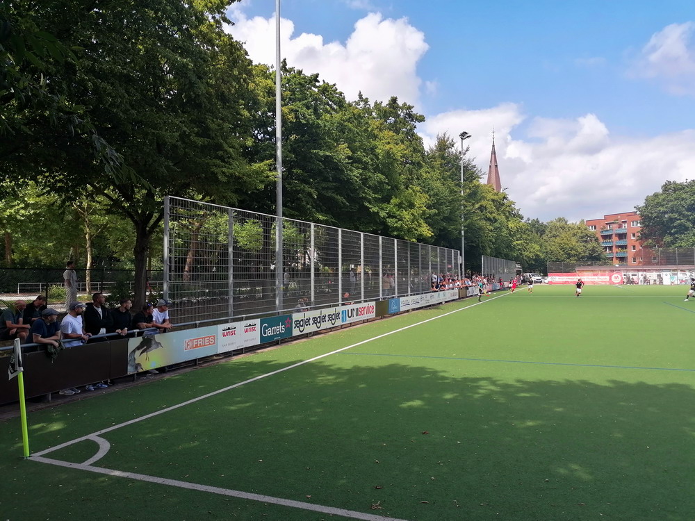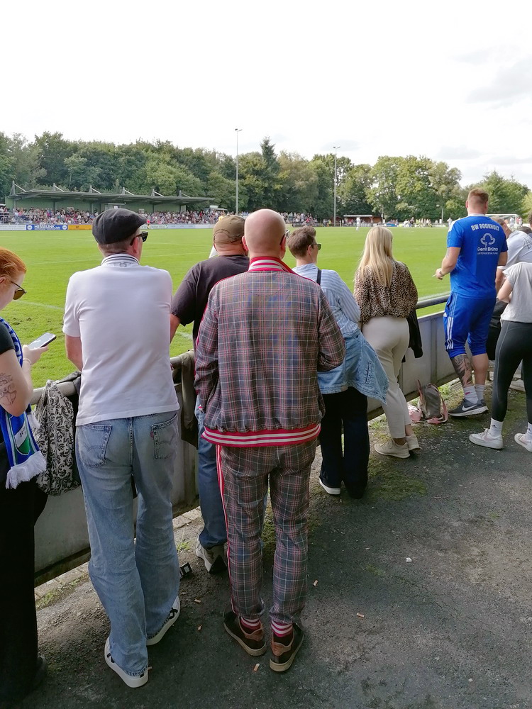 Nach dem eher unglücklichen Auftritt des glorreichen RWE biederte sich zwei Kilometer Luftlinie entfernt noch ein besonderes Stadion an. Das Rudolf-Kalweit-Stadion beherbergt die traditionsgeschwängerte Arminia, ein Verein mit bewegter Geschichte, bis auf kurze Phasen auf Augenhöhe eigentlich immer im Schatten der 96er stehend. Dennoch ist der Club in Hannover beliebt und kann sich über eine kleine Fan-Base freuen. Bemerkbar machte sich diese zwar nur selten, aber dafür hingen beinahe mehr Fahnen am Zaun hinterm Tor, als sich aktive Supporter zu erkennen gaben. Mit breitem Getränke- und Grillangebot konnte das Catering maximal überzeugen. Unbestrittener Star der Veranstaltung war aber natürlich diese wunderbare aus der Zeit gefallene Spielstätte, in der ich Mitte der 10er Jahre schon einmal ein Spiel gesehen hatte. Die überdachte Haupttribüne, in deren Bauch sich eine kultige Stadiongastronomie befindet – da werden Erinnerungen an das Georg-Melches-Stadion wach – wird flankiert von stark bewachsenen Stufen, die eigentlich nicht mehr für die Zuschauer freigegeben sind. Die Hintertortribüne und die Gegengerade mit ihren begrünten Stufen vereinigen sich im Eck und luden am heutigen Tage zum Sonnenbaden ein. Leider verpatzten die Arminen als Oberliga-Absteiger mit einer Heimniederlage den Saisonstart. Abschließend gilt es die Aufmerksamkeit noch auf zwei besondere Akteure im Vereinsgefüge zu lenken. Anstelle eines Rasenmähers weiden außerhalb der Spieltage zwei Schafe auf den Rängen, um den Graswuchs im Rahmen zu kontrollieren. Diese haben ihr Refugium hinter dem tribünenfreien Tor und von dort einen guten Blick auf das Spielgeschehen.