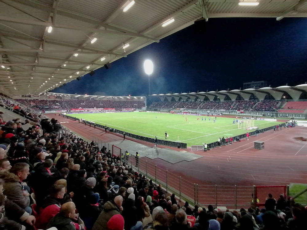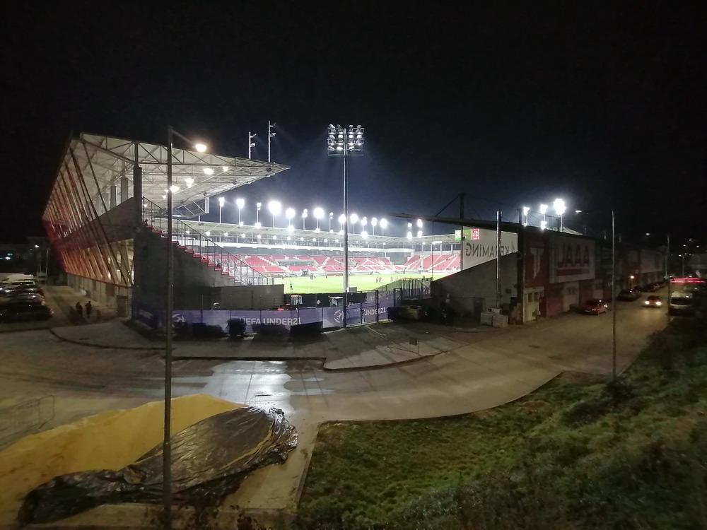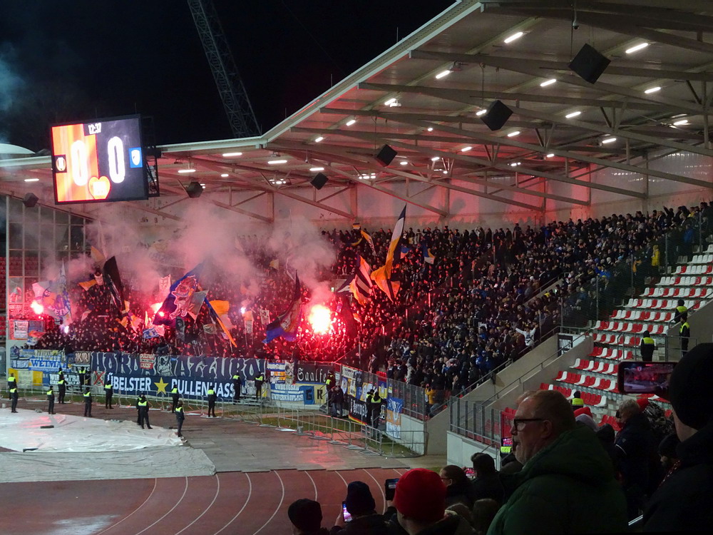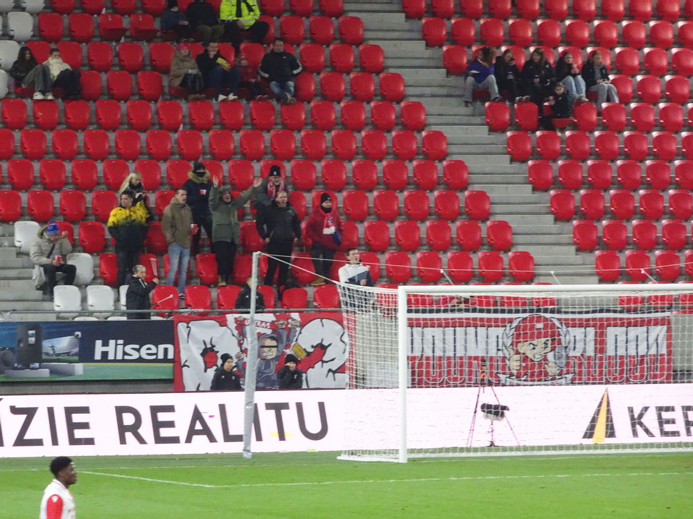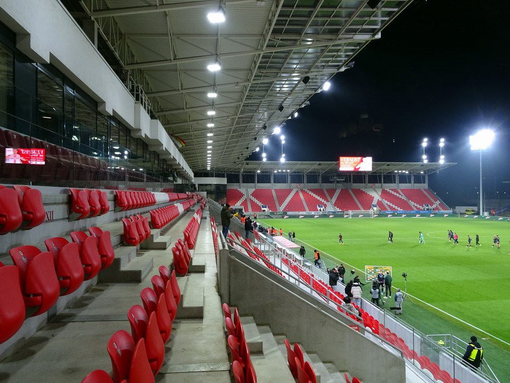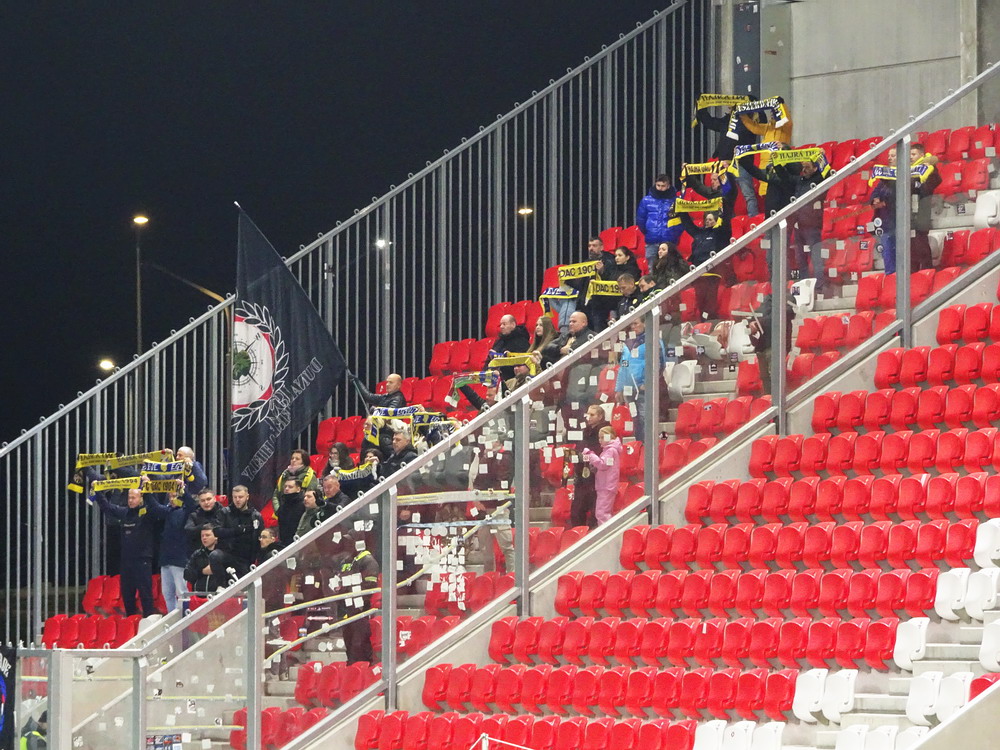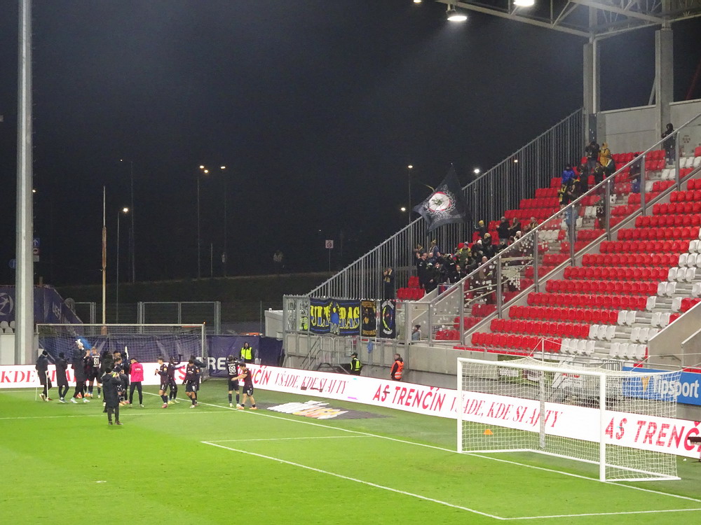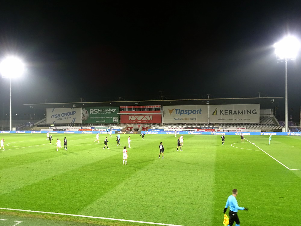 Aus Dunajska Streda waren knapp 50 Leute angereist, von denen etwa die Hälfte um Stimmung bemüht war. Der Großteil der Einwohner von Dunajska Streda ist ungarischer Abstammung, woraus diese auch beim Fußball keinen Hehl machen und sich damit vom Rest der Liga absondern. Offiziell heißt der Verein Dunajskostredský Atletický Club, während die Anhänger des Clubs lieber das ungarische Dunaszerdahelyi Atlétikai Club verwenden. Auf Seiten der Gastgeber sammelten sich zwei Hände voll Leute hinter dem Tor, prügelten auf zwei Trommeln ein und gaben ab und an mal was Eintöniges von sich. Das Stadion zeigte ursprünglich das typische Gesicht der Spielstätten sozialistisch geprägter Staaten mit Laufbahn, einer gedeckten Haupttribüne und Stehrängen in den übrigen Bereichen. 2017 wurde mit dem Umbau zu einem reinen Fußballstadion begonnen, lediglich die Haupttribüne blieb vom alten Stadion übrig. Das Ergebnis ist ein recht schicker Komplex, der mehr Besucher verdient hätte. Da die alte Tribüne aktuell nicht für die Nutzung freigegeben ist, respektive nicht benötigt wird, wurde das Bauwerk leider mit großen Werbebannern komplett entstellt, so dass man es kaum noch als Tribüne identifizieren kann.