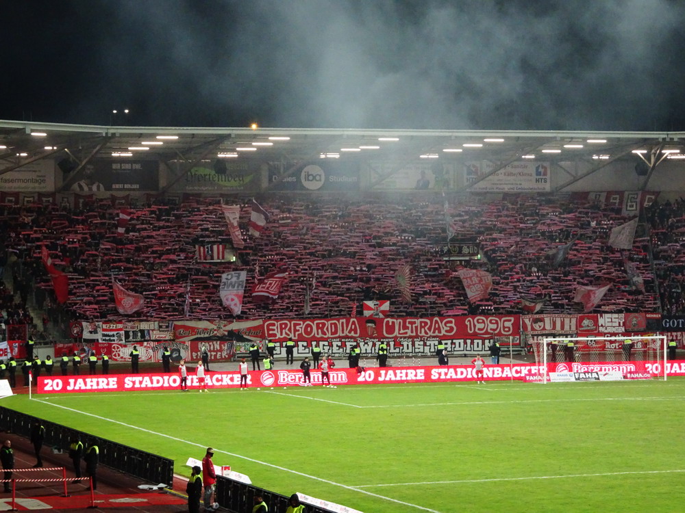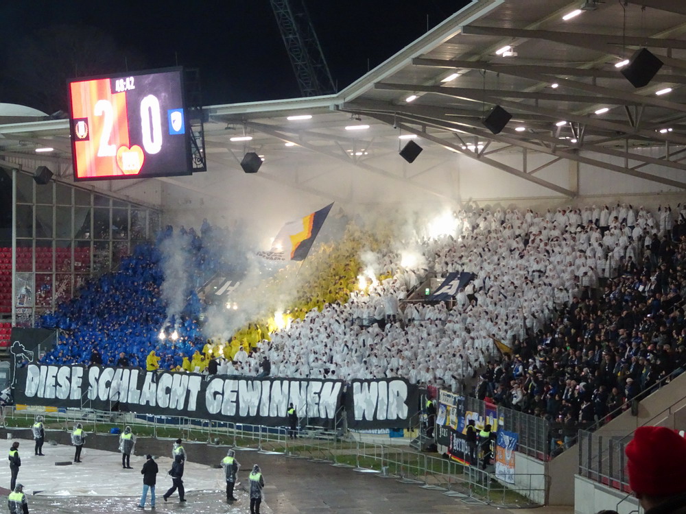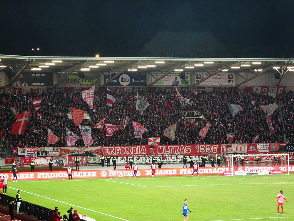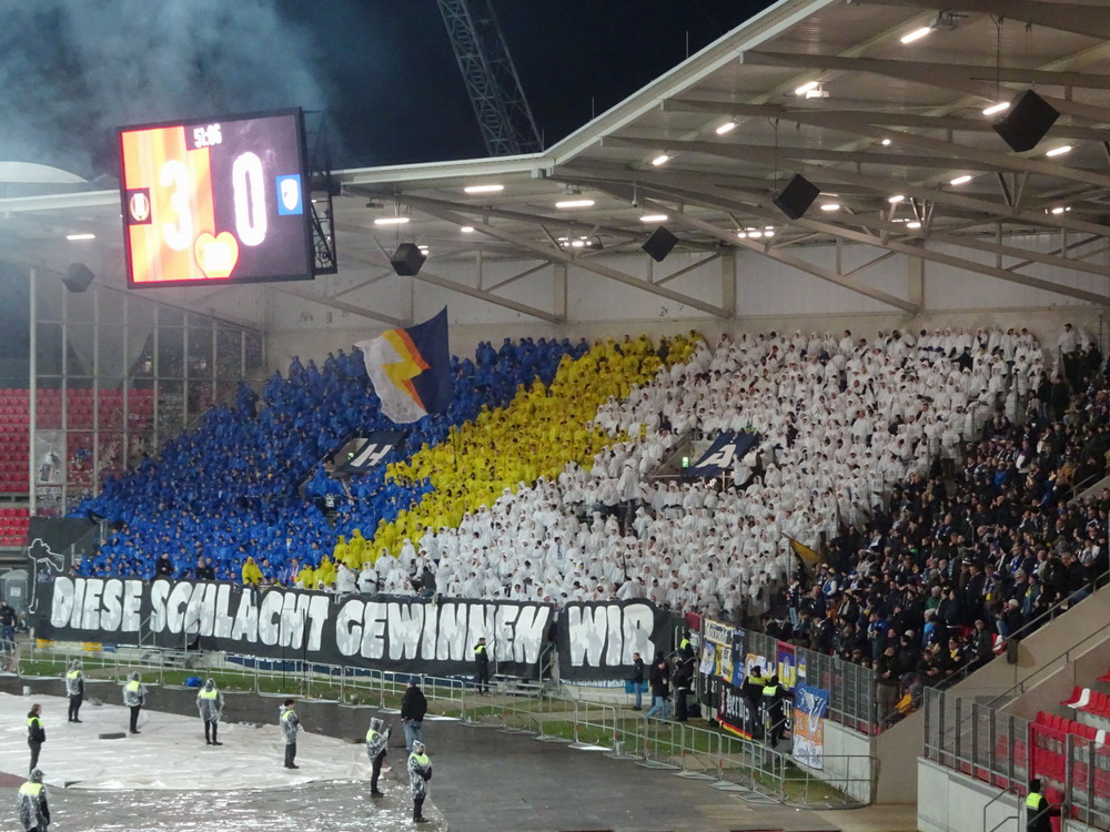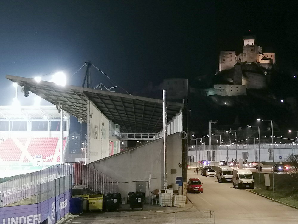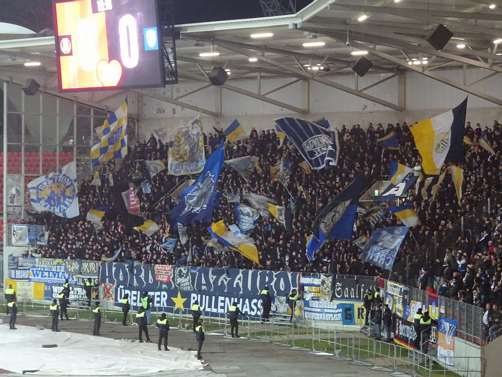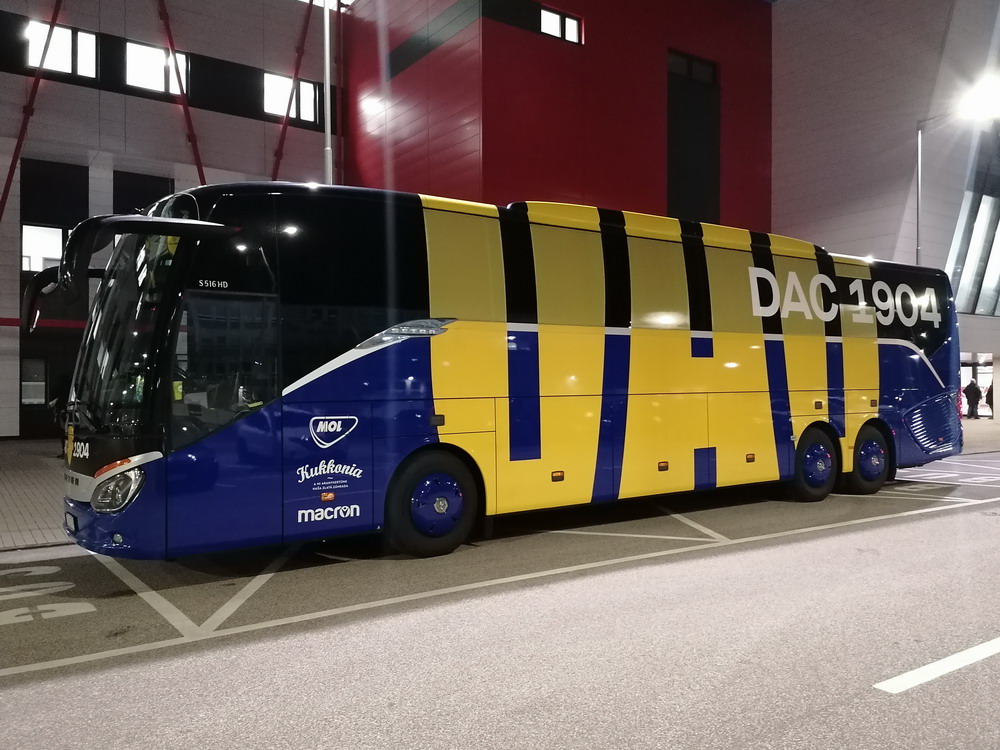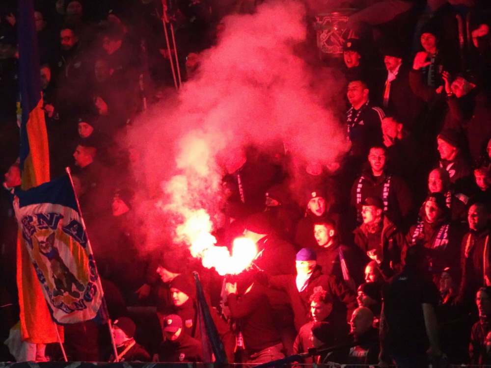 Aus Dunajska Streda waren knapp 50 Leute angereist, von denen etwa die Hälfte um Stimmung bemüht war. Der Großteil der Einwohner von Dunajska Streda ist ungarischer Abstammung, woraus diese auch beim Fußball keinen Hehl machen und sich damit vom Rest der Liga absondern. Offiziell heißt der Verein Dunajskostredský Atletický Club, während die Anhänger des Clubs lieber das ungarische Dunaszerdahelyi Atlétikai Club verwenden. Auf Seiten der Gastgeber sammelten sich zwei Hände voll Leute hinter dem Tor, prügelten auf zwei Trommeln ein und gaben ab und an mal was Eintöniges von sich. Das Stadion zeigte ursprünglich das typische Gesicht der Spielstätten sozialistisch geprägter Staaten mit Laufbahn, einer gedeckten Haupttribüne und Stehrängen in den übrigen Bereichen. 2017 wurde mit dem Umbau zu einem reinen Fußballstadion begonnen, lediglich die Haupttribüne blieb vom alten Stadion übrig. Das Ergebnis ist ein recht schicker Komplex, der mehr Besucher verdient hätte. Da die alte Tribüne aktuell nicht für die Nutzung freigegeben ist, respektive nicht benötigt wird, wurde das Bauwerk leider mit großen Werbebannern komplett entstellt, so dass man es kaum noch als Tribüne identifizieren kann.