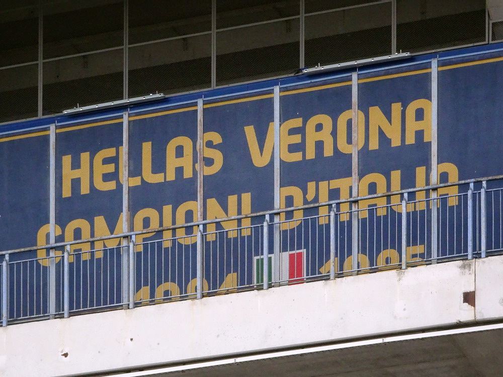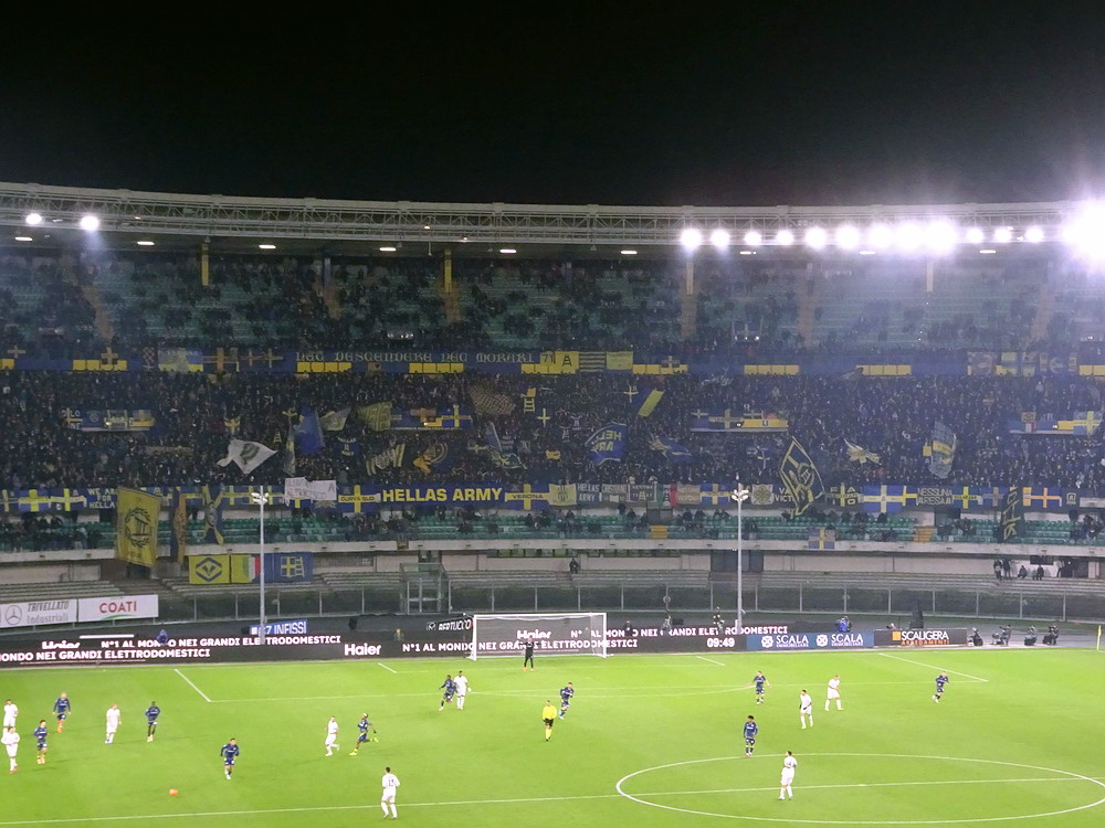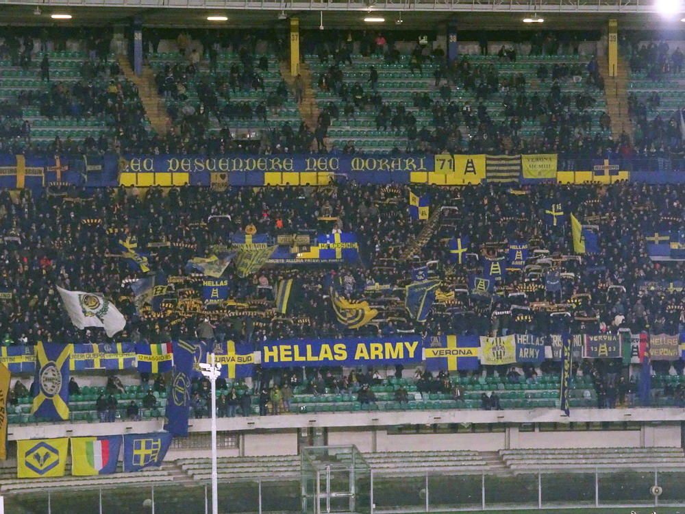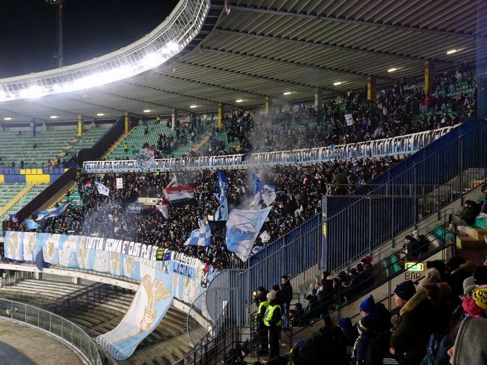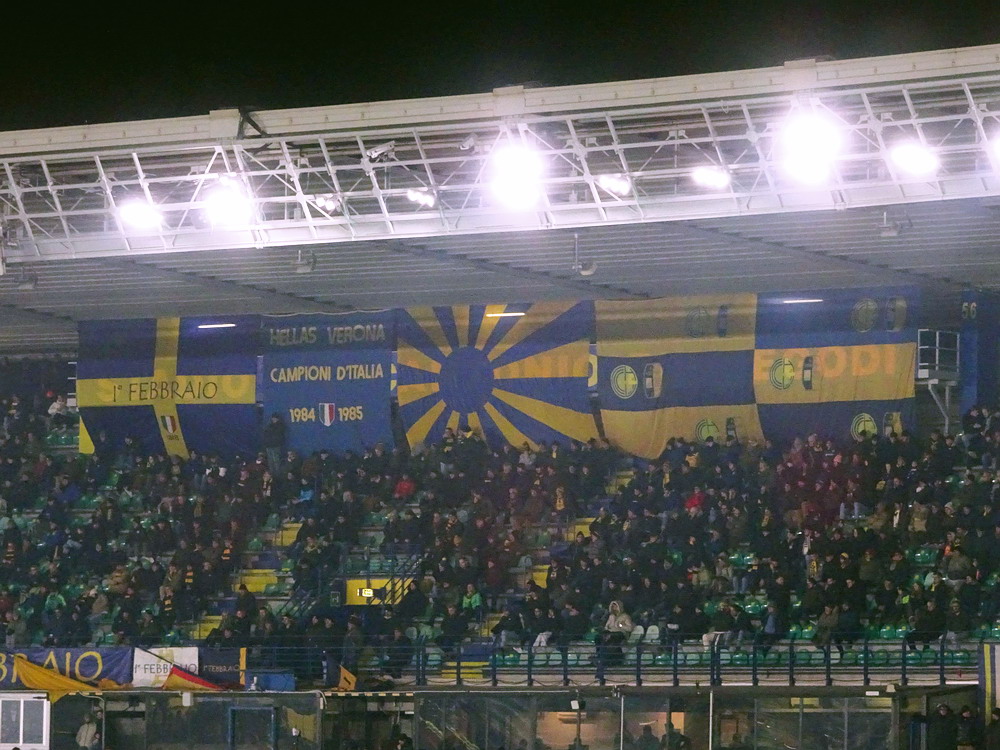 Und gebracht hat es auch nix. Zwar war die Idee mit dem nahe zum ‚Stadio Marcantonio Bentegodi‘ gelegenen, ausgewählten Hotel sicher eine gute, allerdings reichte der durch die zeitraubenden Situationen beim Spiel in Mantova zu sehr zusammengeschmolzene Zeitpuffer letztlich nicht aus und die ersten drei Spielminuten fanden noch ohne uns statt. Nun denn, es war nicht der erste Besuch im alten WM-Ground von 1990, daher wurde die ‚Berufsehre‘ nicht zu sehr beschmutzt. Im ‚Settore Ospiti‘ zu unserer Rechten hatten sich 2.142 Rechte breit gemacht. Kleiner Kalauer, denn die politische Ausrichtung der als ‚faschistisch‘ verrufenen, vor einigen Jahren aufgelösten ‚Irriducibili‘ (ganz so unbeugsam waren die ‚Unbeugsamen‘ also wohl doch nicht) dürfte vermutlich auch unter dem neuen Namen ‚Ultras Lazio‘ tendenziell noch in dieselbe Richtung gehen. In der gegenüberliegenden Kurve sieht es rund um die ‚Hellas Army‘ bekanntermaßen ideologisch nicht viel besser aus. Aber zurück zu den Fakten. Optisch gab der Gästeblock ein schönes Bild ab, die Mitgereisten hatten Ihren Bereich schön beflaggt. Während am Geländer des Oberranges Banner mit den Namen diverser Stadtteile Roms befestigt worden waren, wurde im Unterrang das Vereinswappen zentral platziert, welches von Wappen einiger ‚Rioni‘ – ‚Regionen‘ kommt dieser administrativen Einteilung in der Übersetzung am nächsten – der Stadt Rom flankiert wurde. Unterstrichen wurde dieses von einem Banner mit der Aufschrift „Tutto Roma e qui per te“, übersetzt: „Ganz Rom ist für Dich da! Als Intro gab es ein schönes Meer aus großen Schwenkfahnen zu sehen, die zum einem wild verteilt im Steh-Block, aber auch aufgereiht entlang der Balustrade des darüber liegenden Sitzplatzbereiches eingesetzt wurden. Das sah gut aus, wurde aber leider in dem Moment beendet, als ich die Kamera aus dem Halfter gezogen hatte und bereit zum Schuss war.