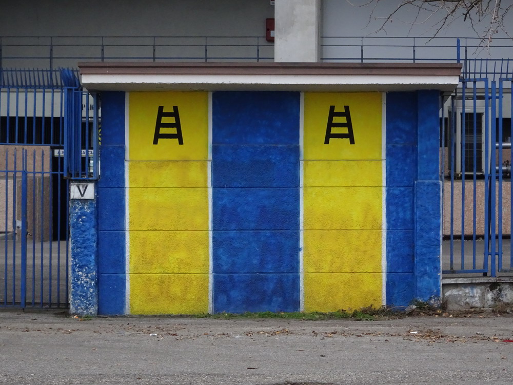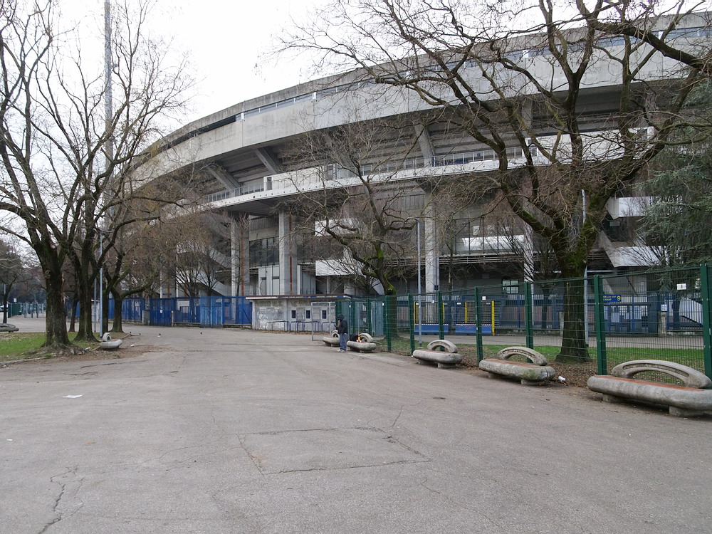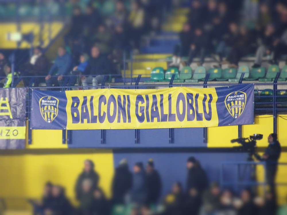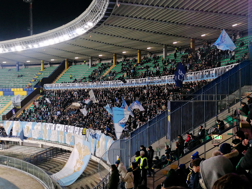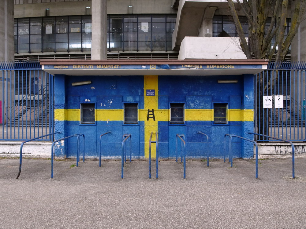 Auf der anderen Seite gab es über die gesamte Breite der Heim-Kurve ebenfalls ein fettes Fahnenmeer zu sehen, welches aber aufgrund der Weitläufigkeit dieser alten Betonschüssel und der diesigen Witterung mit bloßem Auge nur schwer zu erkennen war. Was den 22.000 dann im Anschluss geboten wurde, war teilweise eine Gefahr für das Augenlicht. Ich hatte beim Spiel der mit Schlusslicht Pisa punktgleichen ‚Gialloblu‘ gegen die Gäste aus dem Tabellenmittelfeld kein Spektakel erwartet, aber ein derart zerfahrenes Spiel dann auch wieder nicht. Viel lief nicht zusammen und wenn sich doch mal irgendwer dem Tor näherte, war derjenige jederzeit in der Lage die entsprechende Situation wieder selbst zu entschärfen. Eigentlich war nicht daran zu denken, dass ein Tor fallen sollte, aber der Däne Nelsson in Diensten der Gastgeber fälschte eine flache Hereingabe höchst unglücklich ins eigene Tor ab. Nur so konnte in diesem Spiel ein Treffer fallen und dieser reichte den Hauptstädtern zum Sieg, was von der Gästekurve, die bis auf die Viertelstunde nach der Pause einen guten Auftritt zeigte, entsprechend gefeiert wurde. Über Verona verdunkeln sich dagegen die Wolken, allerdings ist der Zug bei nur vier Punkten Rückstand auf das rettende Ufer noch lange nicht abgefahren. Apropos Zug. Von Bologna brachte uns der Billig-Ire am folgenden Tag nach Köln. Da das Auto in Düsseldorf-Unterrath stand, war ein Bahn-Transfer notwendig und dass dieser beinahe doppelt so viel Zeit in Anspruch nahm, wie der Flug zuvor, spricht eine deutliche Sprache über den Zustand der Schienendienstleister.