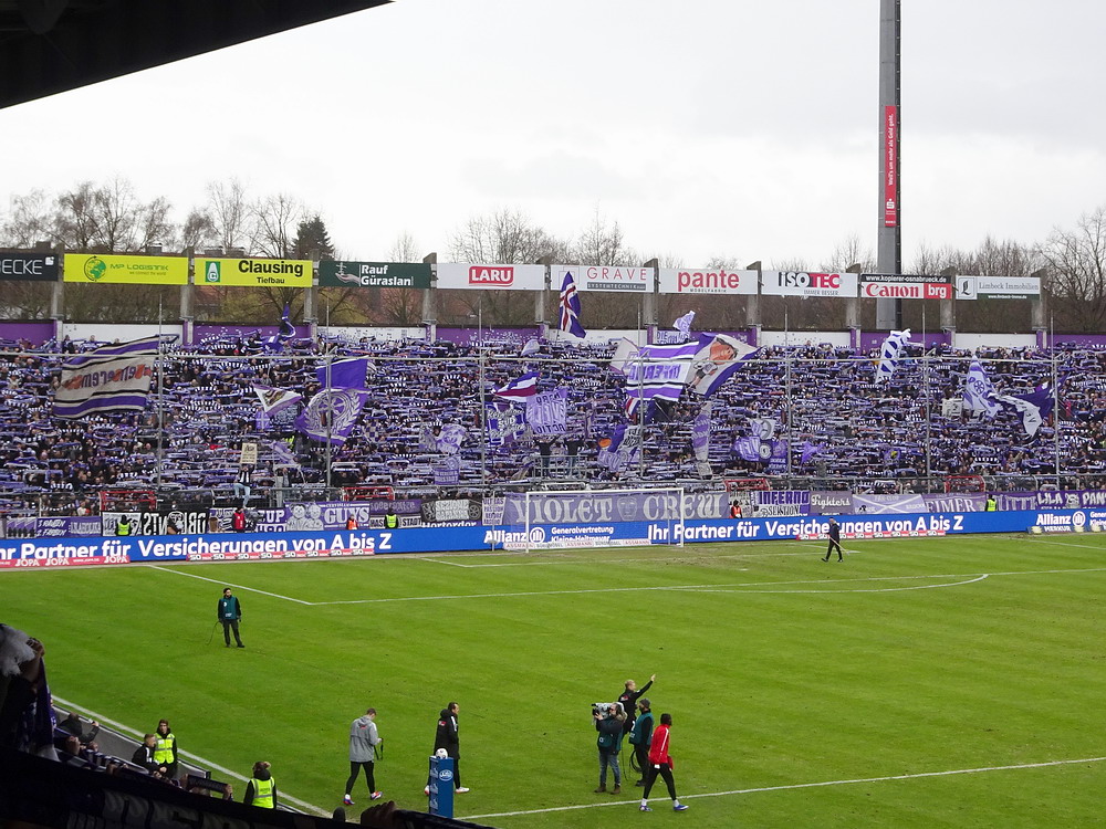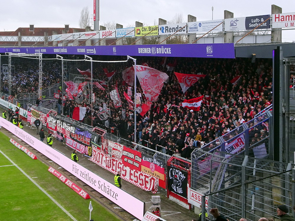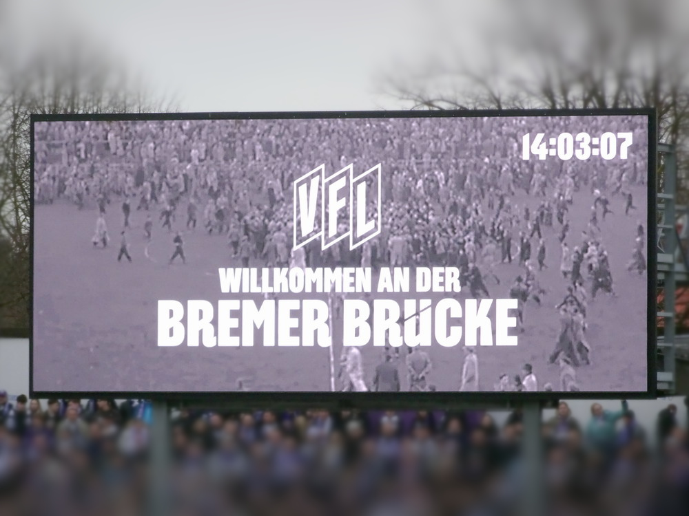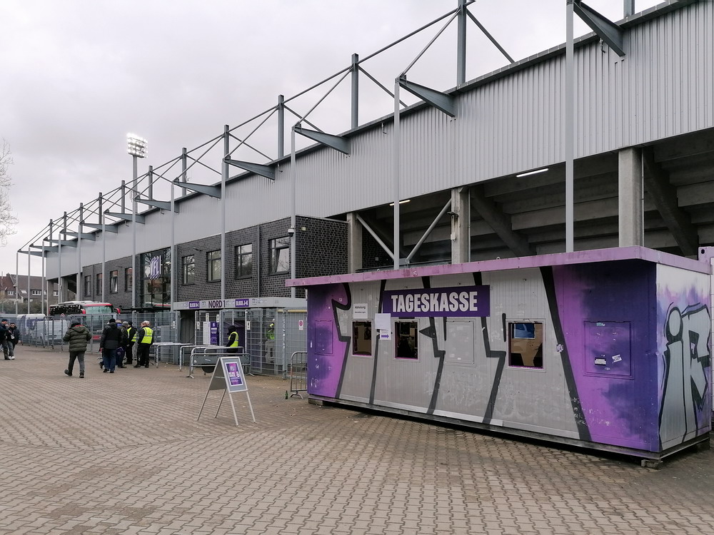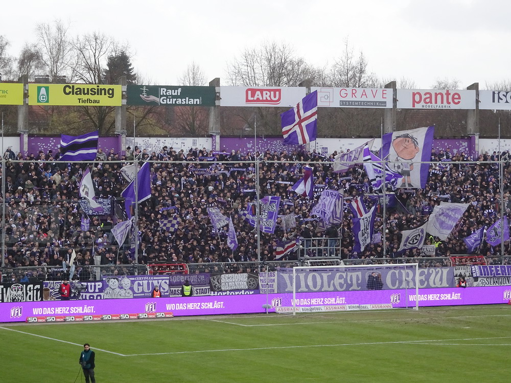Mit dem Spiel in Osnabrück startete der glorreiche RWE in das erste von zwei aufeinanderfolgenden äußerst anspruchsvollen Auswärtsspielen. Für Fußball-Nostalgiker ist das Stadion ‚Bremer Brücke‘ mit seinem Standort mitten im Wohngebiet immer eine Reise wert. Obwohl die alte ungedeckte Stehtribüne auf der Nordseite in der ersten Dekade des neuen Jahrtausends einer modernen überdachten Sitzplatztribüne weichen musste und die Haupttribüne einen VIP-Bereich erhalten hat, konnte die Hütte ihren 80er-Jahre-Charakter erhalten. Allerdings wird das Stadion bald einen umfassenden Umbau erfahren, nach dessen Abschluss keine Tribüne mehr im alten Zustand sein und das Stadion dennoch sein grundlegendes Aussehen behalten wird. Immerhin konnte der Verein einen Neubau verhindern und den traditionellen Standort wahren. Mit 67 Millionen Euro, die sicherlich bedingt durch sich entwickelnde Materialkosten eher größer ausfallen werden, sind die Kosten für einen Umbau üppig. Höchste Zeit wird es jedenfalls. Vor gut zwei Jahren büßte die Ostkurve, Heimat der aktiven VfL-Fans, bereits ihr Dach aufgrund struktureller Schäden ein.