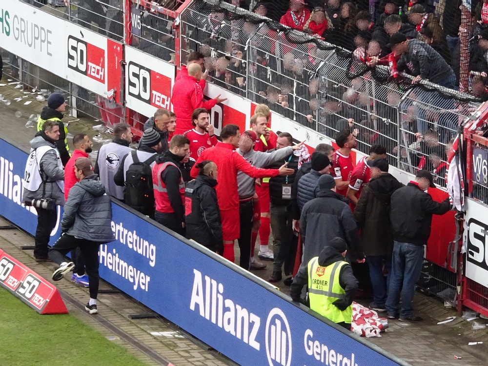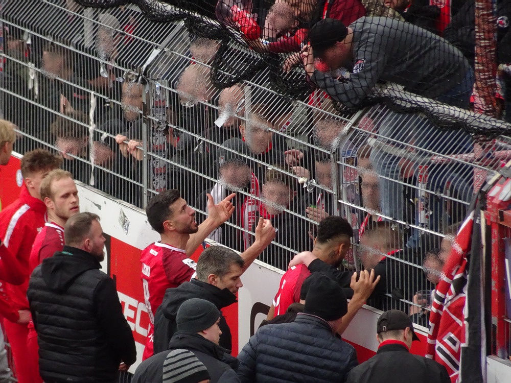 Dass der Ex-Rot-Weisse Pröger in der Nachspielzeit einen typisch verrückten Pröger-Abschluss noch zum finalen Desaster in den Giebel knallte, war dann zu viel des Guten, aber auch nicht mehr wichtig. Dass der Austausch zwischen Fans und Mannschaft nach dem Abpfiff nicht auf meditativer Basis ablief, ist klar. Aber die Führungsspieler positionierten sich gegen das Gepöbel und das auch zurecht.Die Gefahr, dass eine Kluft zwischen Team und Fanszene entsteht, ist spürbar. Kritik ist okay, zumal die letzten Auftritte in der Fremde den kommunizierten Absichten deutlich hinterherhinkten und vor allem die Defensiv-Formation bedenkliche Aussetzer zeigte. Aber unter dem Strich bleibt der RWE die Mannschaft mit den wenigsten Niederlagen in der Liga, es war erst die vierte in der laufenden Spielzeit bei sicherlich zu vielen Remis. Natürlich ist es schade, dass die Roten in den letzten Wochen ständig die Möglichkeit liegenlassen auf die Aufstiegsränge zu springen und dennoch sind diese weiter greifbar. Das Anspruchsdenken im rot-weissen Umfeld ist derzeit einfach überhöht, erst recht, wenn man überlegt, wo der Verein in der jüngeren Vergangenheit herkommt. Das letzte Drittel der Saison beginnt gerade erst und in dieser entscheidenden Phase wird noch genug passieren. Natürlich ist die Mannschaft nun bei der ebenfalls kriselnden Hansa-Kogge irgendwie zum Punkten verdammt, wenn der Anschluss nicht verloren gehen soll, aber ein Missverhältnis zwischen Mannschaft und Fans wird die Chancen sicher nicht verbessern. Es geht nur gemeinsam, wenn das große Ziel erreicht werden soll. Next Stop ‚Ostseestadion‘.