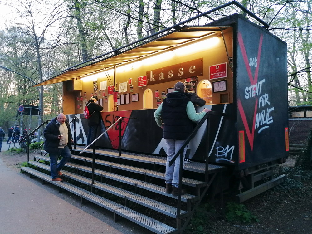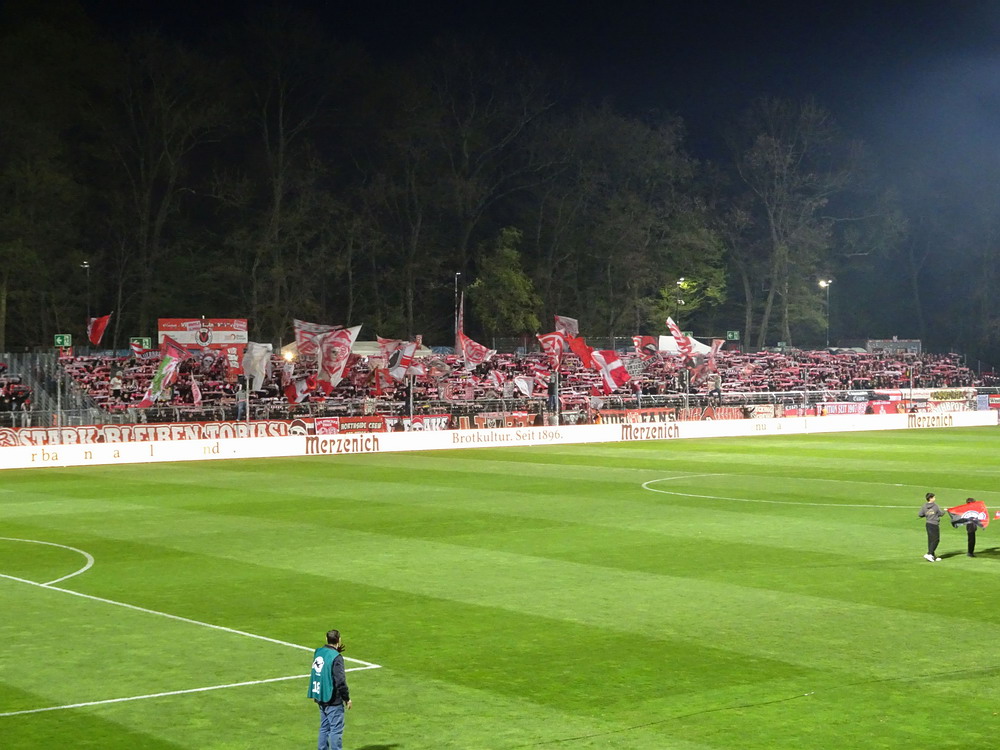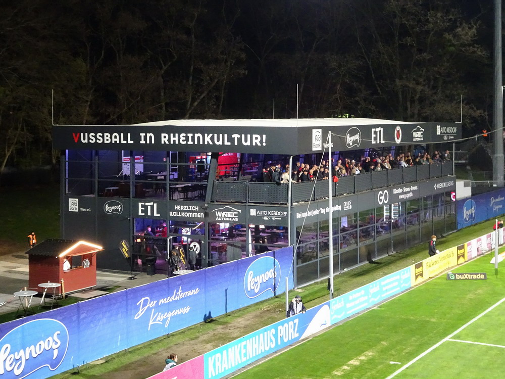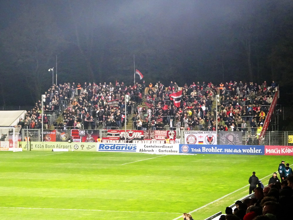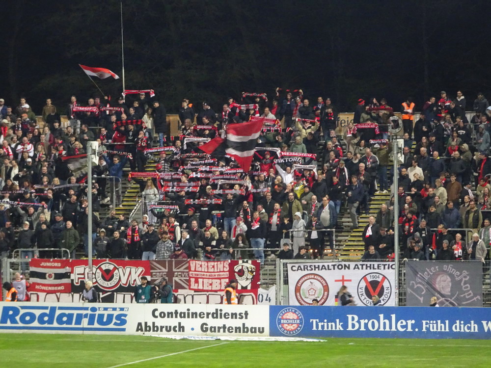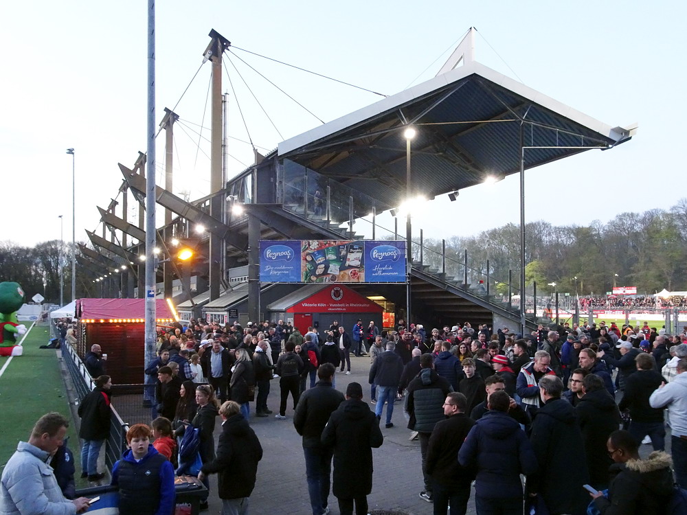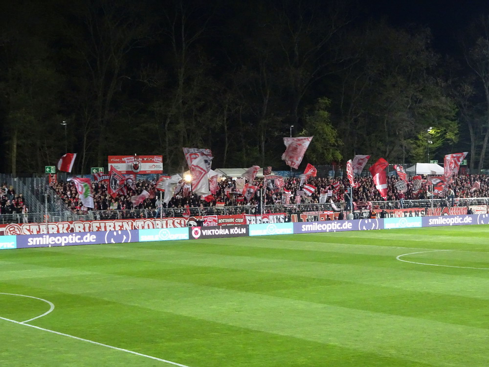 Auch das Auswärtsspiel der Roten auf der Kölner ‚Schäl Sick‘ hatte ich ursprünglich nicht auf der Speisekarte. Ursprünglich wurde dieses Wochenende für den Ausflug mit der buckligen Verwandtschaft sogar gezielt ausgewählt, da mich der Trip zur Viktoria prinzipiell nur nervt. Dem eigentlich einzigen Pro mit der kurzen Anreise standen zwei schwere Kontras entgegen. Zum einen das Stadion, welches einfach nur nervt. Die stattliche Haupttribüne ist noch recht ansehnlich, der Gästebereich dagegen einfach nur unappetitlich, denn die flache auf der alten Bausubstanz ruhende Stehgerade ist kein wirkliches Fundament für gute Stimmung. Der Stahlrohr-Sitzblock für die Gäste wurde in die Ecke gezwängt und auch die winzige, mit bloßem Auge kaum zu erkennende Vikki-Szene kann sich auf ihrem Metallgerüst kaum wohlfühlen. Dazu erinnert der VIP-Bereich hinter dem nördlichen Tor eher äußerlich an ein Billard-Cafe. Zum anderen litt der glorreiche RWE in den letzten Spielen im Stadtteil Höhenberg an chronischer Erfolg- und Torlosigkeit. Seit mehr als 13 Jahren konnte kein dreifacher Punktgewinn erreicht, in den letzten fünf Spielen nicht einmal ein Tor erzielt werden. Überhaupt war keine Torflut zu erwarten, in den zehn Spielen seit dem letzten RWE-Sieg im rechtsrheinischen Köln fielen gerade einmal genauso viele Tore, in den letzten fünf Partien gar nur deren zwei. Die späte Anstoßzeit, die eben nach Rückkehr aus Niedersachen die Option öffnete, und der aktuelle Erfolgslauf animierten mich dann doch anzureisen und dem Gesetz der Niederlagen-Serie nach musste ja auch diese irgendwann mal reißen.