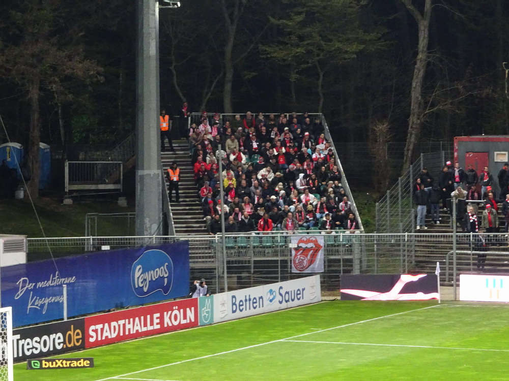 Nach unsäglichen durch die Presse angefeuerten Diskussionen, dass es nicht gelingt, in Essen eine Aufstiegseuphorie zu entfachen und nicht alle verfügbaren Gäste-Tickets im Vorfeld des Spiels vergriffen waren, befanden sich unter den sechseinhalbtausend letztlich doch an die 4.000 aus der Ruhr-Metropole. Davon mindestens ein Drittel auf der Haupttribüne, die einfach eine bessere Sicht auf das Geschehen und als einzige Tribüne einen Wetterschutz bietet, auch wenn letzteres heute zu vernachlässigen war. Nach drei Siegen reiste der RWE mit breiter Brust an. Alonso präsentierte dann aber direkt mal wieder einen seiner seltenen aber immer wieder mal auftretenden Aussetzer, zum Glück folgenlos. Der sonst insgesamt wieder starke Verteidiger legte einem Kölner Stürmer die Murmel nach vier Minuten in den Lauf, dieser war aber von dieser Großzügigkeit dermaßen übermannt, dass er das Spielgerät über das Tor drosch. Dann nahmen die Roten Fahrt auf. Nach zehn Minuten eroberte Alonso im Mittelfeld vom Gegner den Ball, dieser gelangte zu Müsel, der wiederum auf Mizuta durchsteckte. Der quirlige Japaner legte nach rechts auf den mitgelaufenen Abiama ab, welcher kompromisslos abschloss und die Murmel ins rot-weisse Glück beförderte. Auch die nächste Situation ging über Müsel, der einen herrlichen Diagonalpass auf Abiama schlug, der eine lang und länger werdende Flanke auf den zweiten Pfosten servierte, wo der einlaufende Brumme nur wenig mehr als eine Minute nach dem ersten Treffer direkt erhöhte.