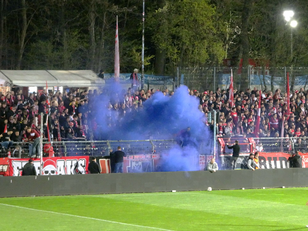 Doppelschlag, es lief also. Etwas zu gut, denn die Psychologie der Führung ermunterte die Roten, den Fuß vom Gas zu nehmen. Die Gastgeber wurden etwas agiler, kamen aber nur zu einem gefährlichen Abschluss nach einer halben Stunde, als sich Golz strecken musste, um einen Kopfball zu entschärfen. Ansonsten verwaltete der RWE die Führung unaufgeregt und Abiama hätte den Sack mit dem Pausenpfiff eigentlich schon zuschnüren können. Völlig unnötig kam die Viktoria dann nur fünf Minuten nach Wiederanpfiff zum Anschluss. Nach einer Freistoßflanke pingpongte die Murmel durch den Sechzehner und Alonsos Klärungsversuch kurz vor der Torlinie fand nur noch ins eigene Netz. Kein guter Tag für den Leistungsträger, der auch noch seine fünfte gelbe Karte sah und dadurch im Derby gegen Meiderich fehlen wird. Danach passierte erst einmal nicht viel, wenn man von einer blauen Rauchdose absieht, welche die MSV-Szene wohl vorher schon mal als Derby-Gruß im Away-Sektor versteckt hatte und die nun von ein paar ‚Terroristen‘ von draußen ferngezündet wurde. Zwanzig Minuten vor dem Ende zündete langsam auch die Viktoria und bereitete der RWE-Defensive ordentlich Beschäftigung. Diese löste die gestellten Aufgaben aber fast fehlerfrei und da die eigenen Konterchancen mal wieder desaströs gespielt wurden, blieb es beim knappen Auswärtssieg und der glorreiche RWE grüßt zum allerersten Mal seit dem Aufstieg in die Dritte Liga von einem direkten Aufstiegsplatz.