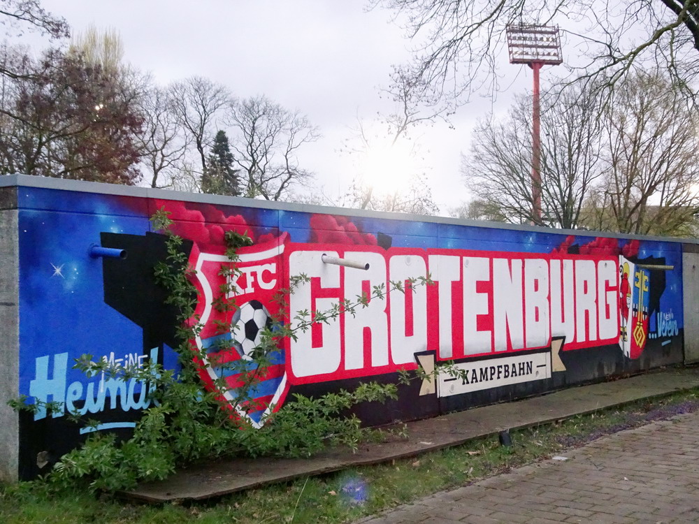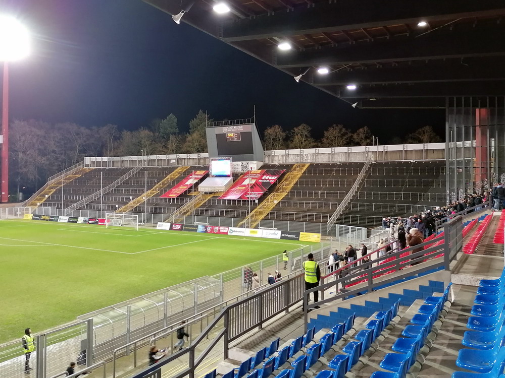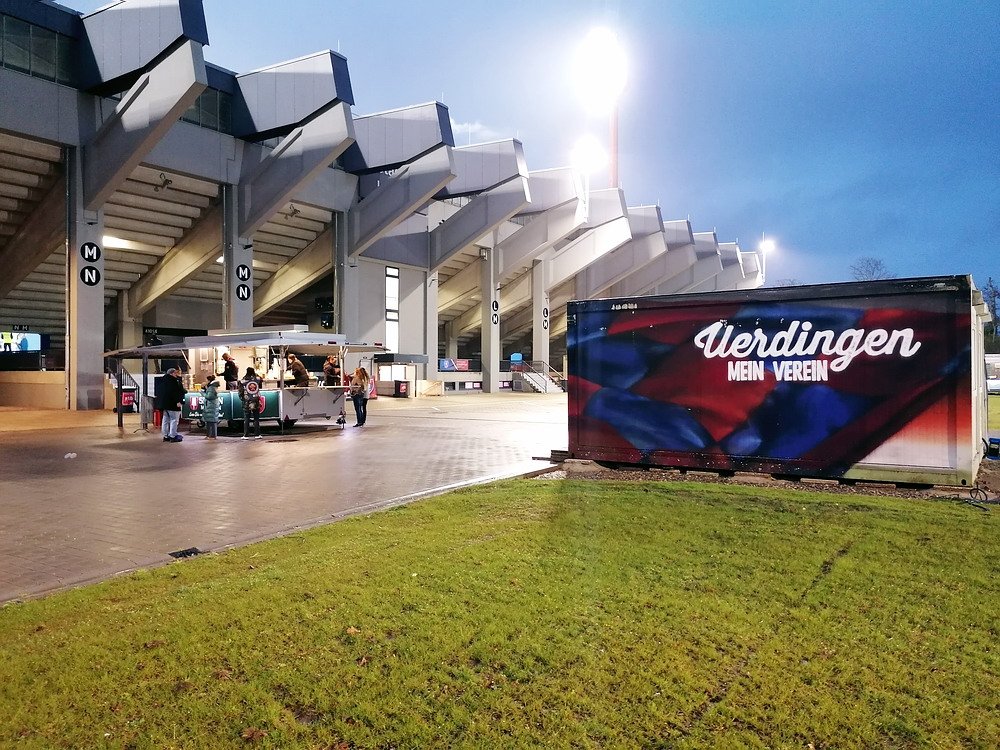 Wenn der Verein, bei dem man selber aktiv war, in einem so geschichtsträchtigen Brett von Stadion antreten darf, ist die Anreise ja quasi Pflicht. Vor nur wenigen Tagen mehr als genau 40 Jahren nahm an dieser Stelle das ‚Wunder von der Grotenburg‘ seinen Lauf, als Verein noch unter dem Namen Bayer 05 nach einer 0:2-Hinspiel-Niederlage und einem 1:3-Halbzeitrückstand gegen Dynamo Dresden im Viertelfinale des europäischen Pokalsieger-Wettbewerbs in der zweiten Spielhälfte noch unglaubliche sechs Treffer erzielte und das Halbfinale buchte. Ich persönlich habe dort auch mal Mario Basler für Rot-Weiss Essen in einem DFB-Pokal-Spiel treffen sehen. Verdammt lange her. Die schillernden Zeiten unterm Bayer-Kreuz sind auch schon in den Chroniken verschwunden. In den letzten Jahren ist der Bayer-Rechtsnachfolger KFC 05 zur absoluten Skandal-Nudel verkommen. Fünf Insolvenzen in 20 Jahren und diverse fragwürde Vorstands- und Sponsoringgeschichten trüben das Erbe des eigentlich stolzen Vereins. Geld ist natürlich trotz großer Versprechen vermeintlicher Gönner auch nie vorhanden und so ist selbst die Eintrittskarte nur ein trauriger Schwarz-Weiss-Druck.